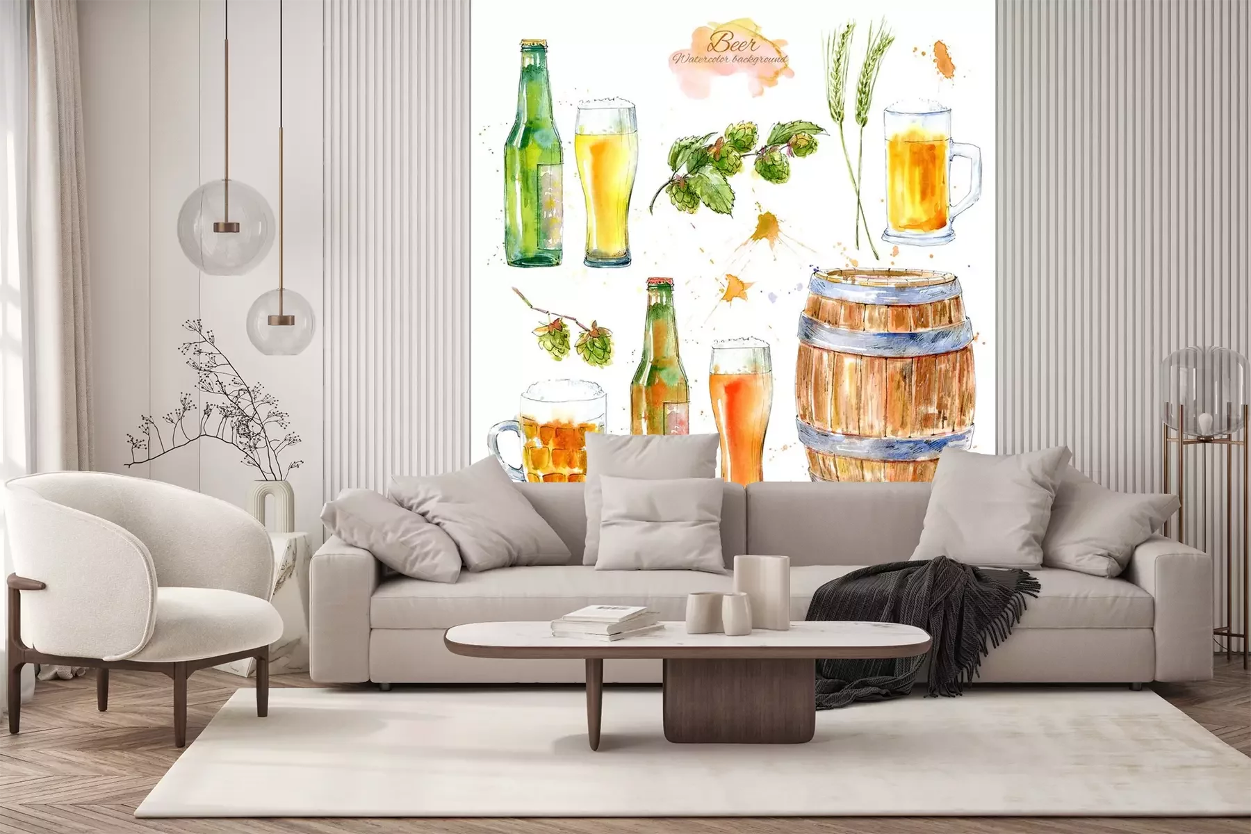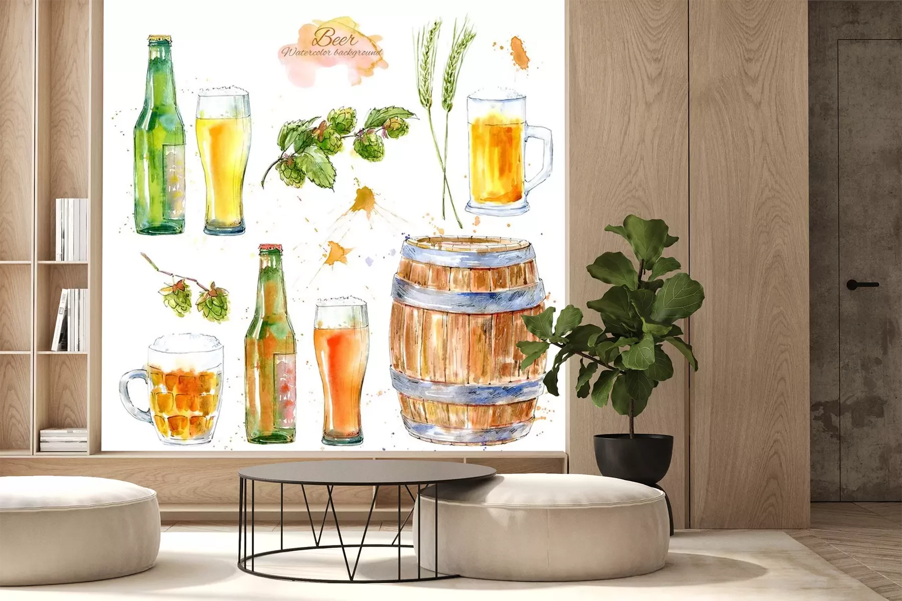 Sticker  Ensemble d'un verre de bière, bouteille, orge, malt et houblon. Image d'une boisson alcoolisée. Aquarelle illustration dessinée à la main. Fond blanc.