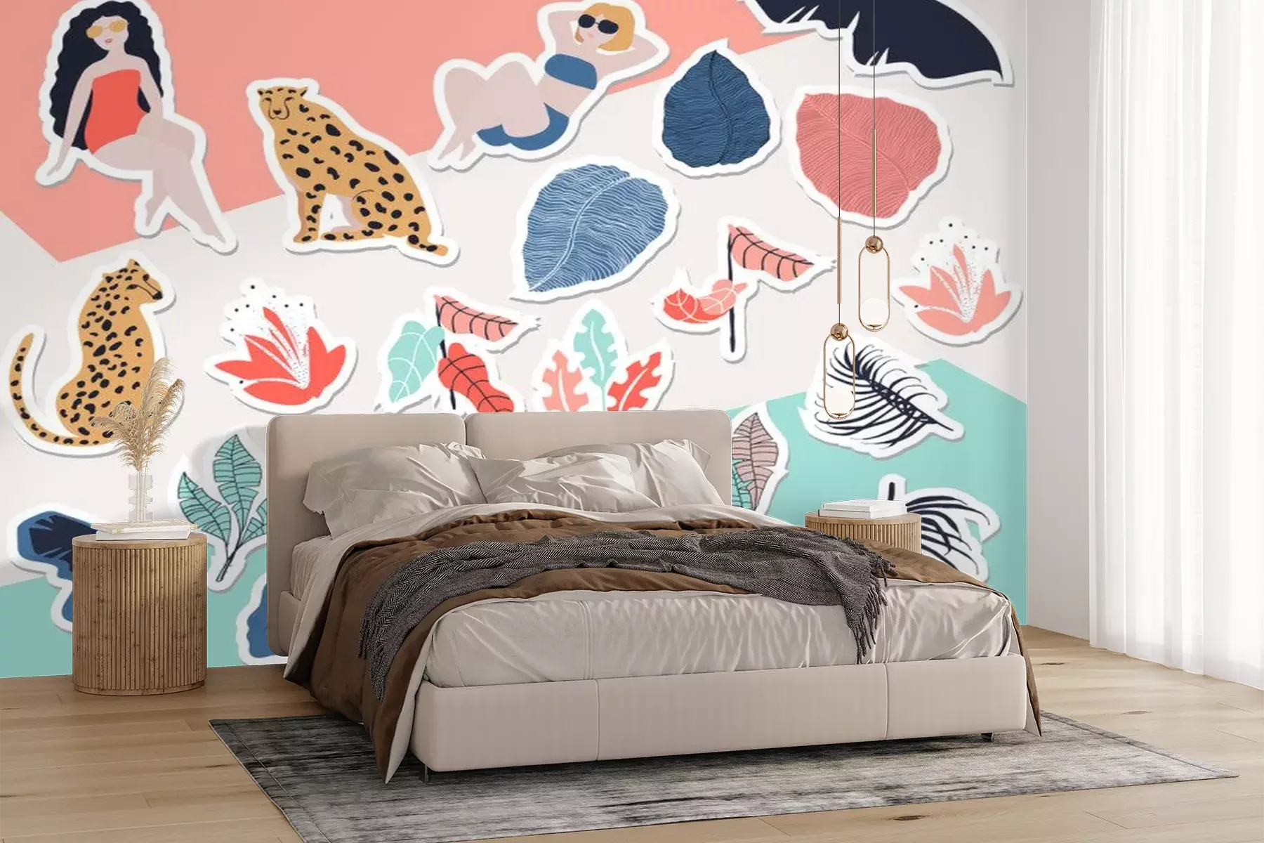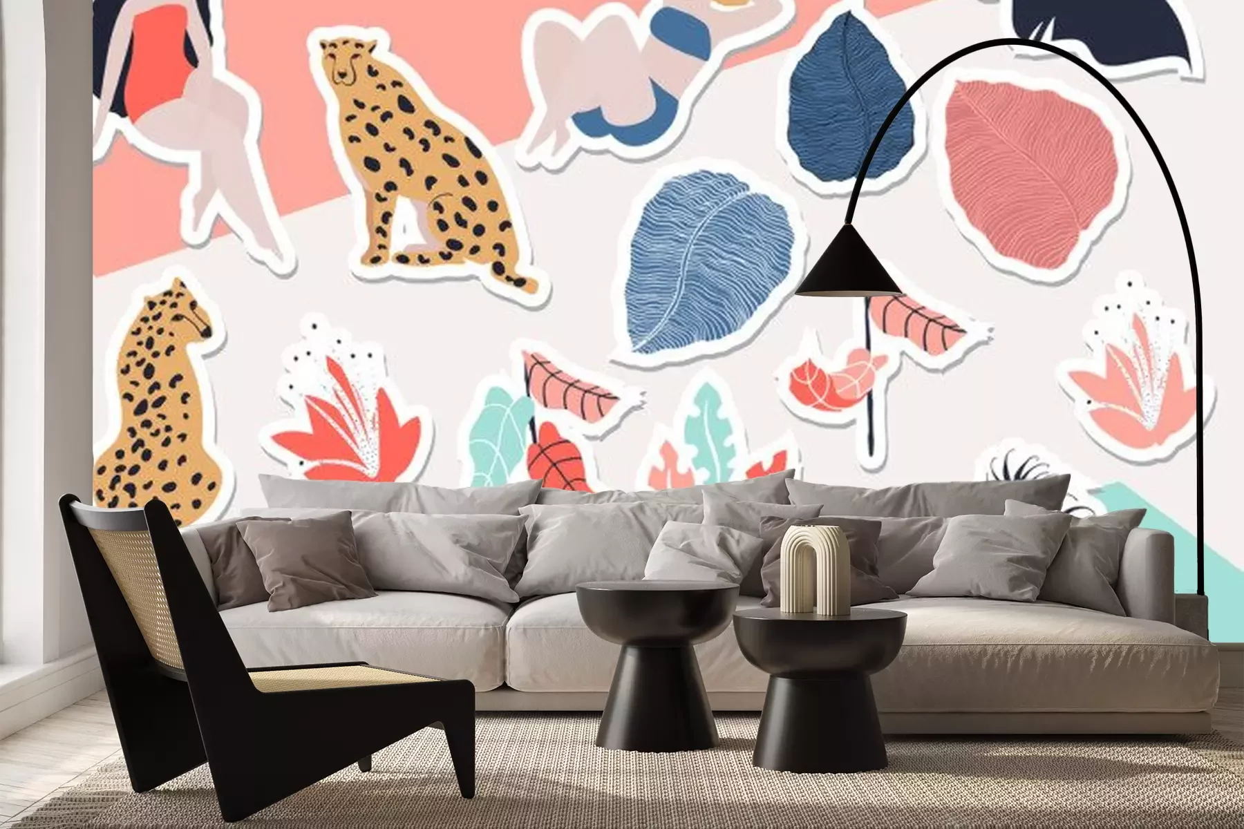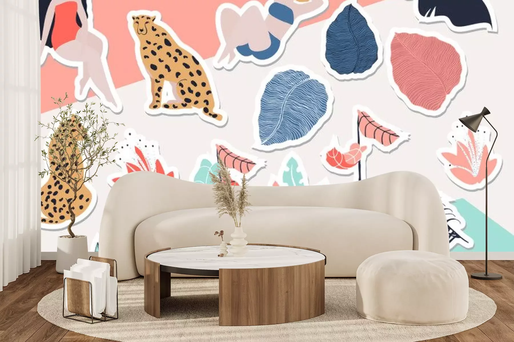 Sticker  Filles tropicales avec collection d'autocollants Cheetah. Paradis estival dans les jungles tropicales avec un animal sauvage, une belle fille et des fleurs fantastiques.