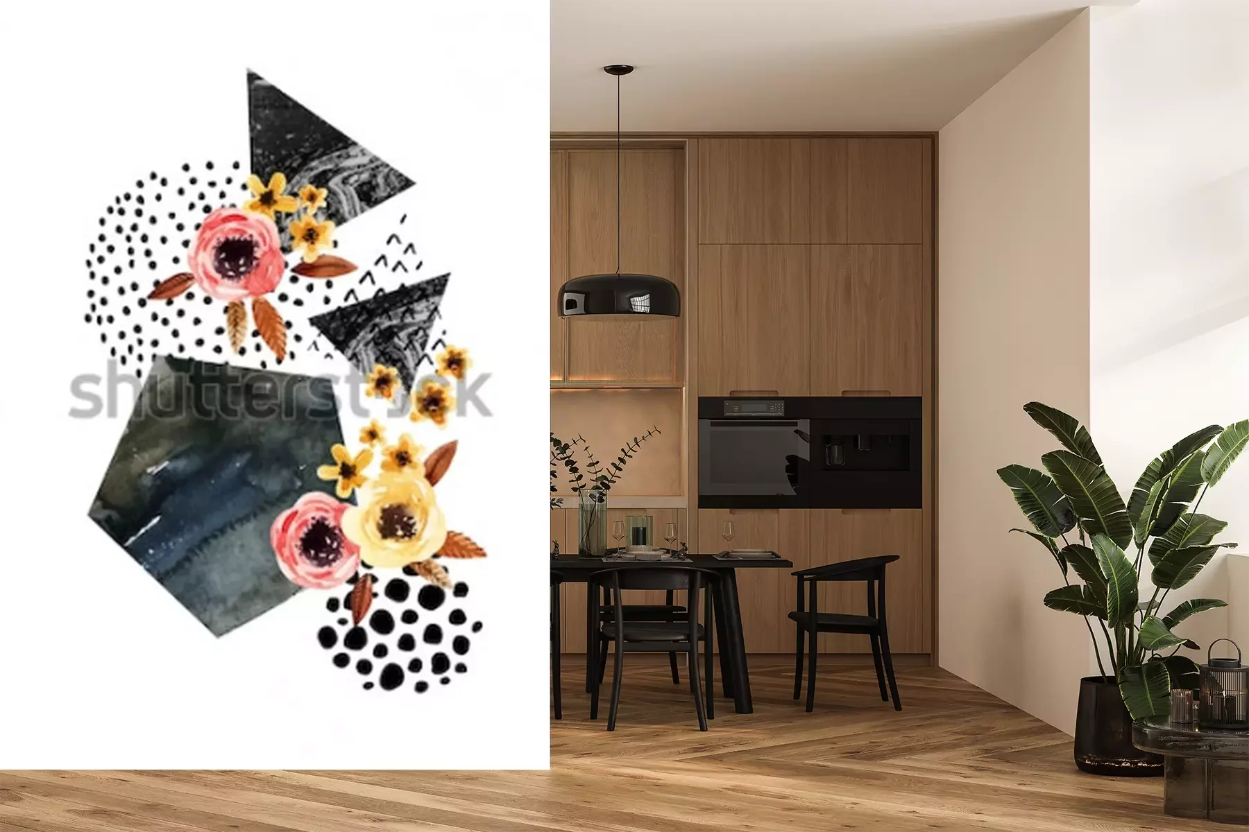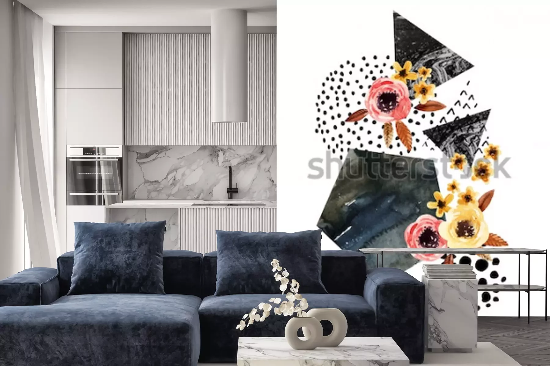 Sticker  Fond d'automne: feuilles tombantes, fleurs, éléments géométriques. Illustration aquarelle avec feuille, triangles, marbre, couleur de l'eau, textures de dessin à main levée pour la conception