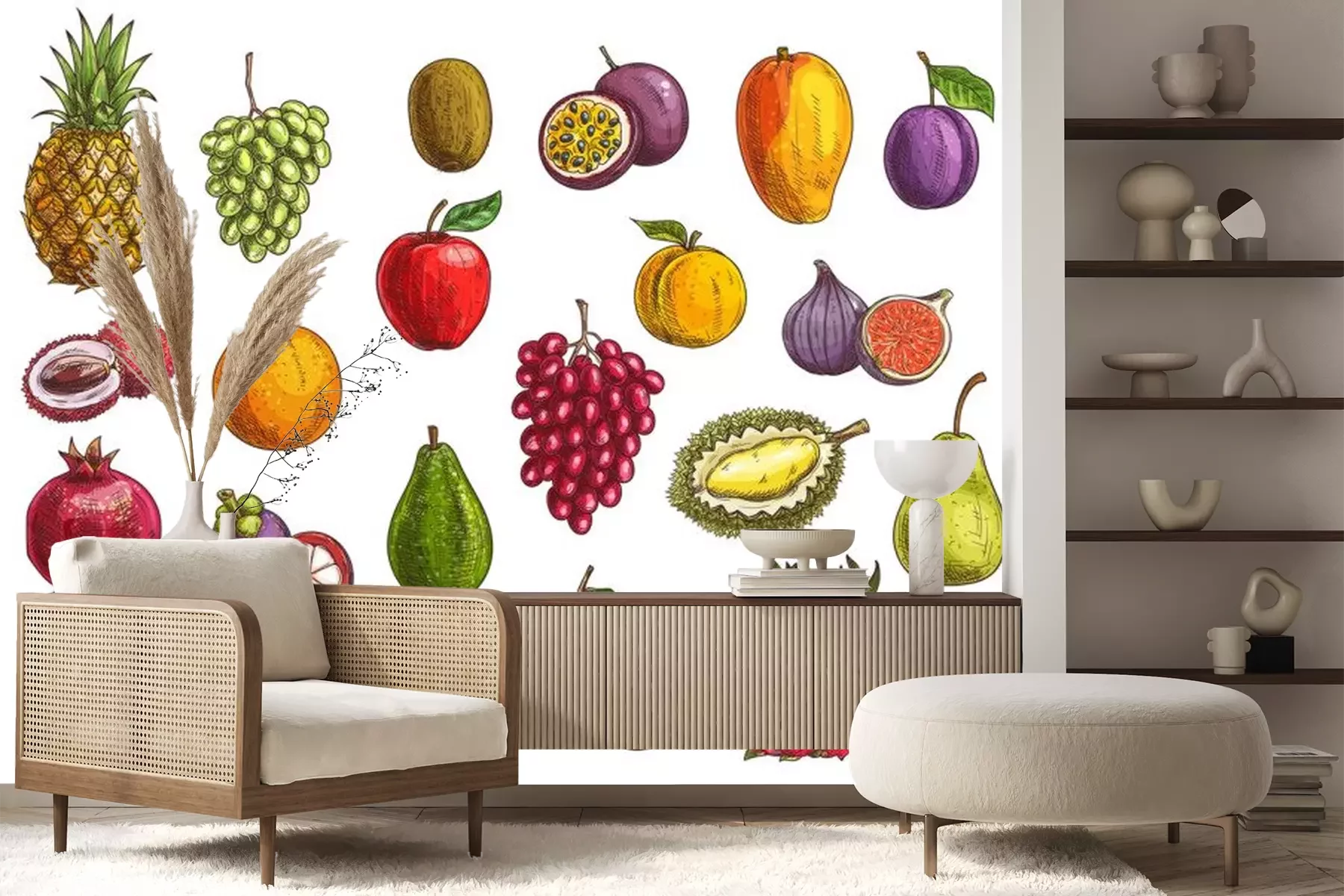 Sticker  Fruit and berry vector sketches with isolated exotic and garden food. Mango, papaya, grapes and apple, orange, pear, plum and durian, peach, fig, kiwi and avocado, carambola, feijoa and mangosteen