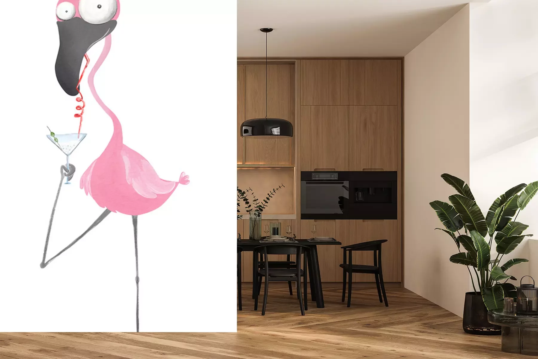Sticker  Funny flamingo with cocktail. Hand drawn illustration