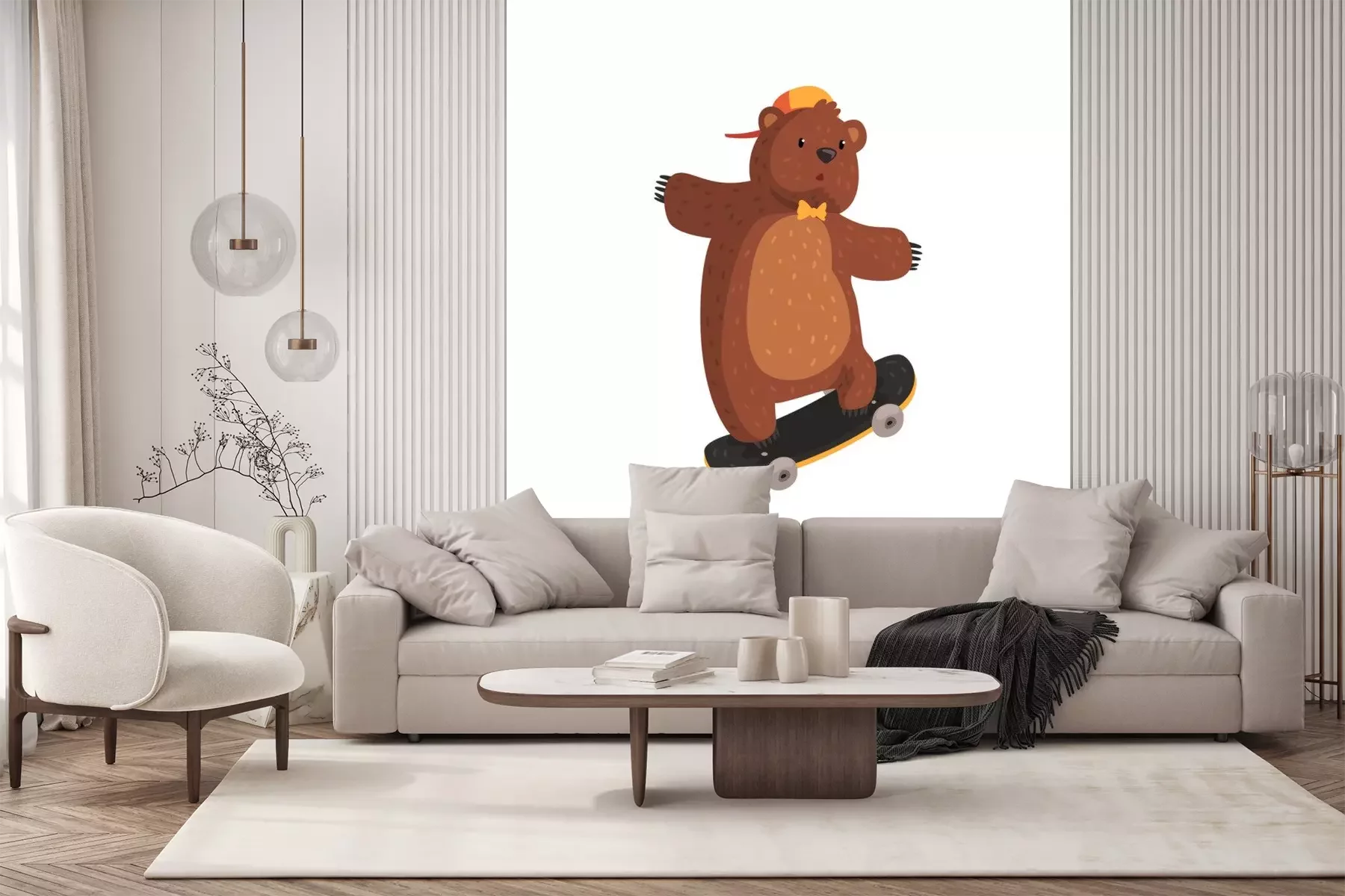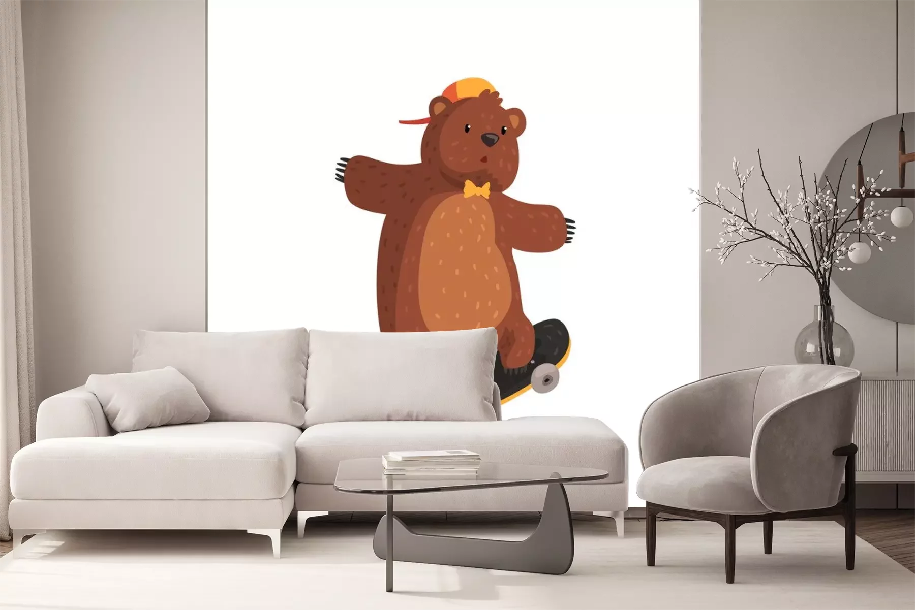 Sticker  Funny teen bear en chapeau orange et noeud papillon faisant trick kickflip sur skateboard. Sport extrême. Animal sauvage de dessin animé avec fourrure brune, petites oreilles et pattes avec des griffe