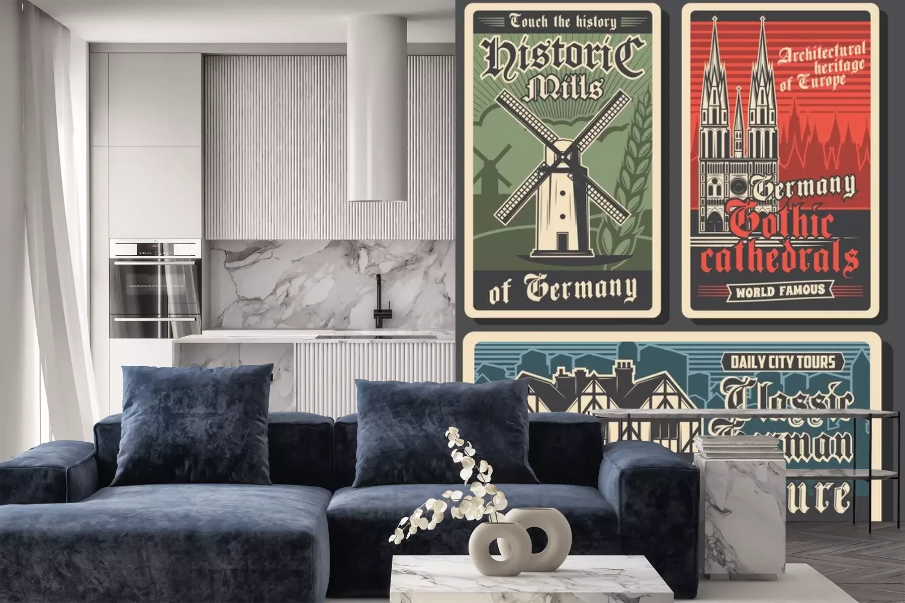 Sticker  Germany travel retro posters, German landmarks and Berlin city buildings, culture and tourism, vector. German Gothic architecture, castles, cathedrals and historic mills, Europe travel destinations