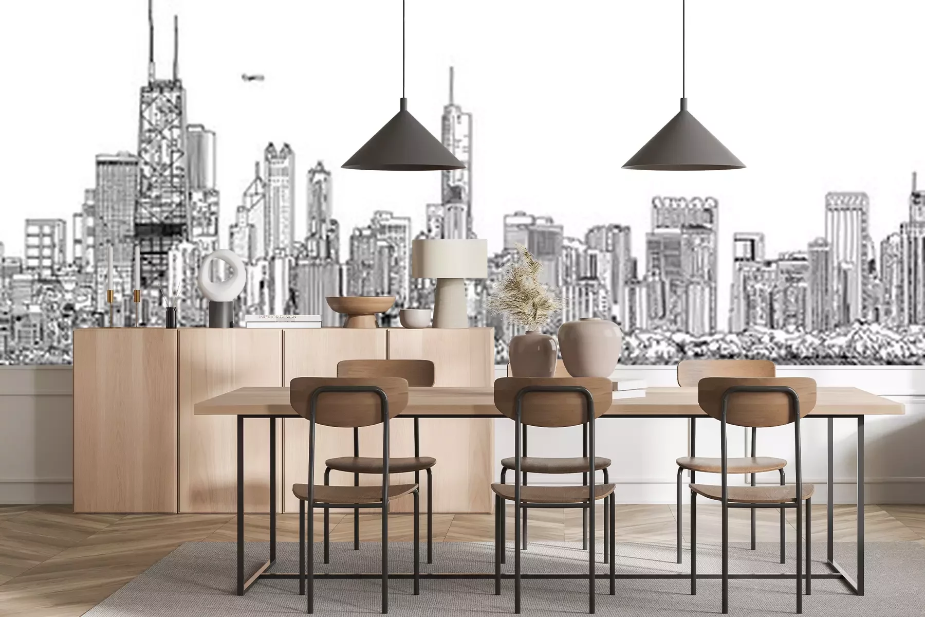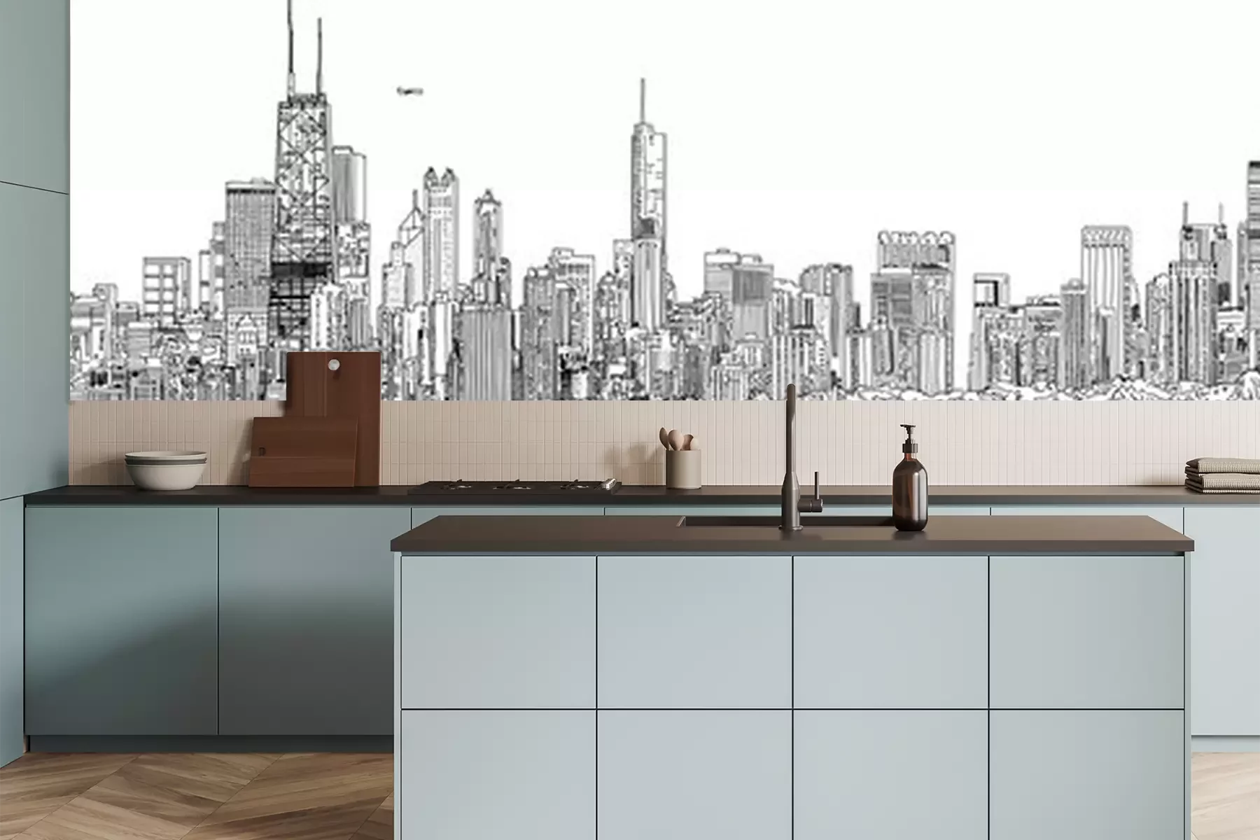 Sticker  Hand drawn illustration. Panorama of the Chicago skyline. Detailed ink look and feel. Black and white.