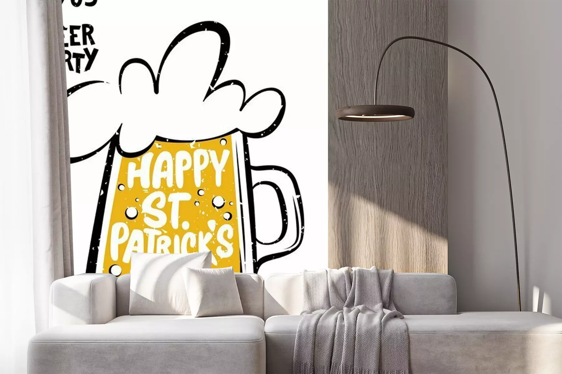 Sticker  Happy St. Patrick's Day greeting. Lettering happy St. Patrick's Day inscribed in a beer. Beer party. Illustration of a beer mug.