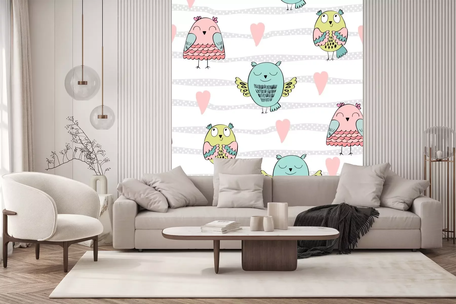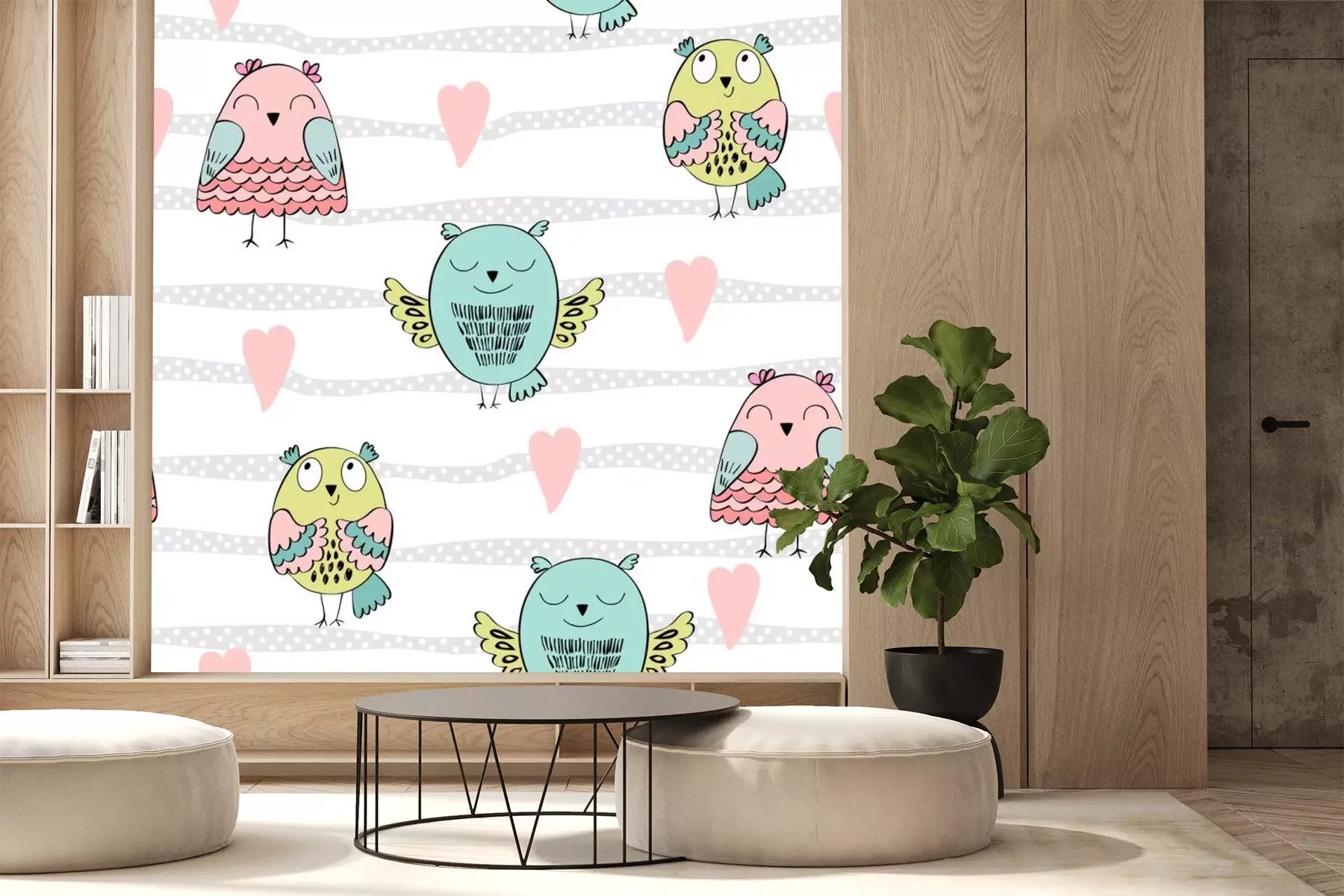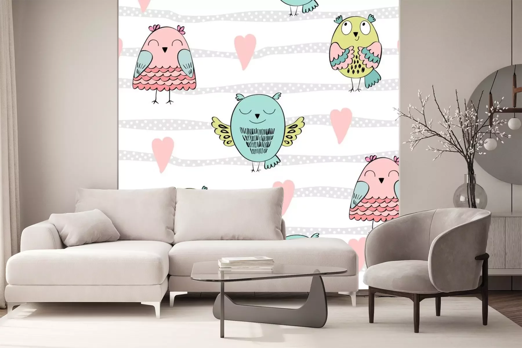Hiboux contents et fleursPapier peint à motif