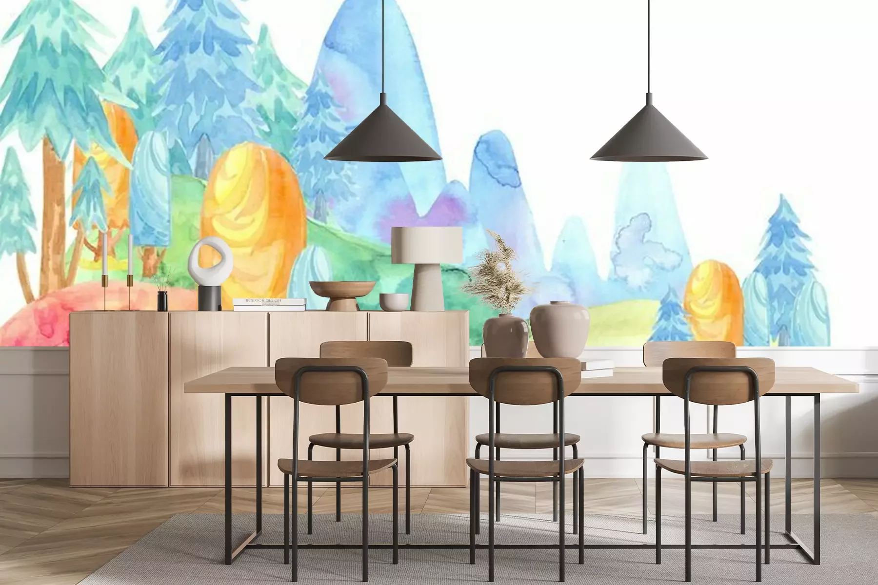 Sticker  Illustration aquarelle de dessin animé. Nature de conte de fées mignonne. Forêt de sapins colorés, arbres, montagnes. modèle de carte