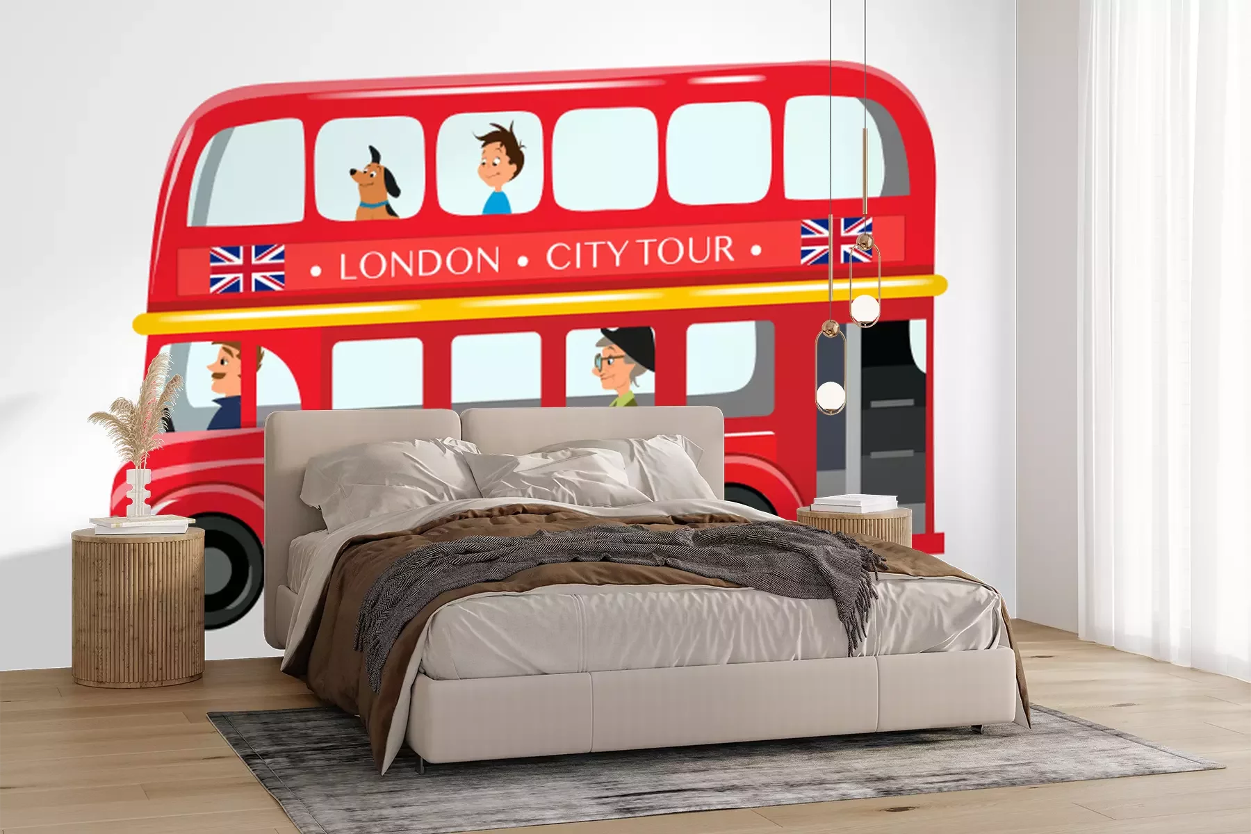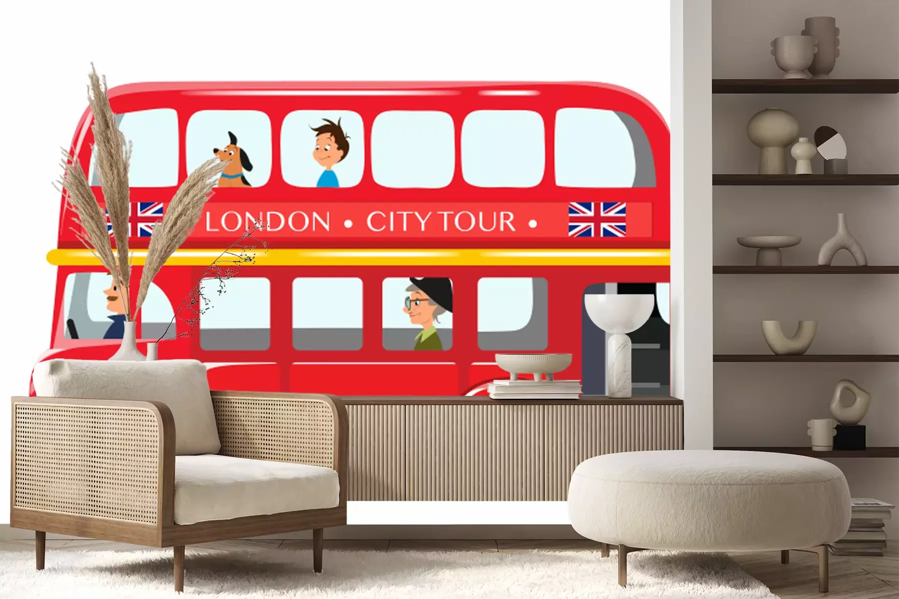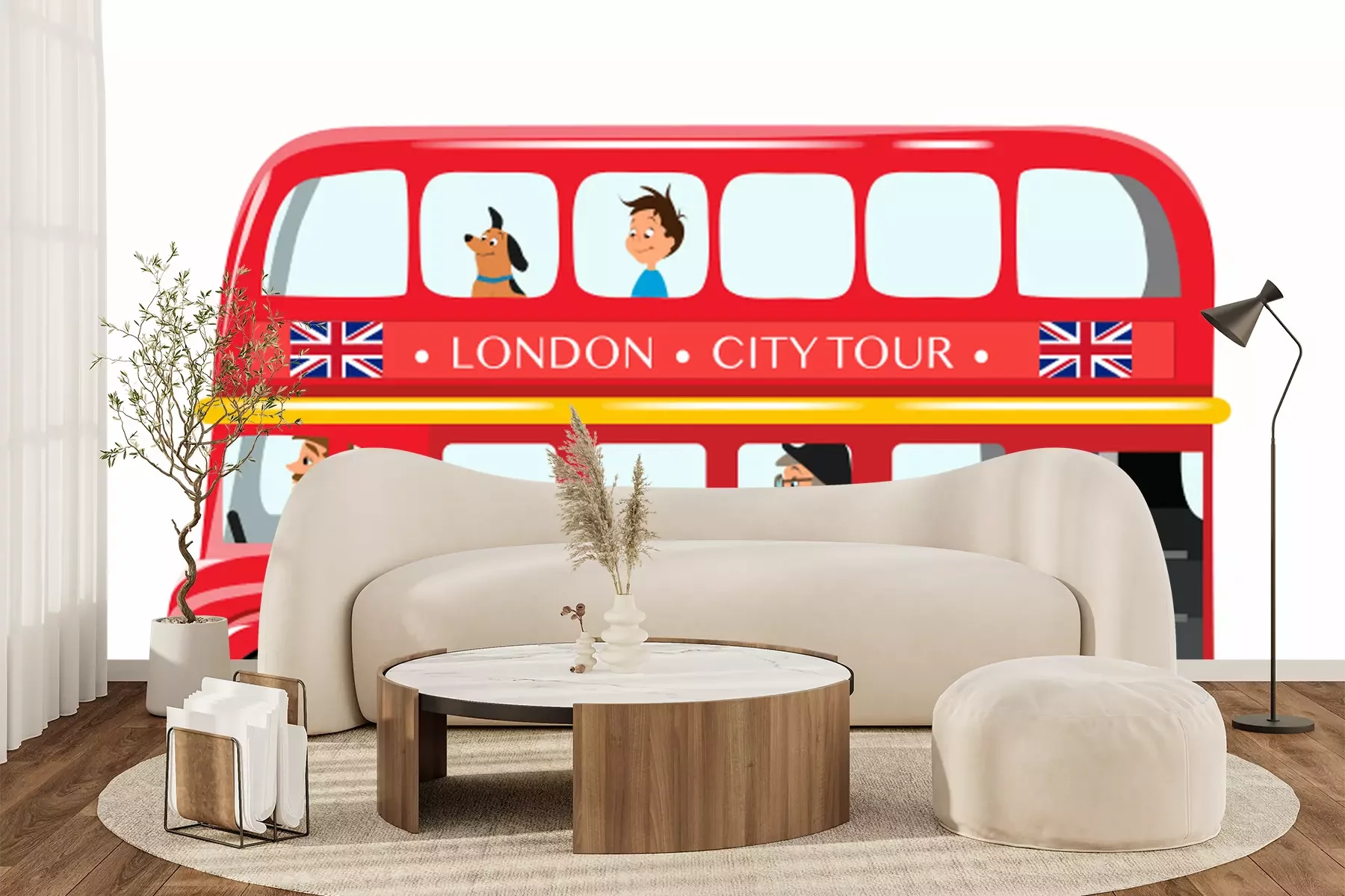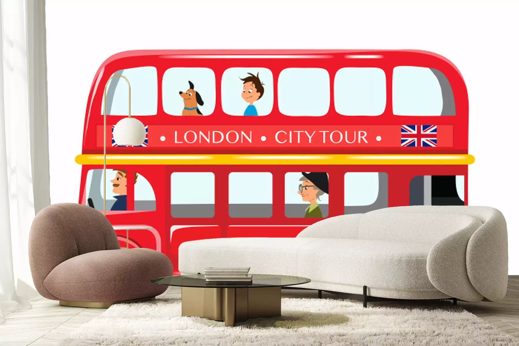 Sticker  Illustration vectorielle isolée sur fond blanc Style plat anglais, vue de côté, autobus rouge à deux étages, rouge. Élément infographique, site Web, icône, cartes postales, place pour le texte. Person