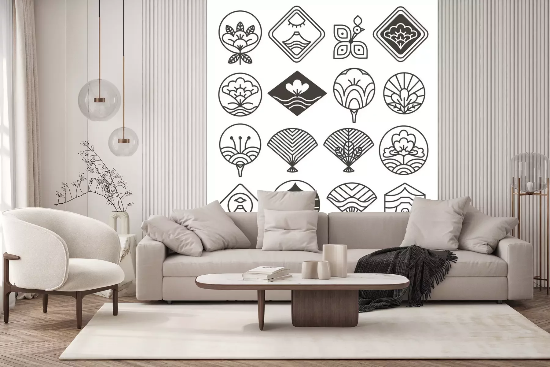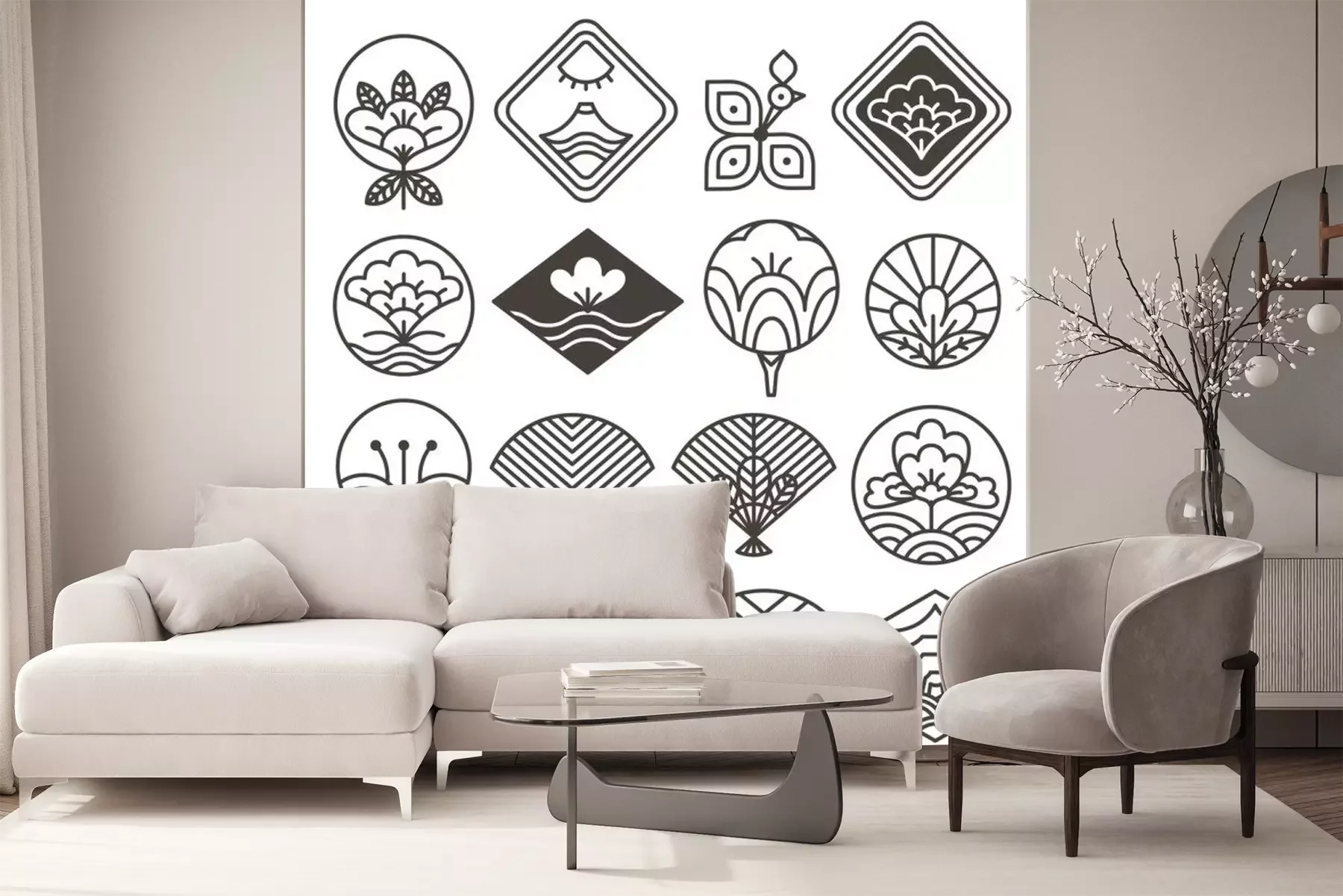 Sticker  Japanese Monochrome Icons Set with Ethnic Motifs