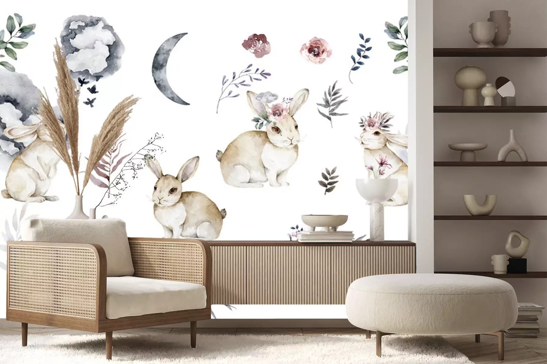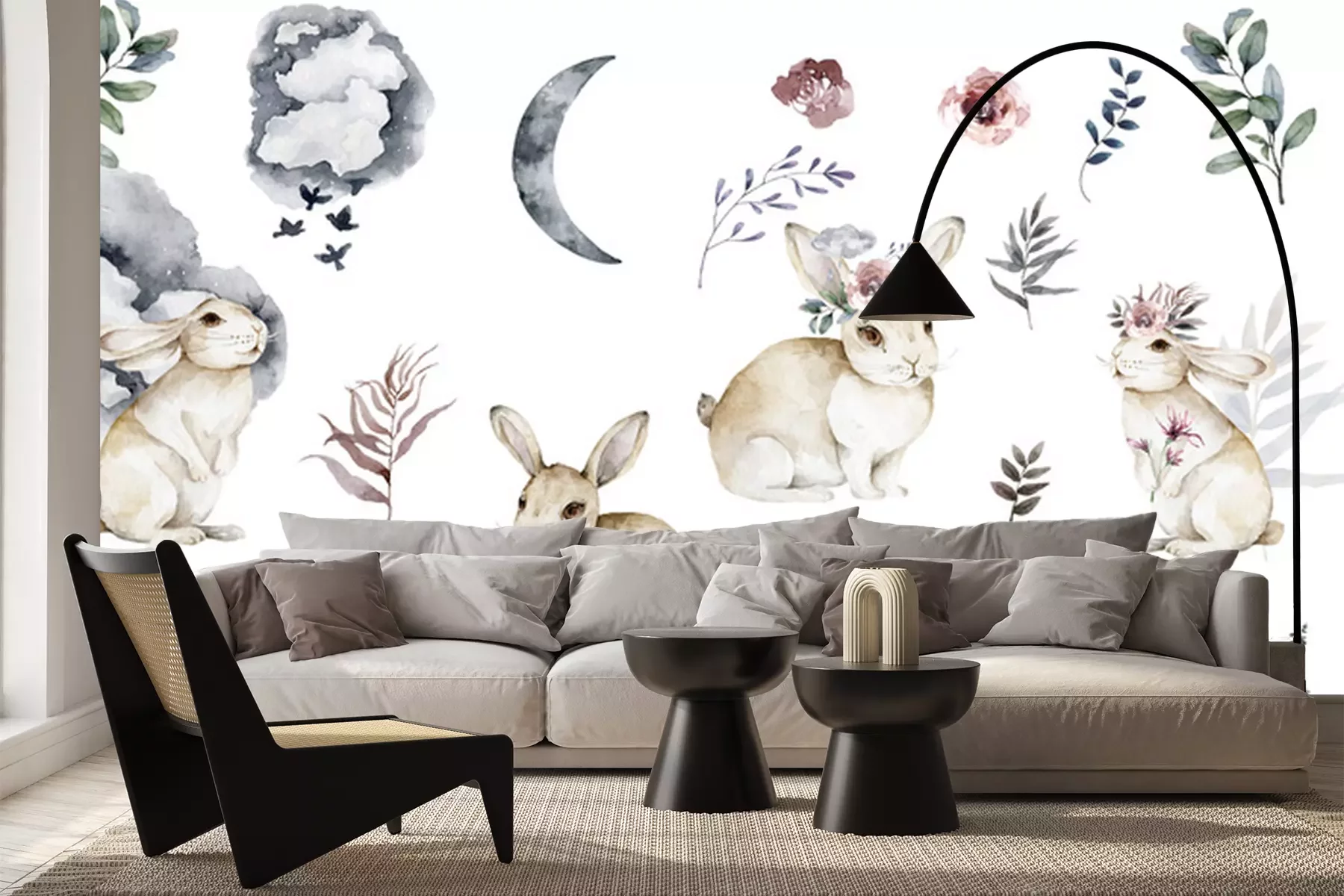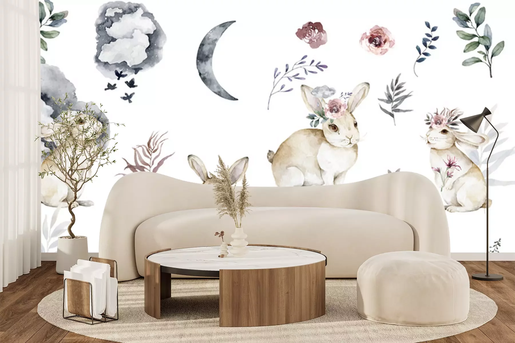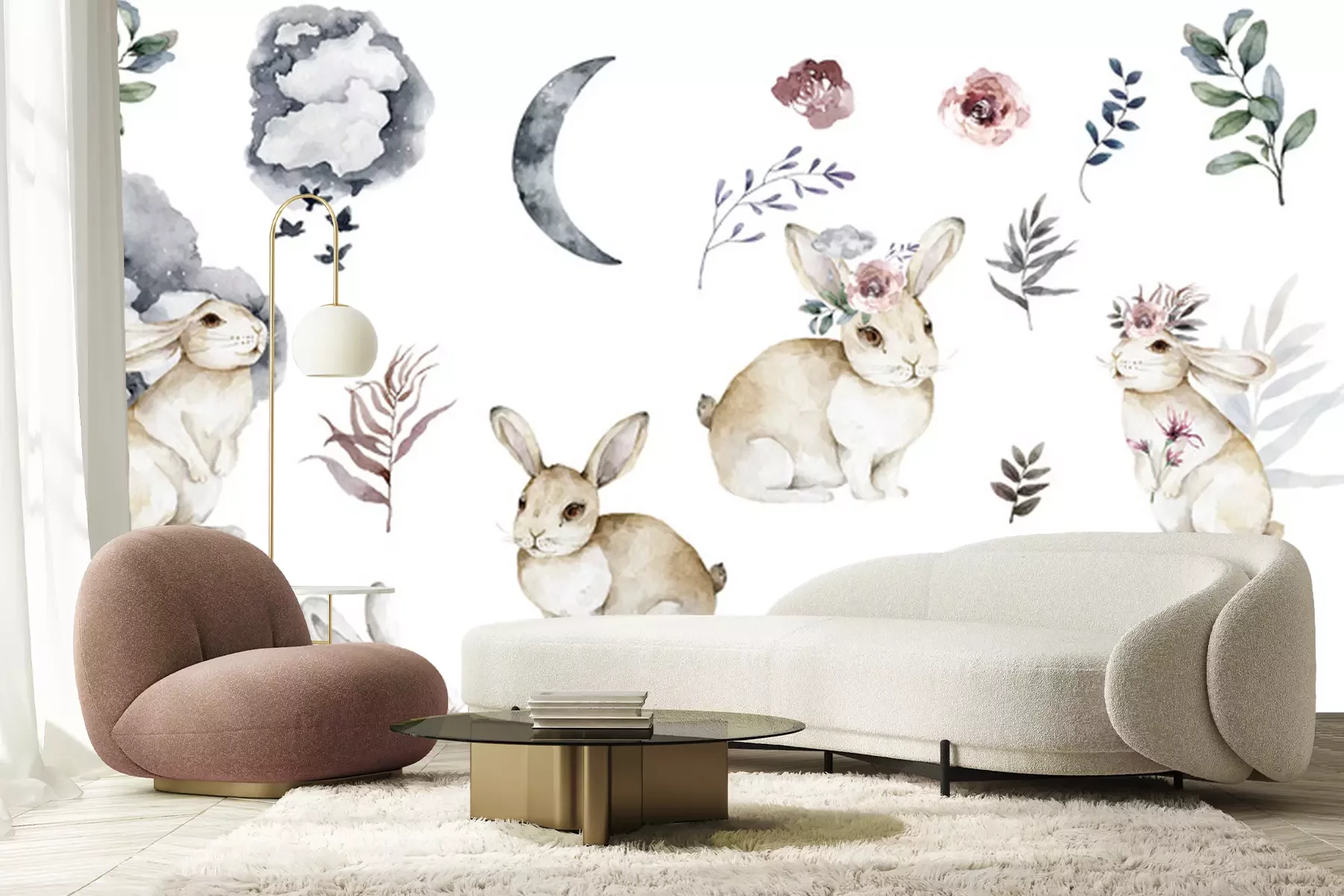 Sticker  Lapins et plantes aquarellés sur un fond blanc