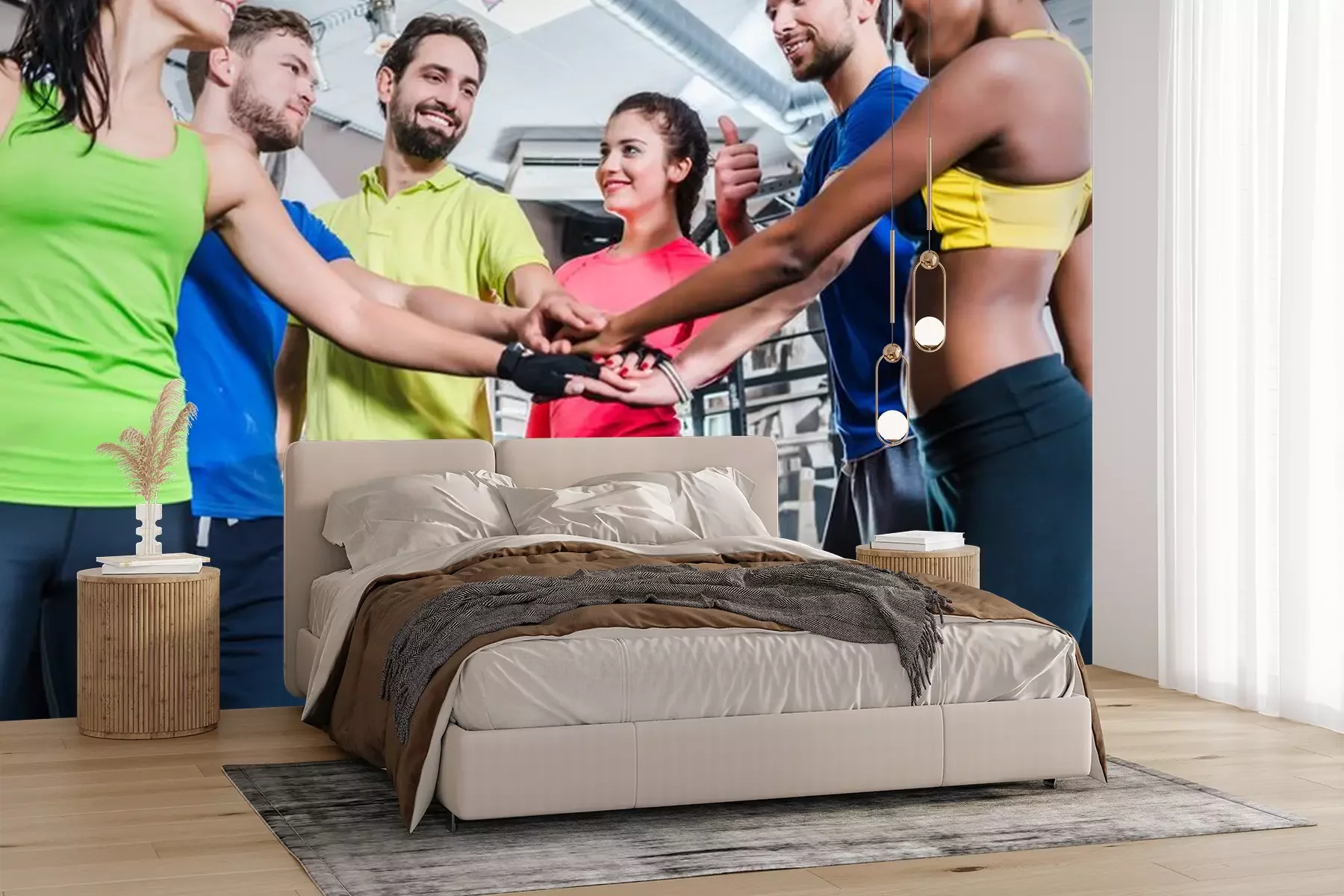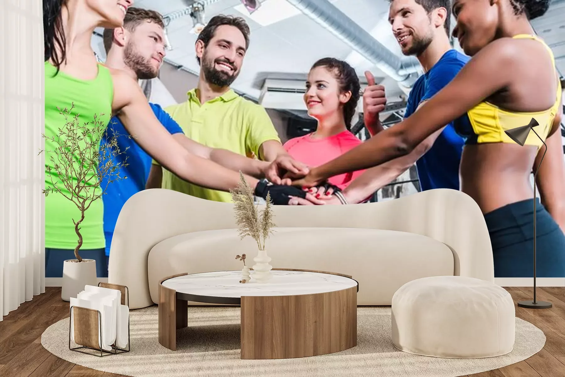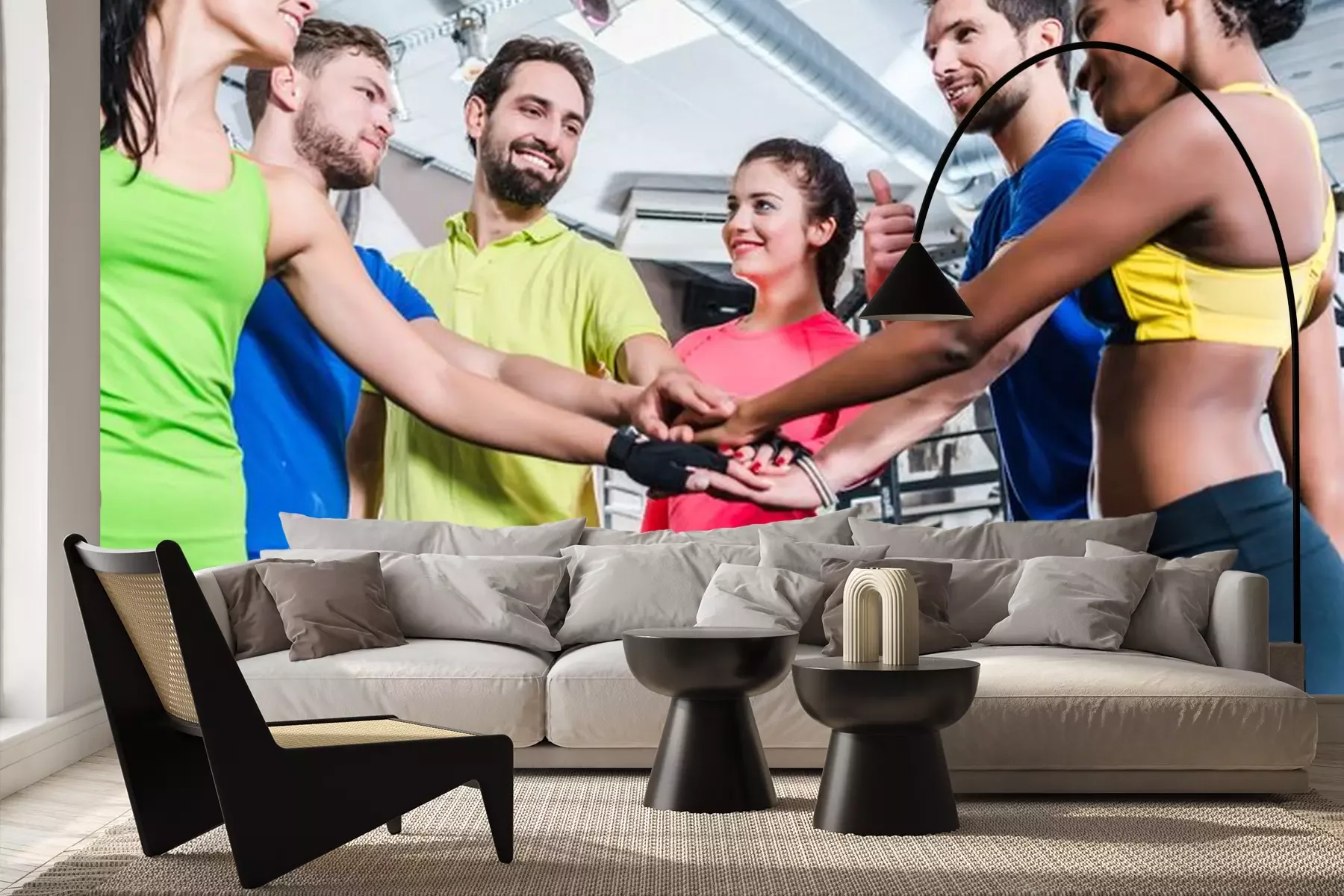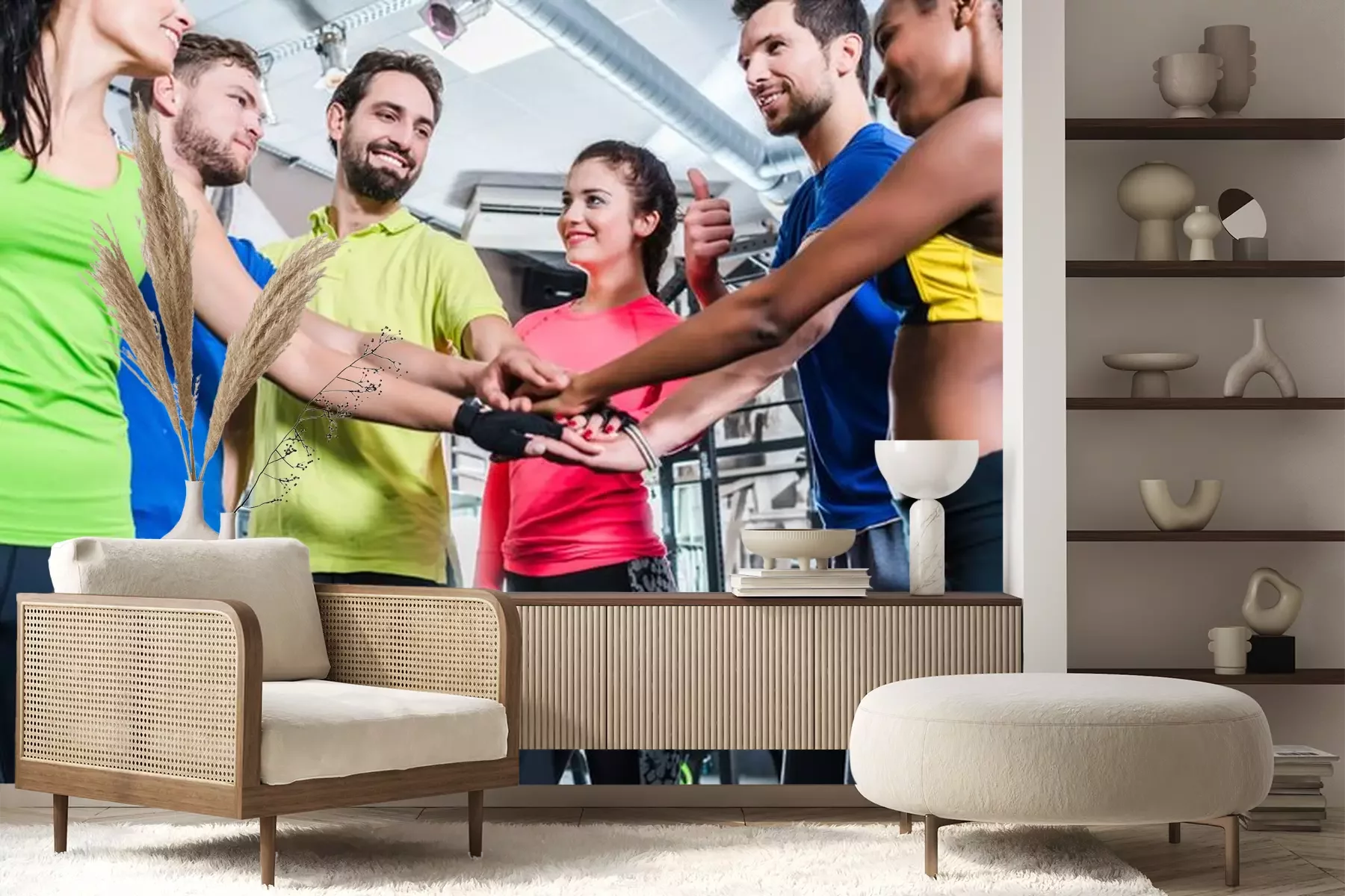 Sticker  Les femmes et les hommes sont motivés pour marcher et courir et empiler les mains