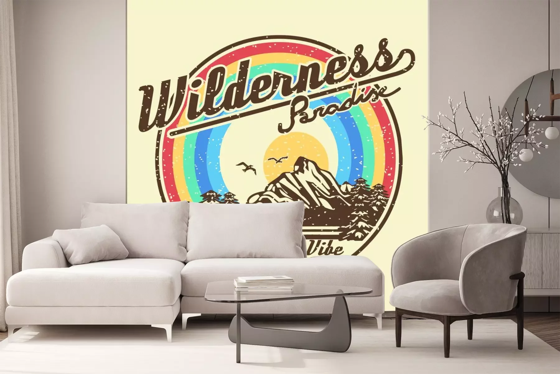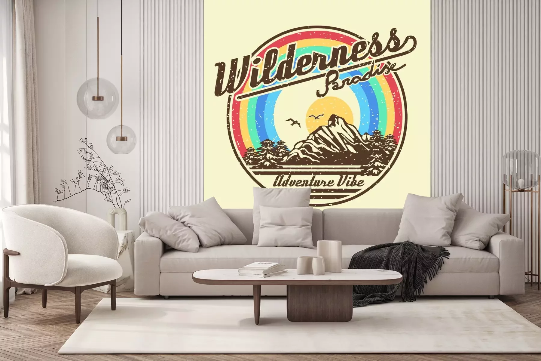 Sticker  Lettrage de la Californie, sport et explorer. Arbres et arc-en-ciel en voyage. Cactus et soleil sur timbre. T-shirt aventure tropicale pour une autre expédition en forêt. Illustration vectorielle