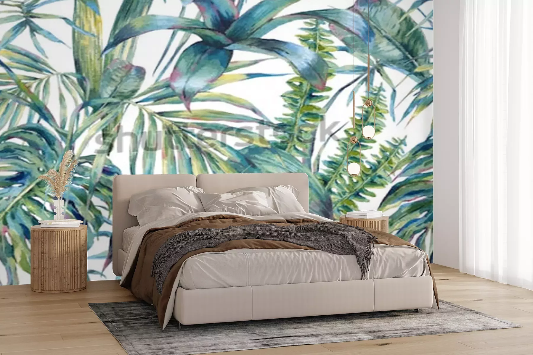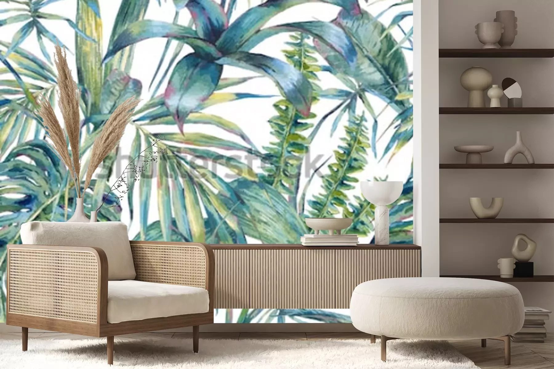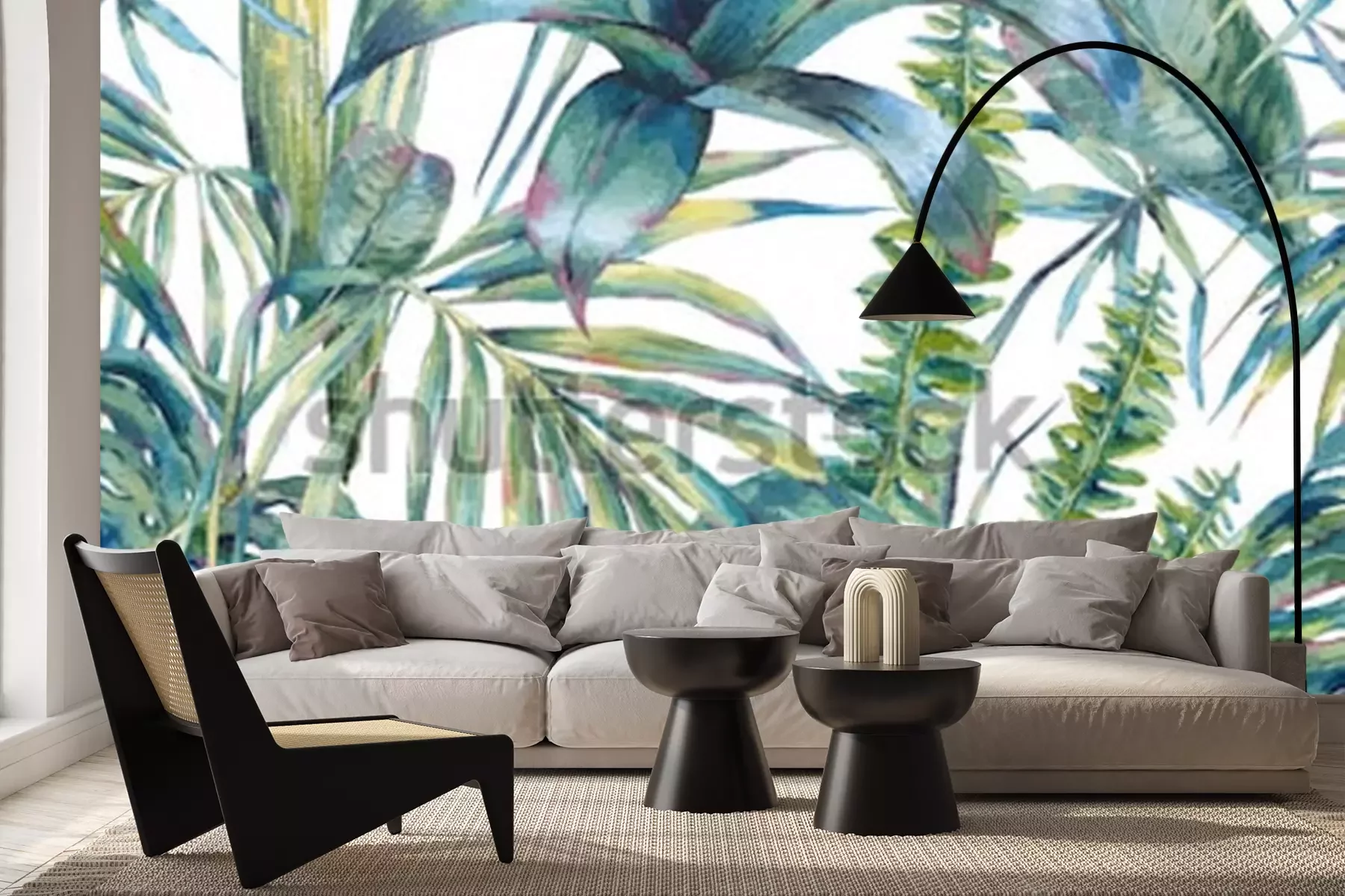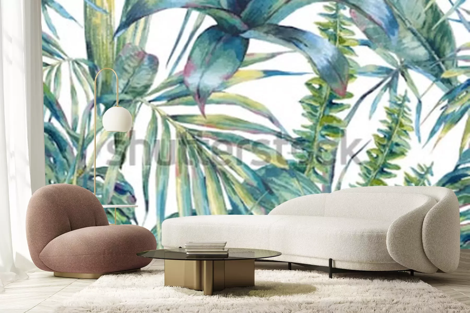 Sticker  Modèle sans couture aquarelle exotique de feuilles naturelles, feuilles tropicales vertes, fougère, jungle dense, Illustration de l'été botanique peinte à la main sur fond blanc
