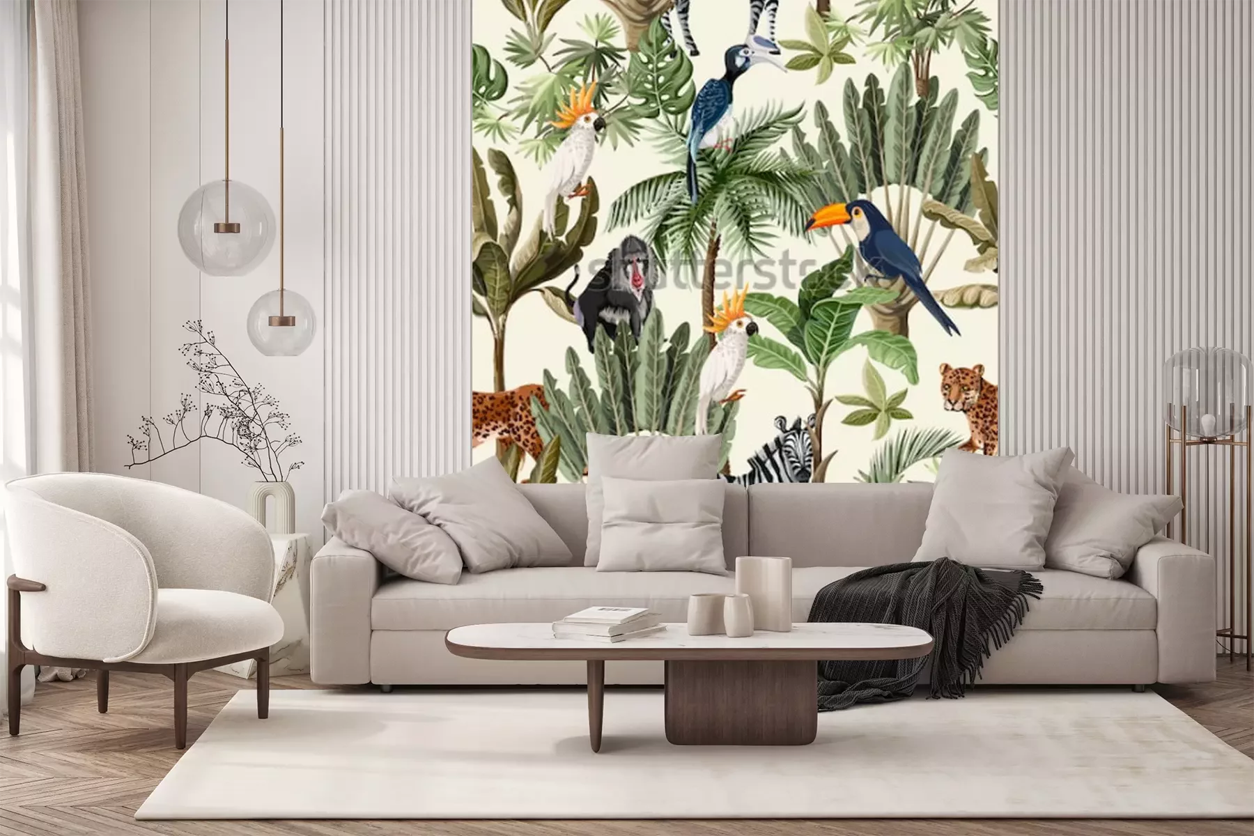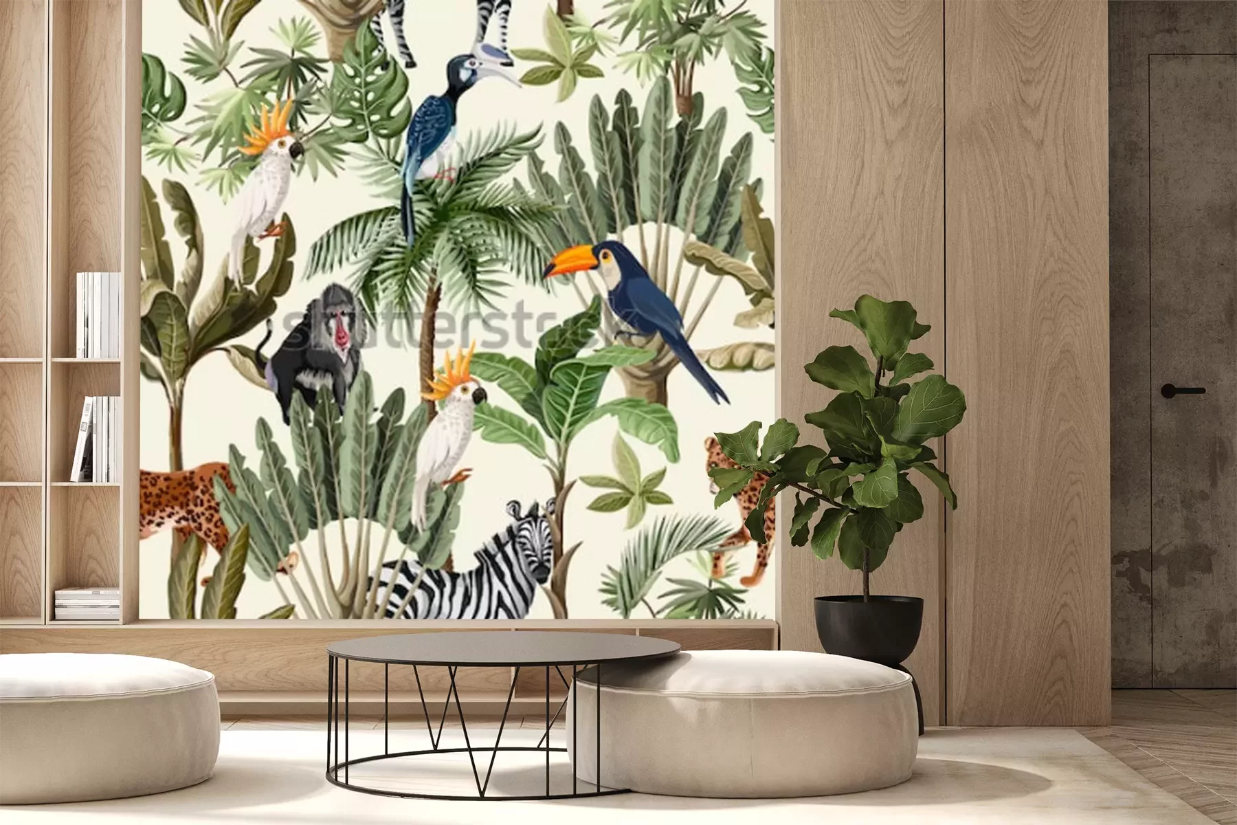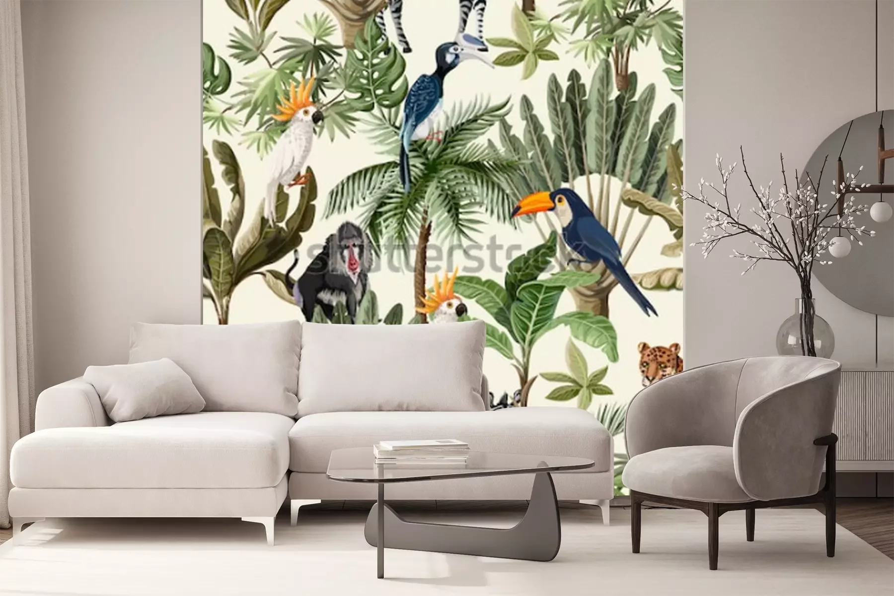 Sticker  Modèle sans couture avec des animaux et des arbres exotiques.