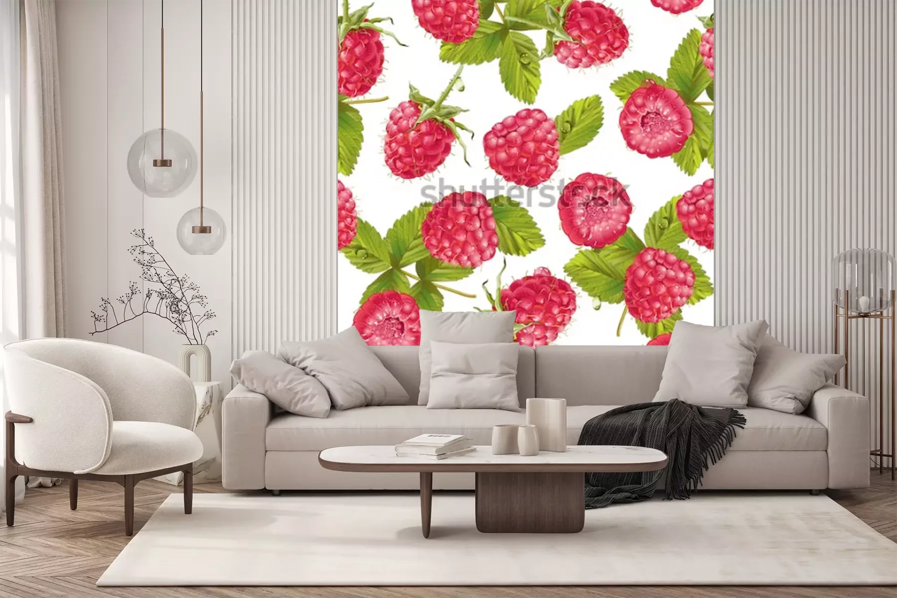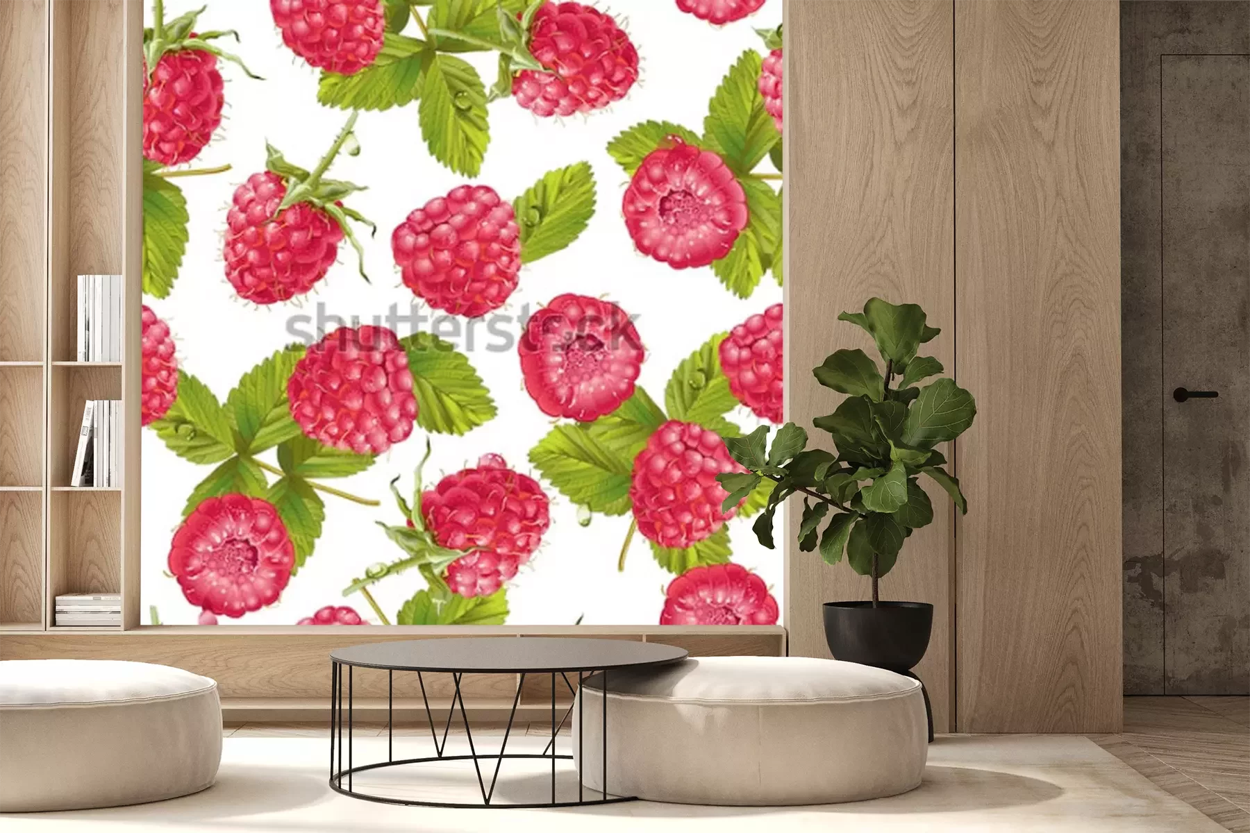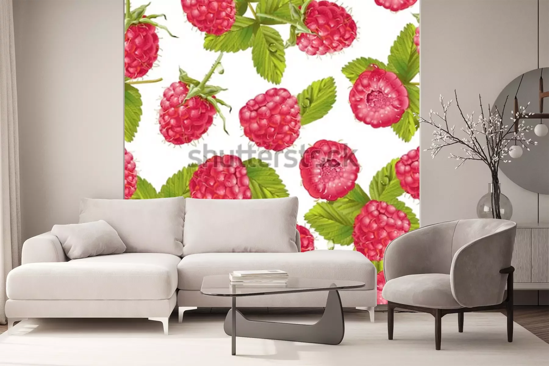 Sticker  Modèle sans couture de framboise de vecteur sur blanc. Design de fond pour les sucreries et les pâtisseries fourrées à la framboise, carte de desserts, produits de soins de santé, cosmétiques naturels