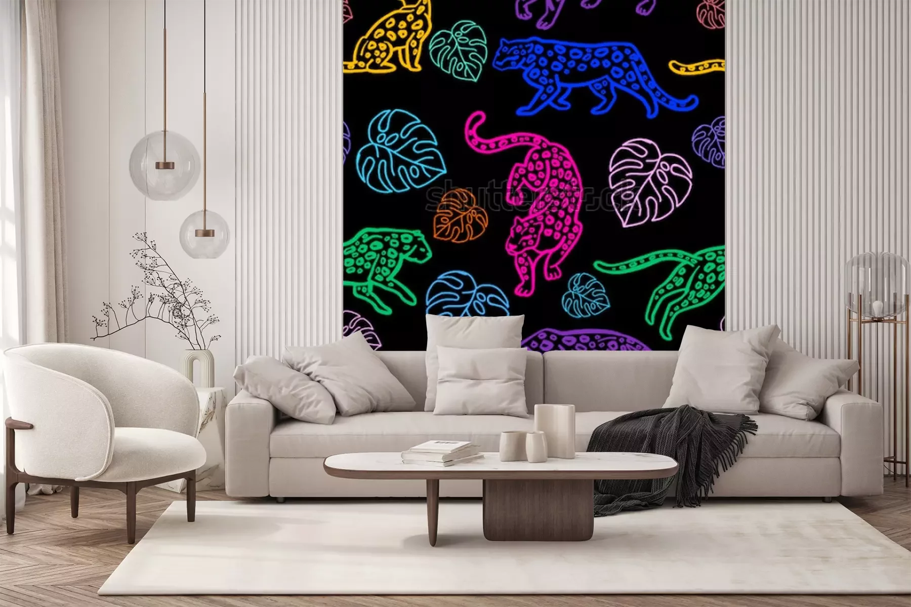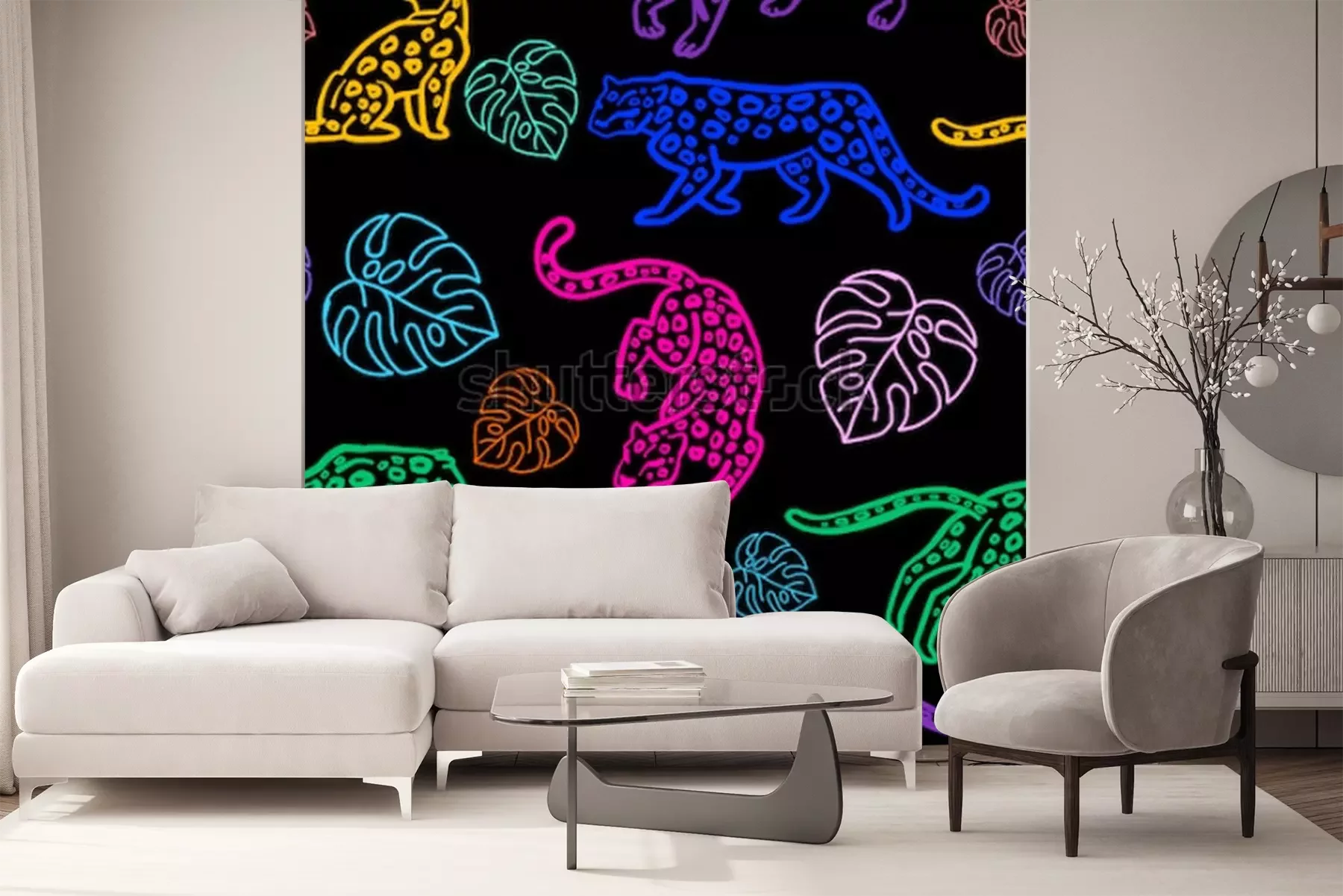 Sticker  Modèle sans couture. Léopards et feuilles de monstera mignons. Isolé sur fond blanc Chats sauvages. Illustration au néon.