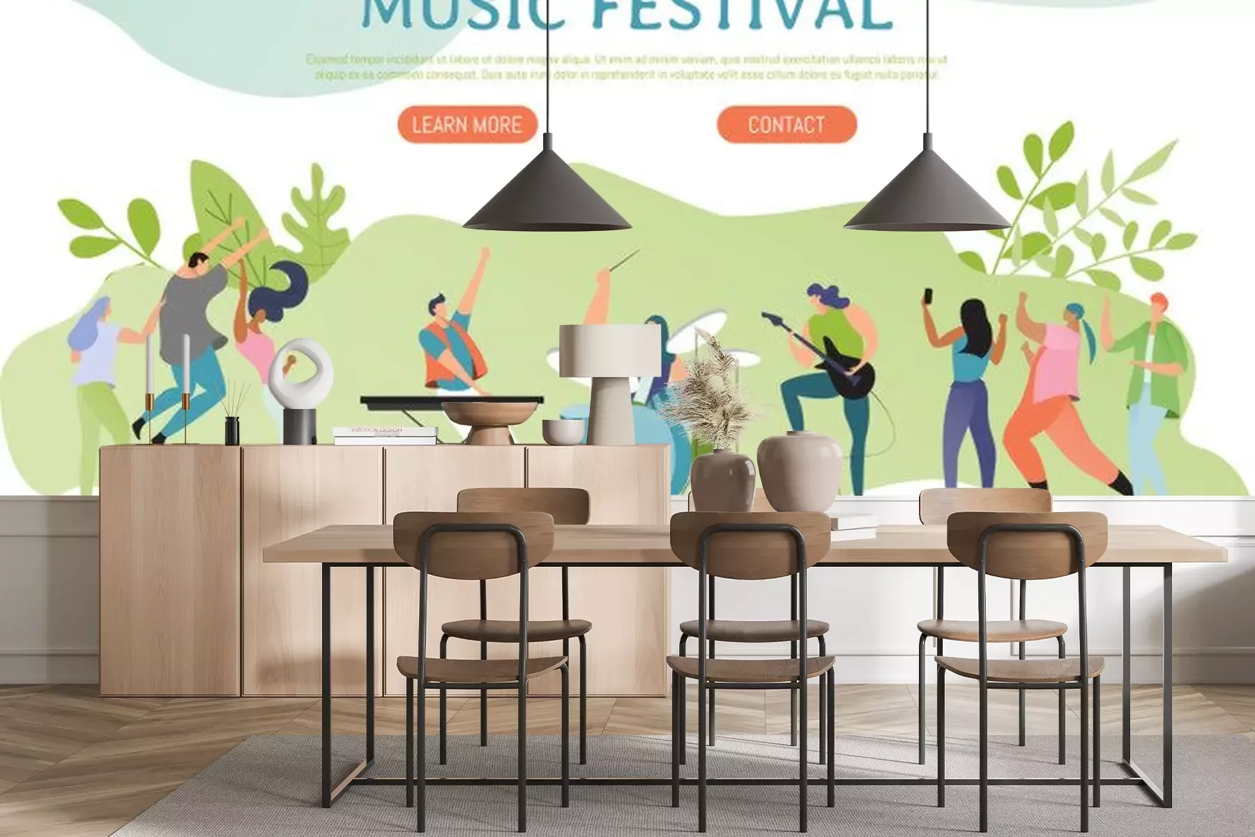 Sticker  Music festival poster, people on concert, rock band website concept, vector illustration. Men and women cartoon characters in flat style playing musical instruments, drums, guitar and piano keyboard