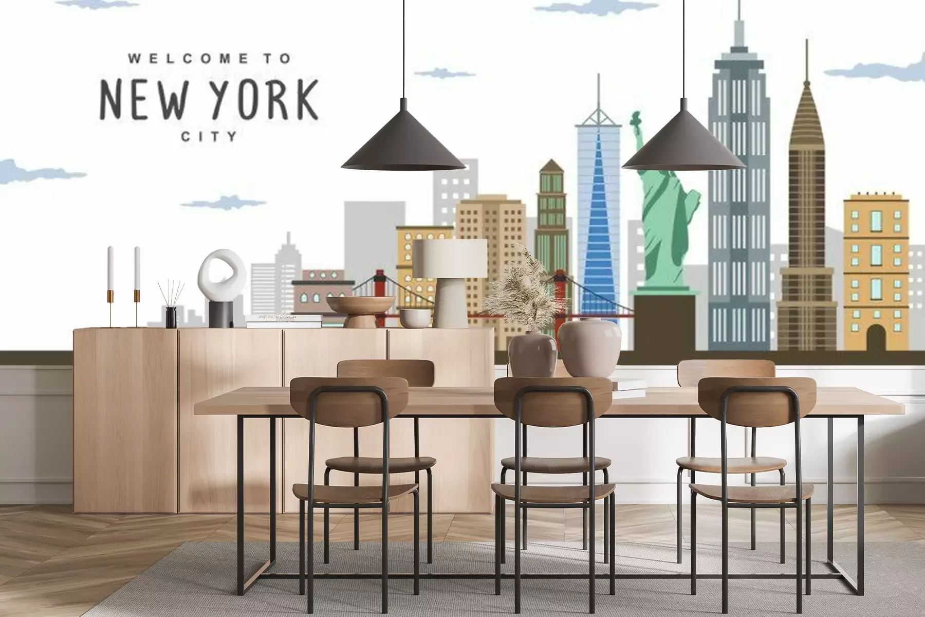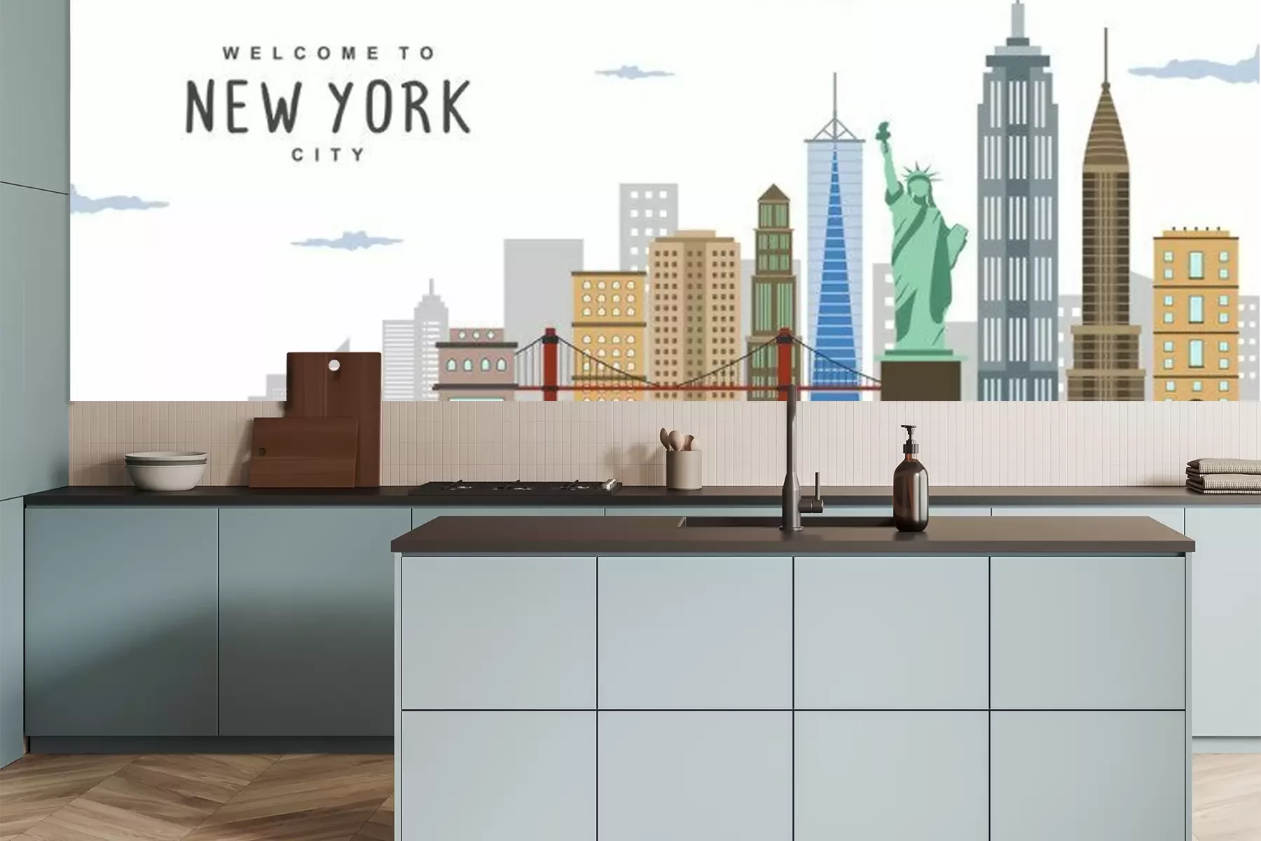 Sticker  New York City panorama landscape scene with Brooklyn Bridge, The Statue of Liberty and wide angle view of the Lower Manhattan. Beautiful view of metropolitan. Landmarks of New York City, USA