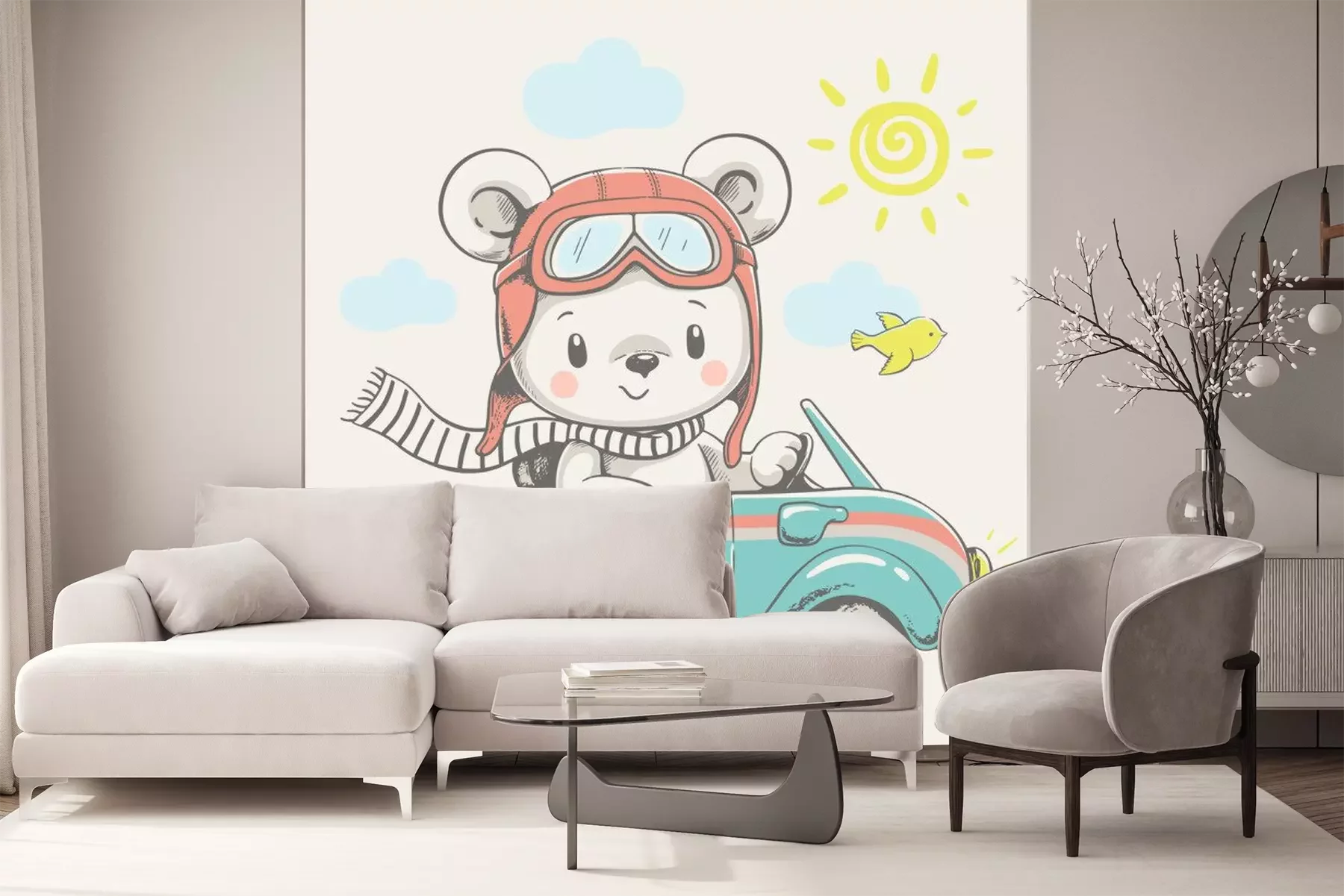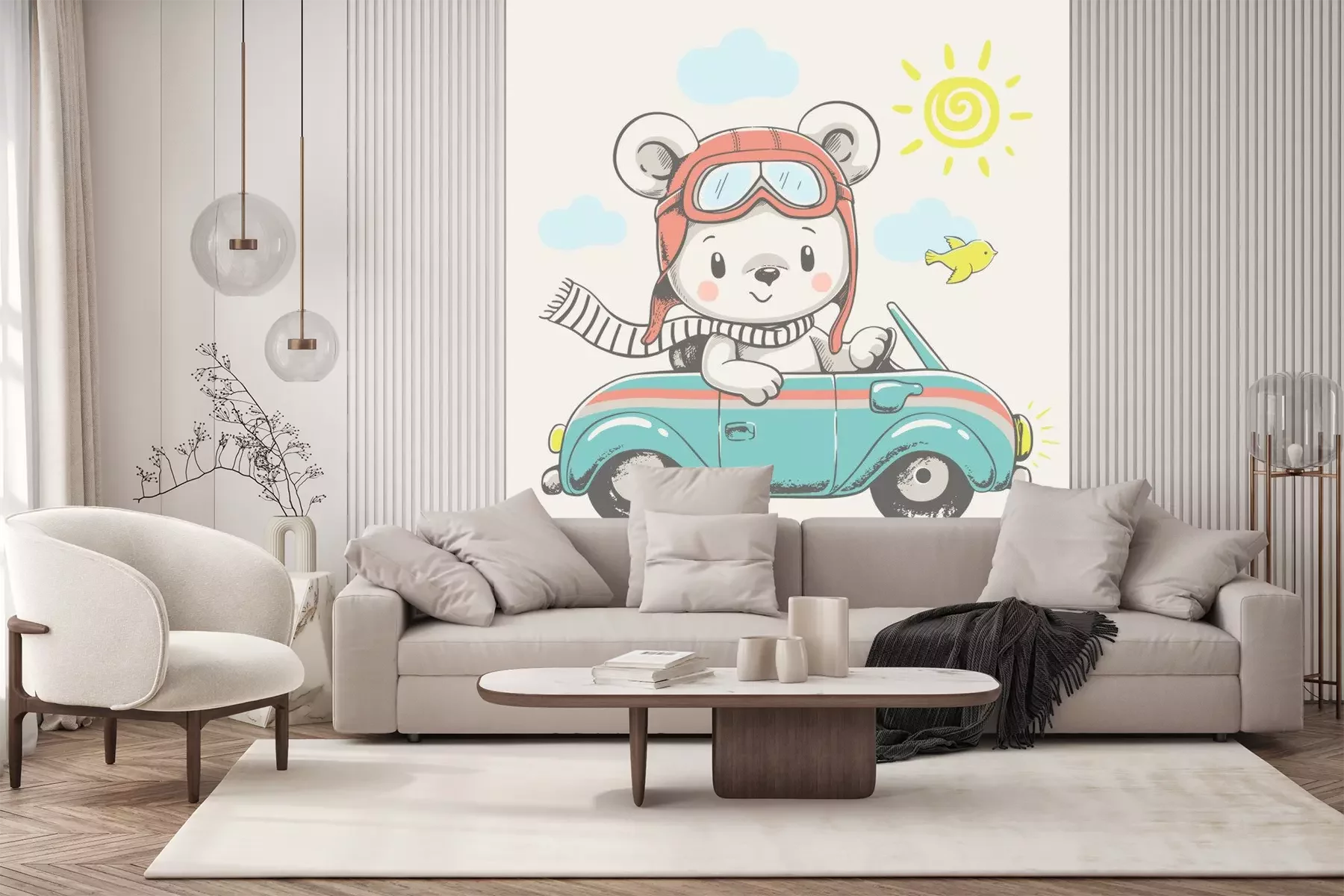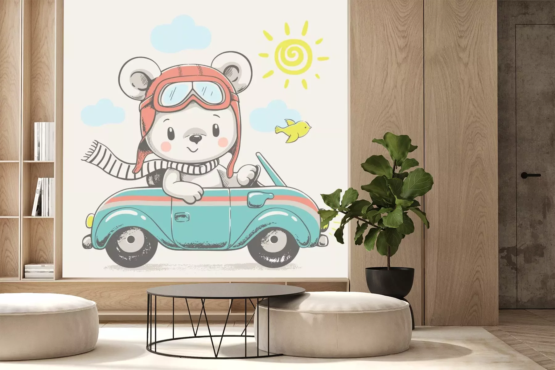 Sticker  Ours mignon au volant de la voiture dessin animé main dessinée illustration vectorielle. Peut être employé pour l'impression de T-shirt, les enfants portent la conception de mode, la salutation de fêt