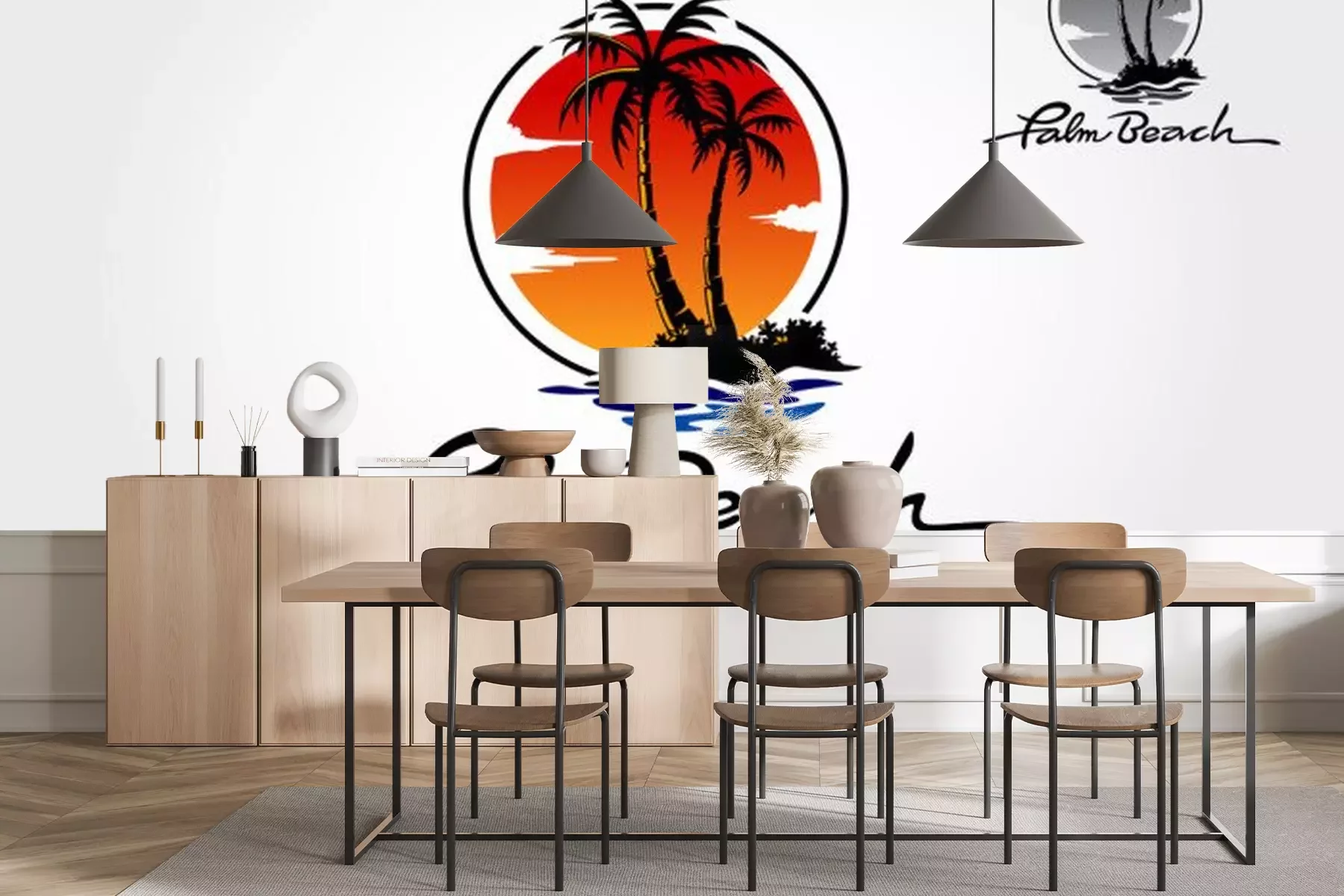 Sticker  Palm Beach Logo Template, Water ocean waves with sun, palm tree and beach, for restaurant and hoteling. Palm Beach logo is fully customizable; it can be easily edit to fit your needs.