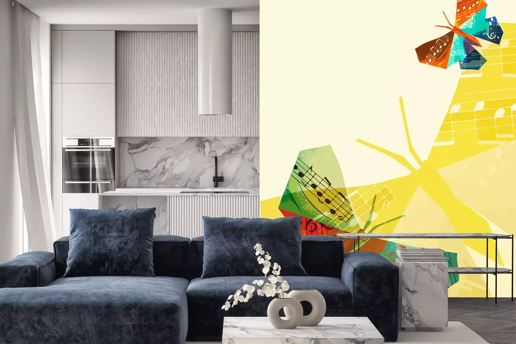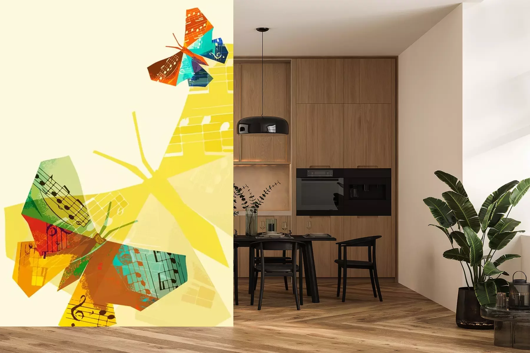 Sticker  Papillon en origami avec des notes de musique. Illustration de fond coloré avec des papillons en origami avec des notes de musique. Concept de musique classique.