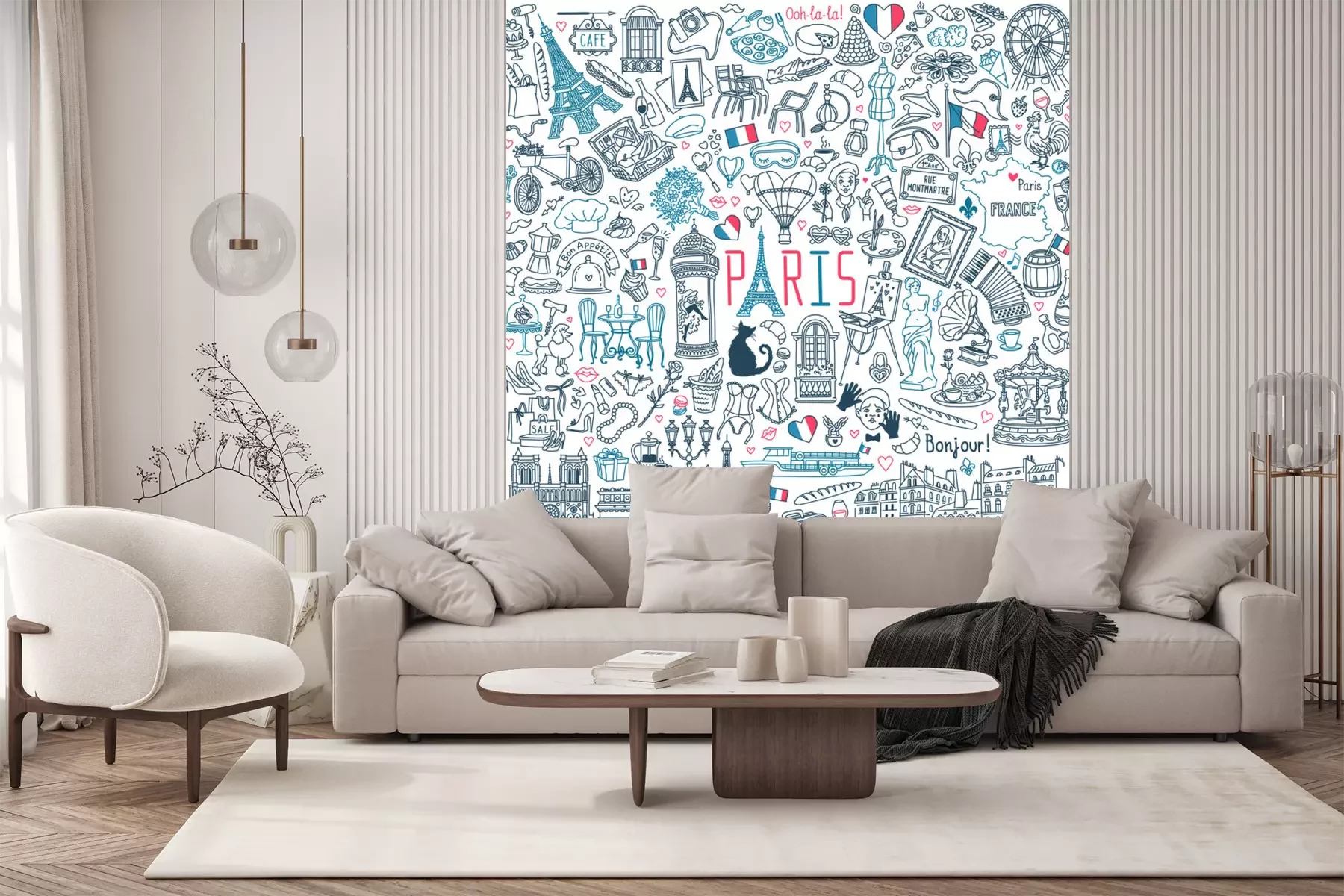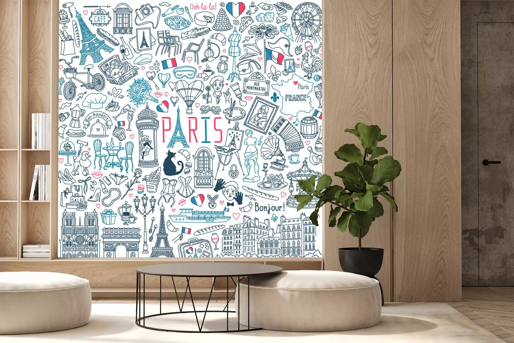 Sticker  Paris doodle set. Popular French landmarks, food and attractions. Vector illustration isolated on white background