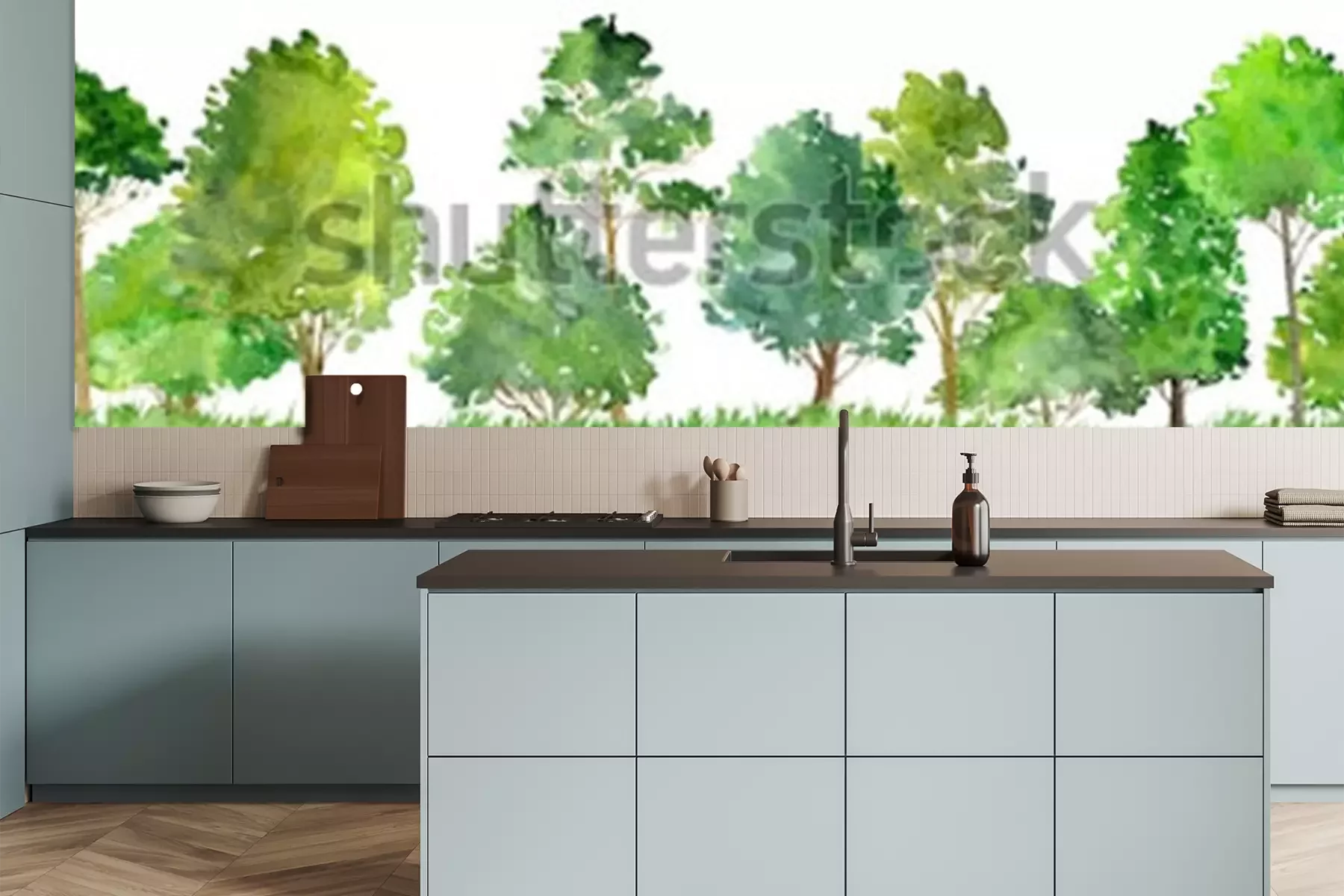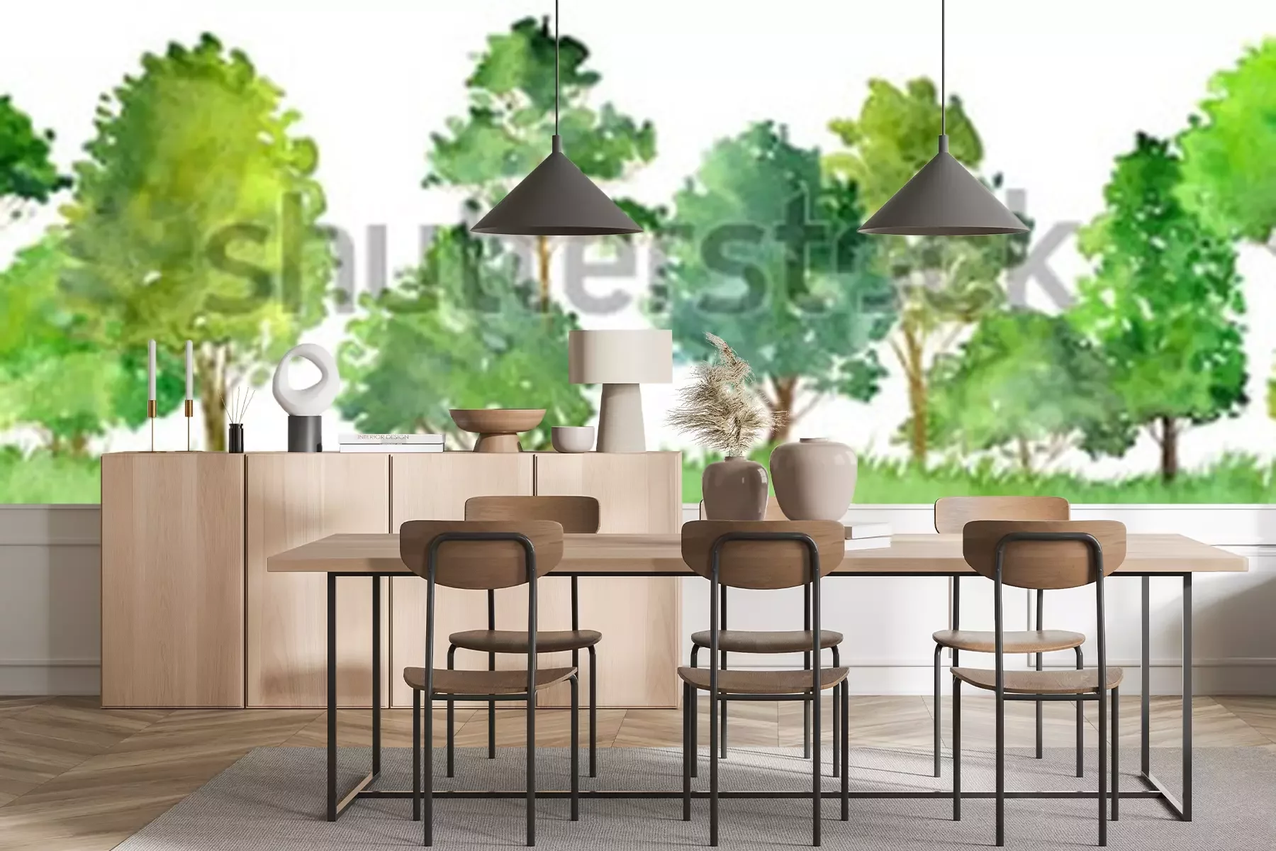 Sticker  paysage aquarelle avec arbres à feuilles caduques, pins, arbustes et herbe, modèle sans couture, fond de nature abstraite, bordure de forêt, illustration dessinée à la main