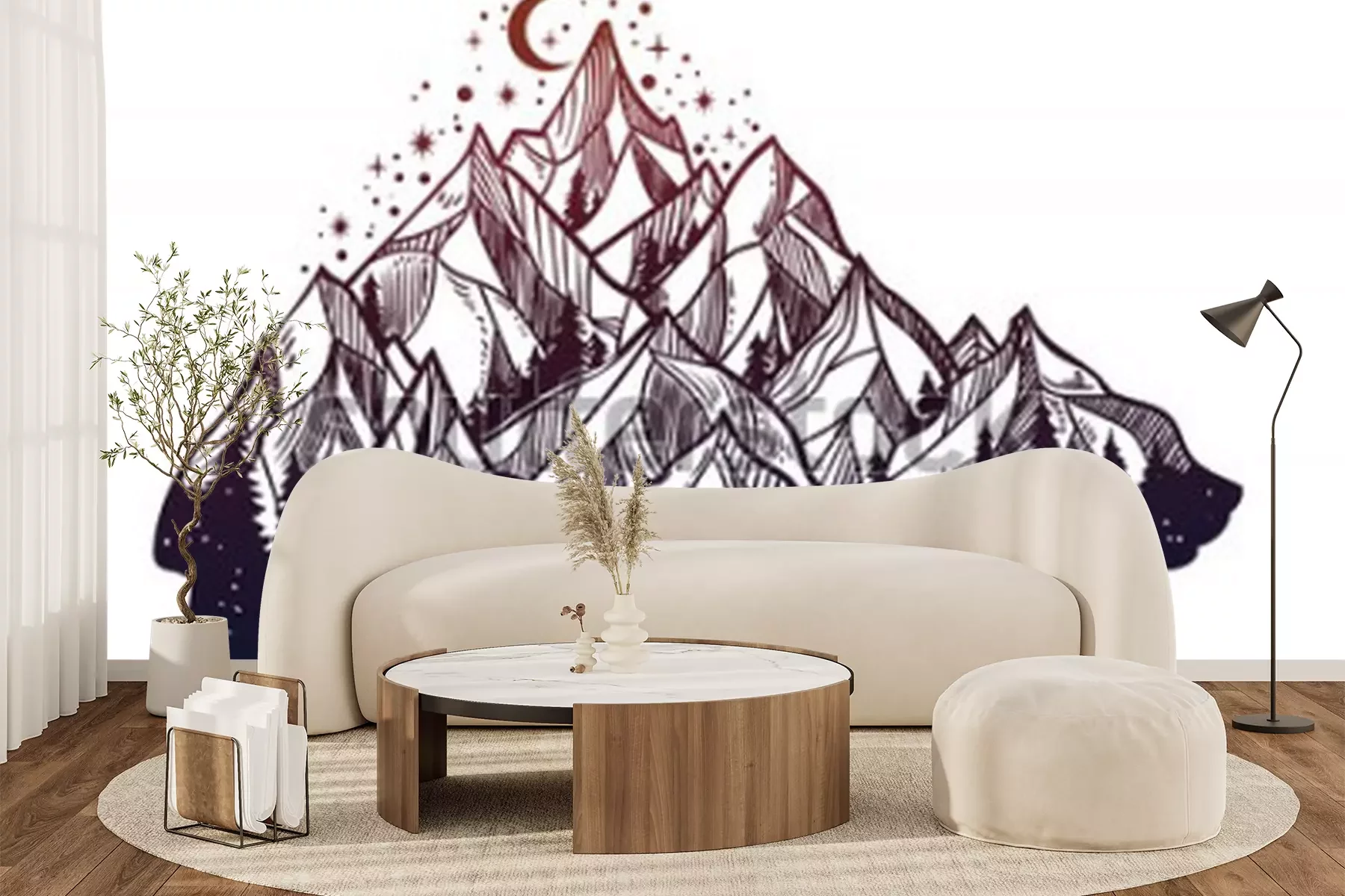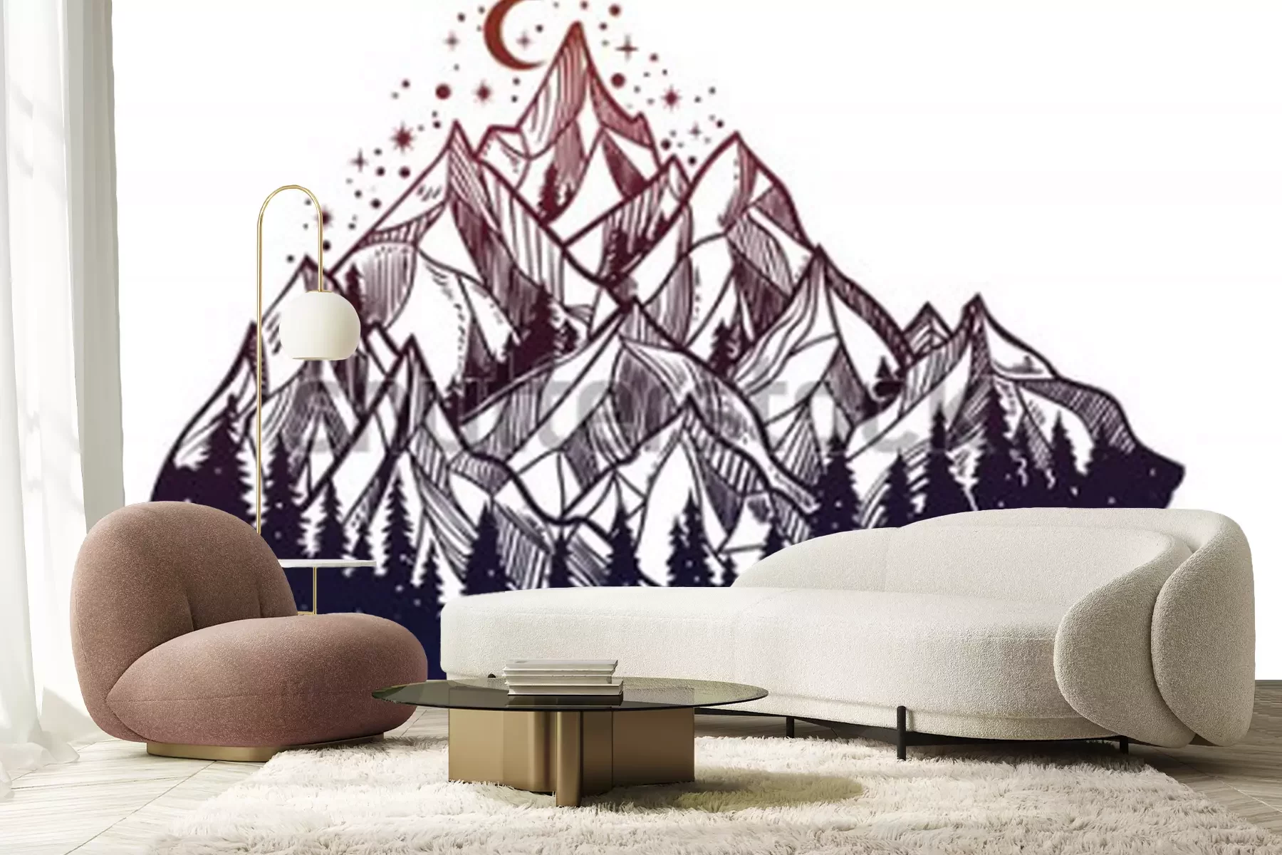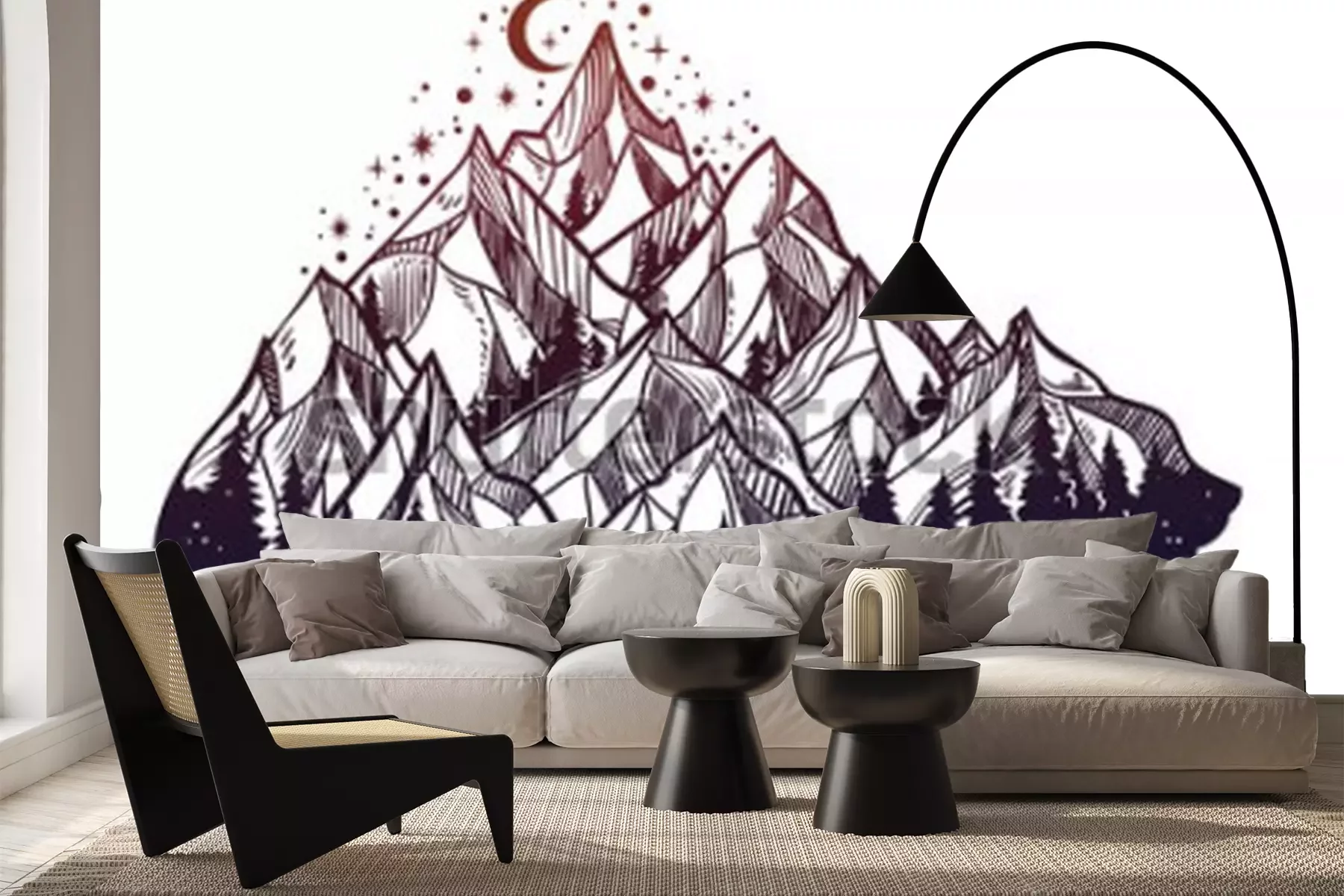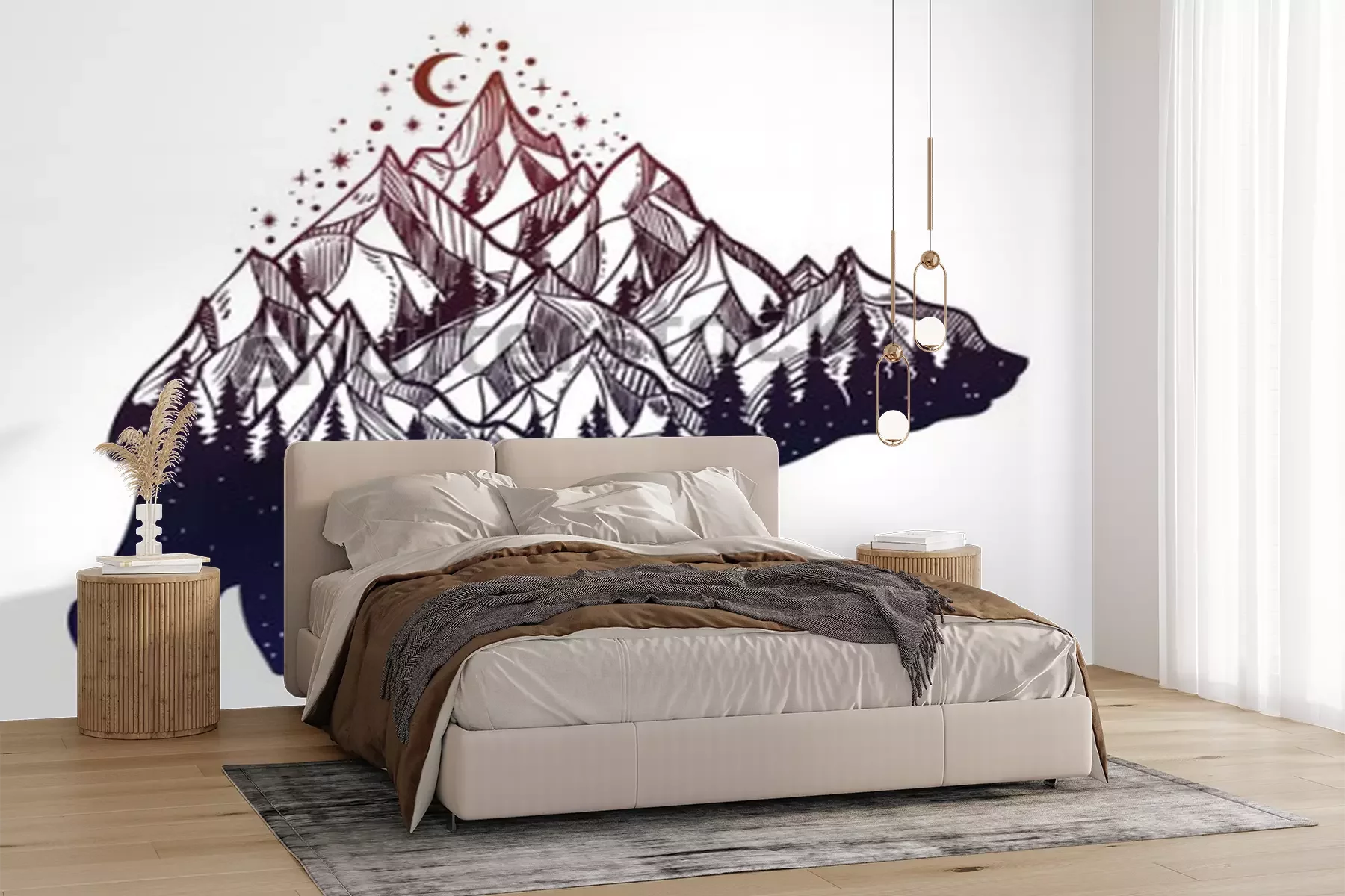 Sticker  Paysage de montagne forêt ours et nuit, double exposition, art de tatouage de la faune, style fantastique. Illustration de vecteur isolé