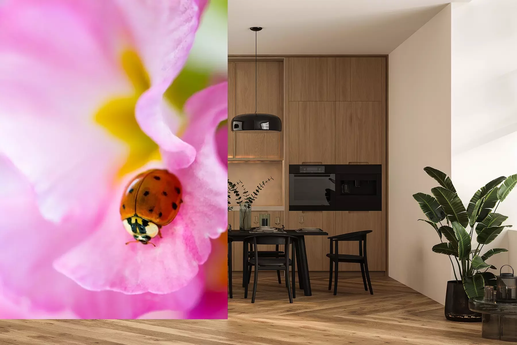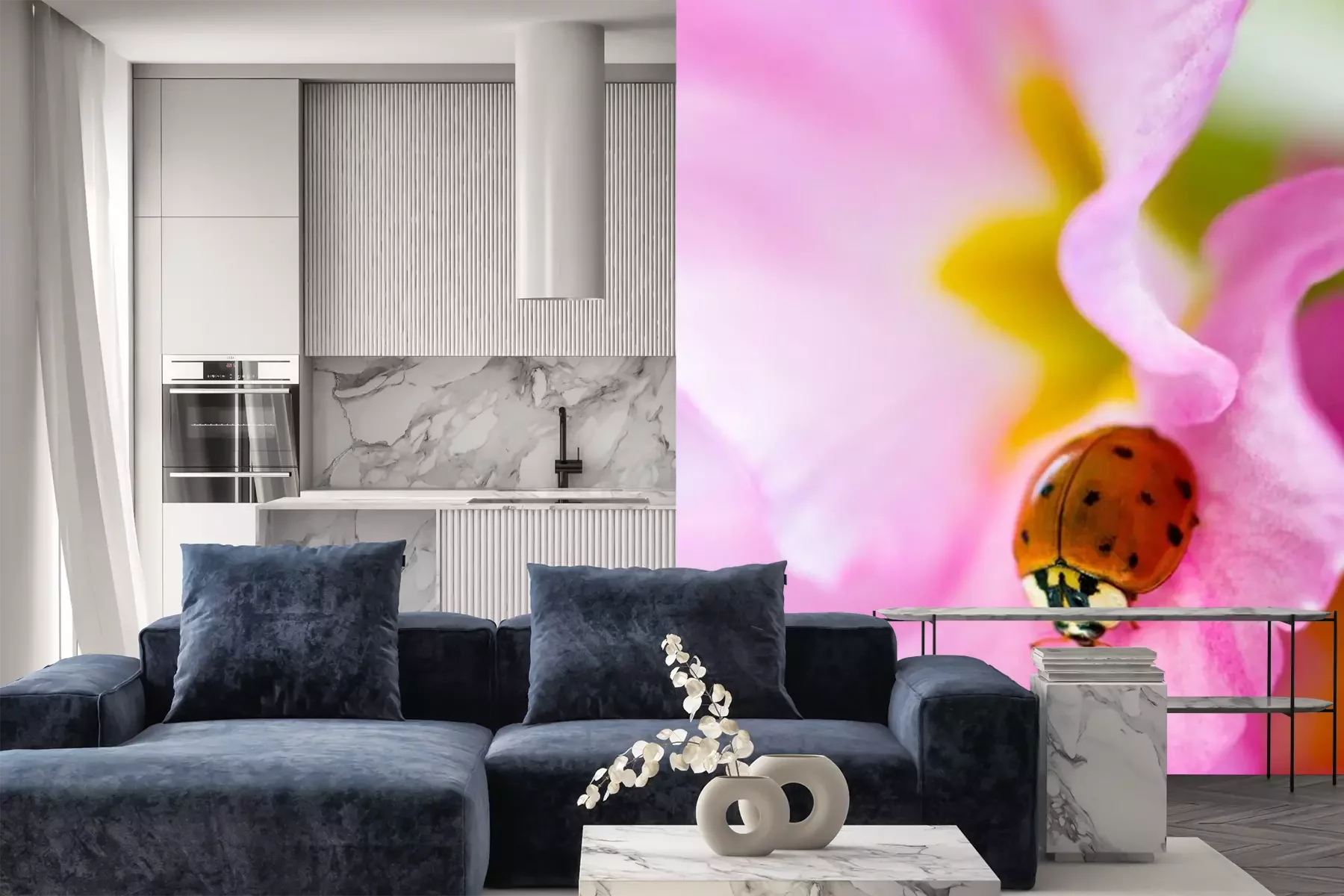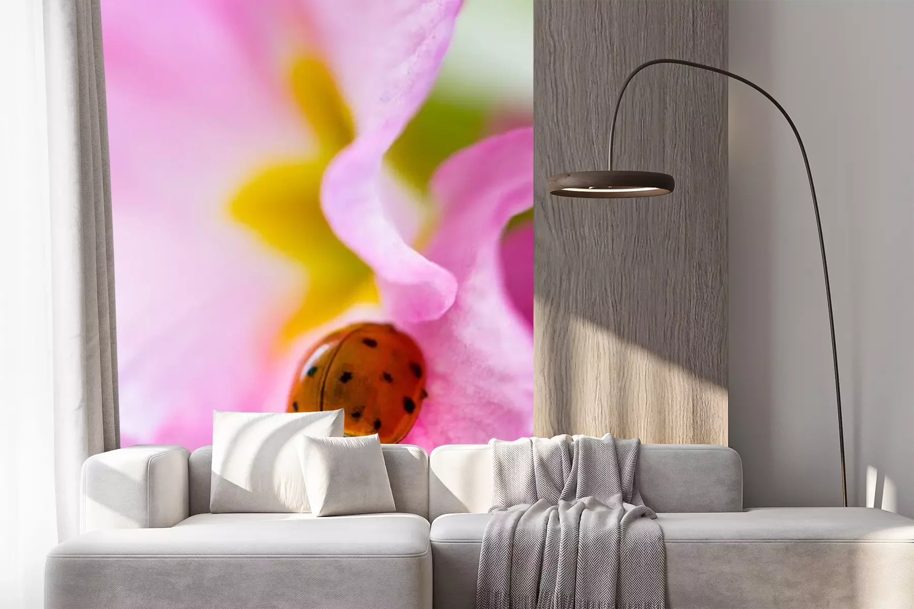 Sticker  Petite coccinelle sur une fleur de primevère rose