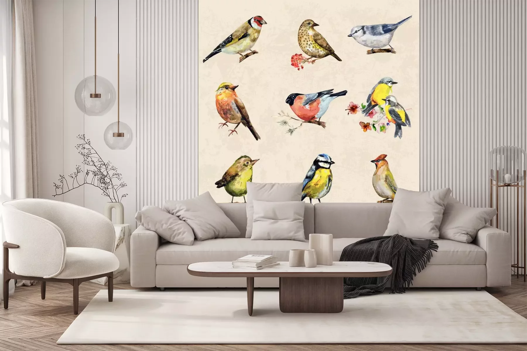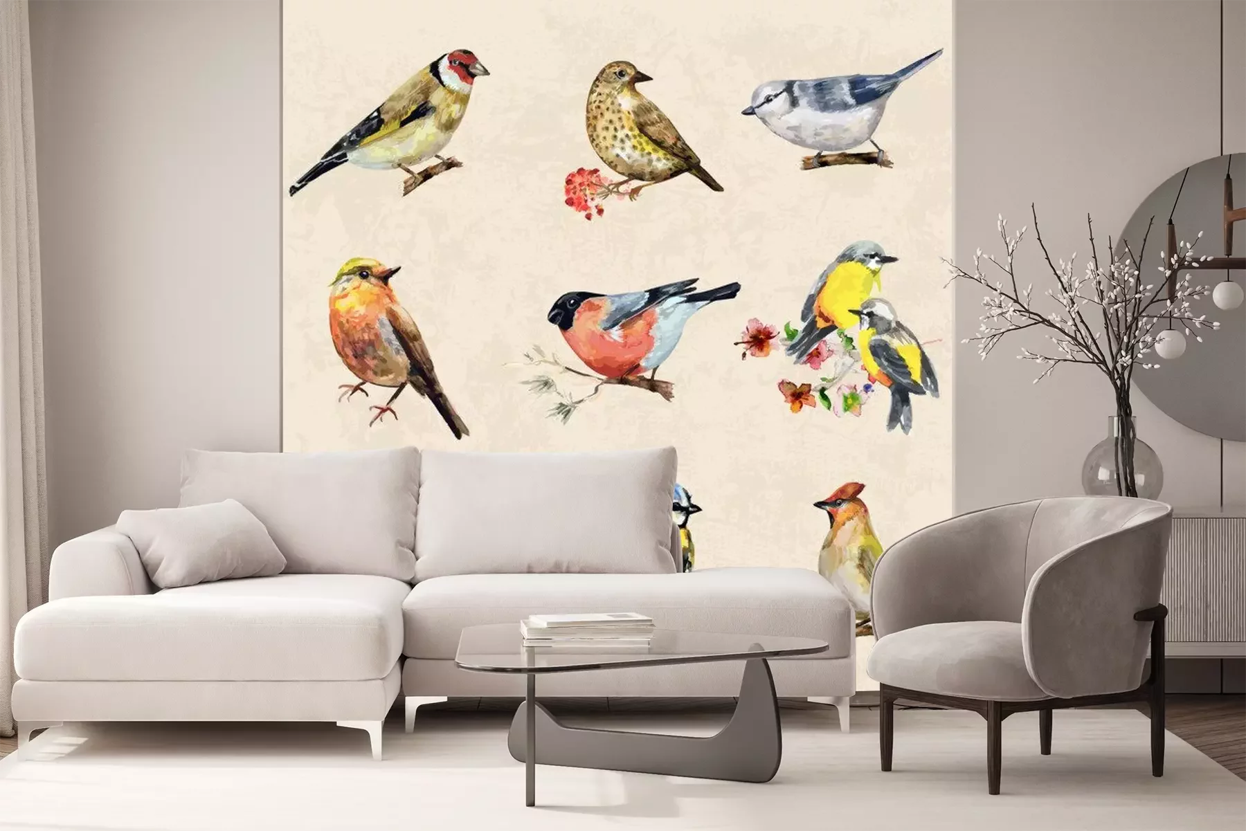 Oiseaux forestiers et sorbier rougePapier peint à motif