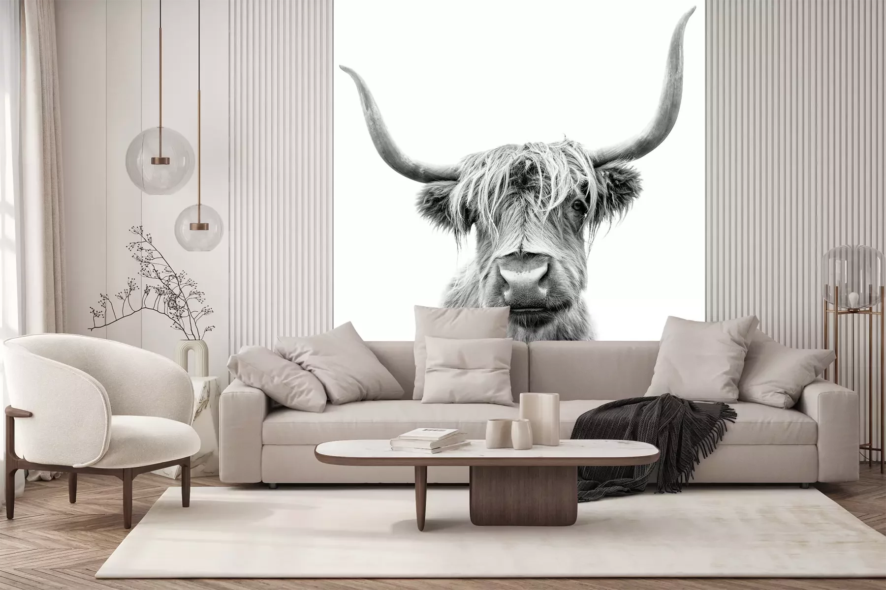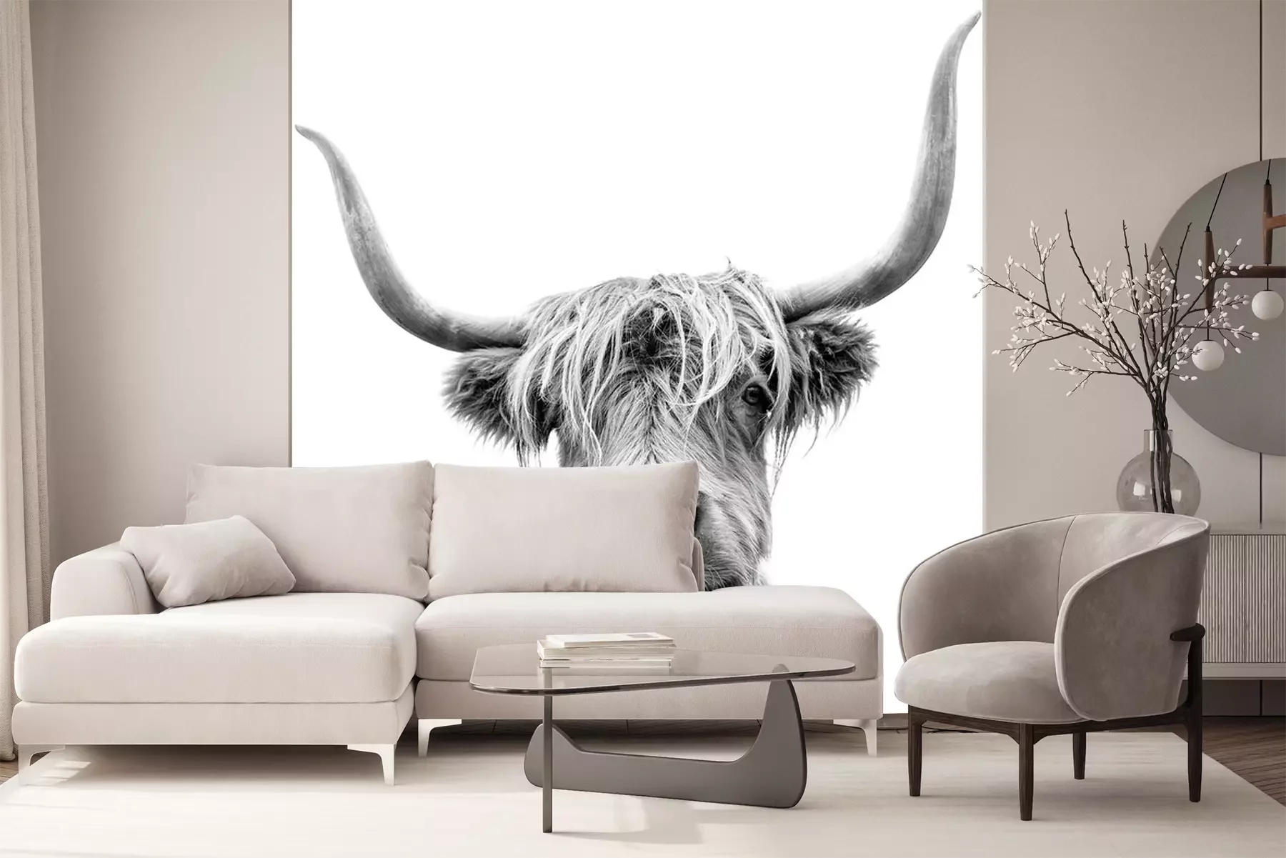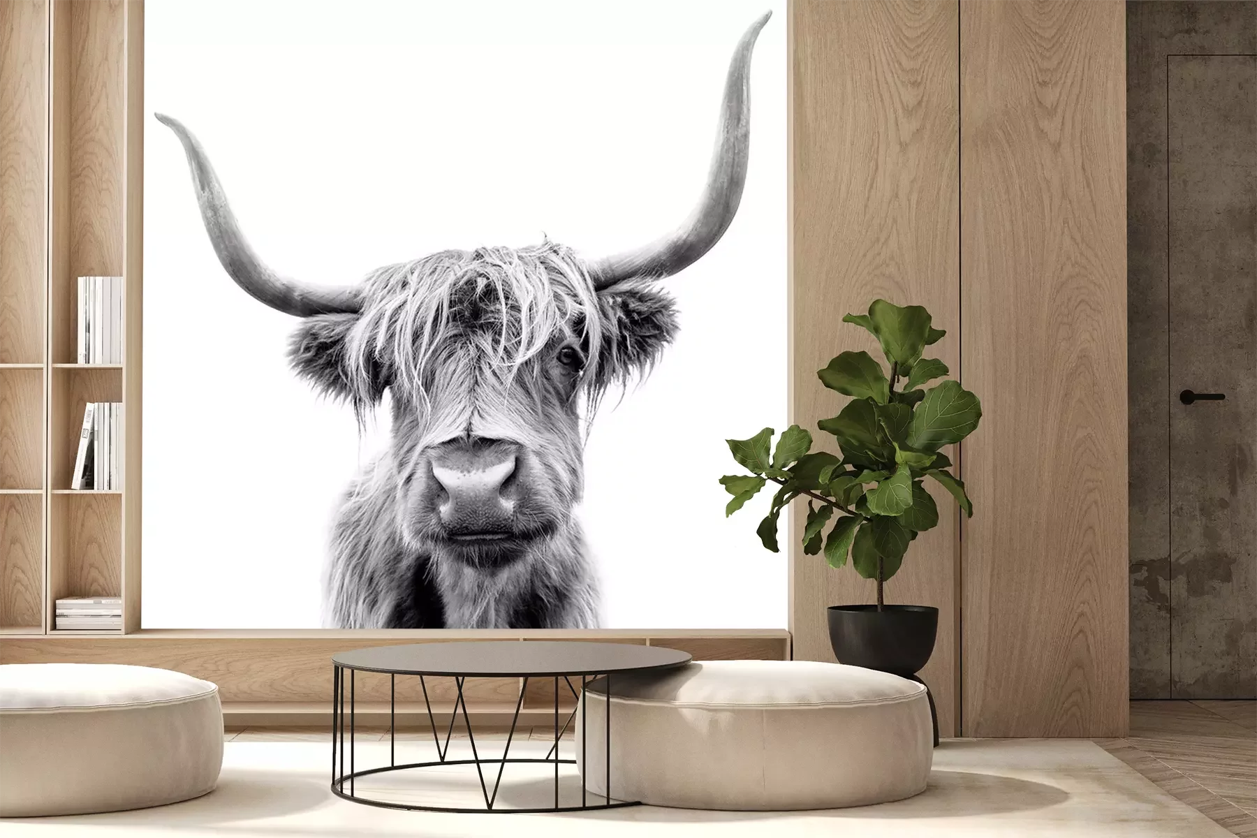 Sticker  Photo en noir et blanc d'une vache écossaise à poil long