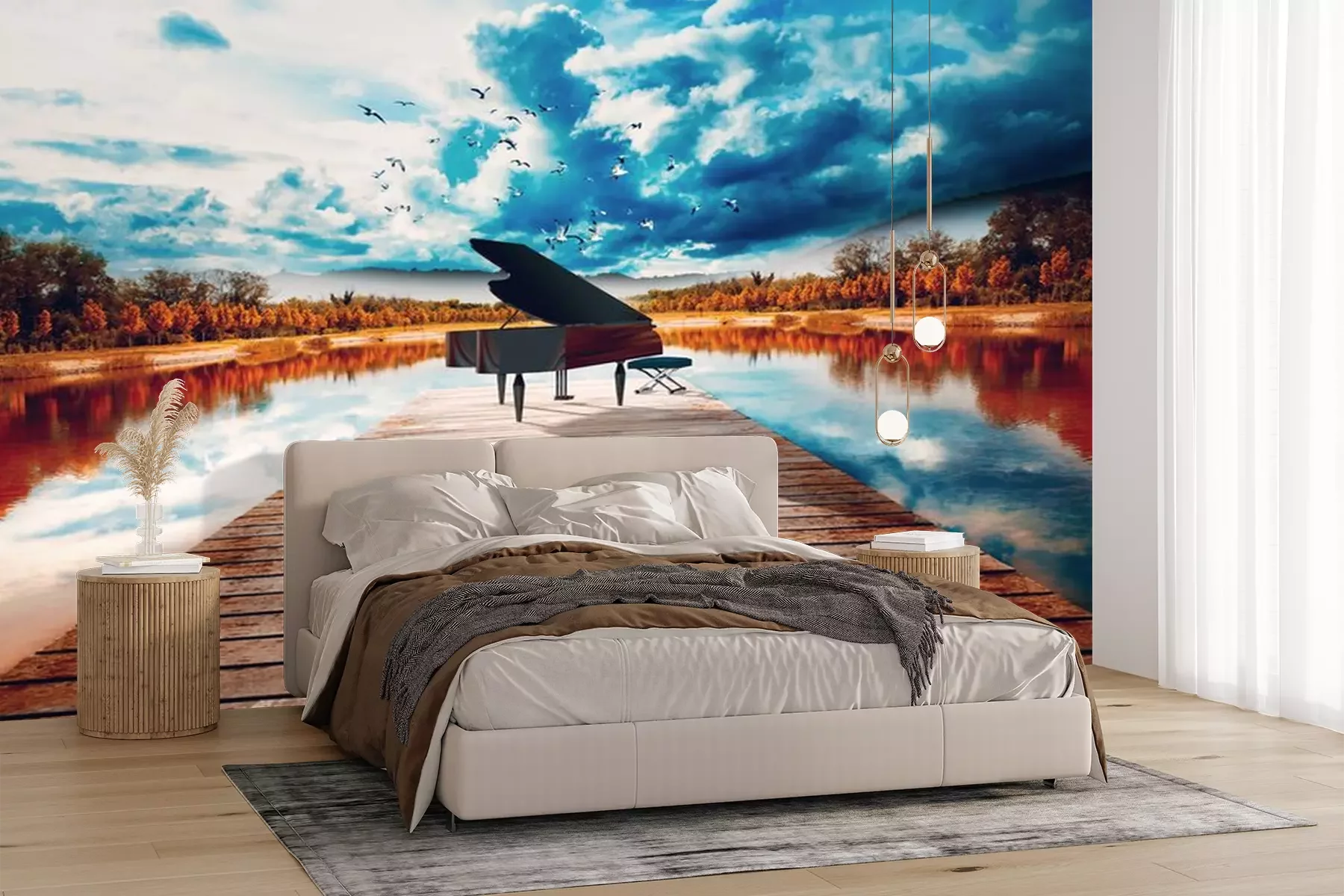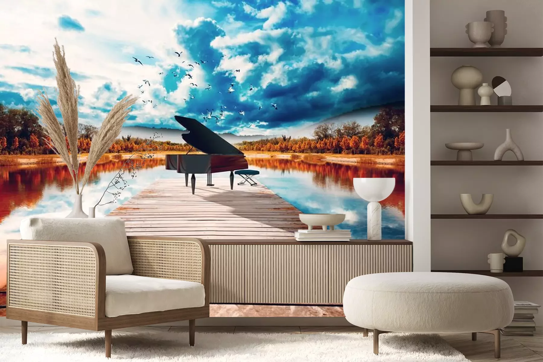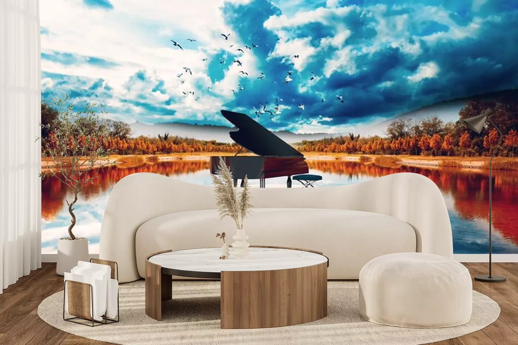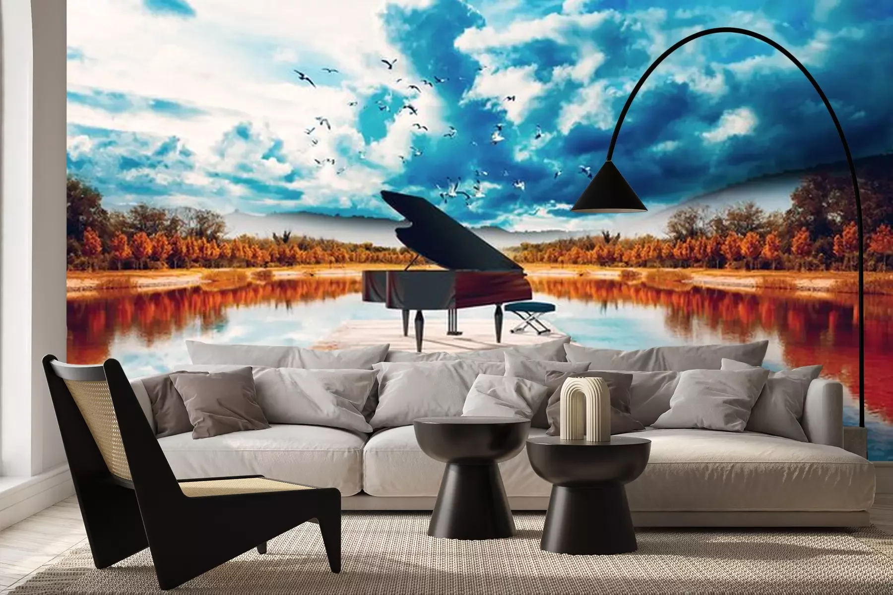 Sticker  Piano en la naturaleza.Paisaje surreal de arboles y lago.Concepto de música relajada y tranquila de piano