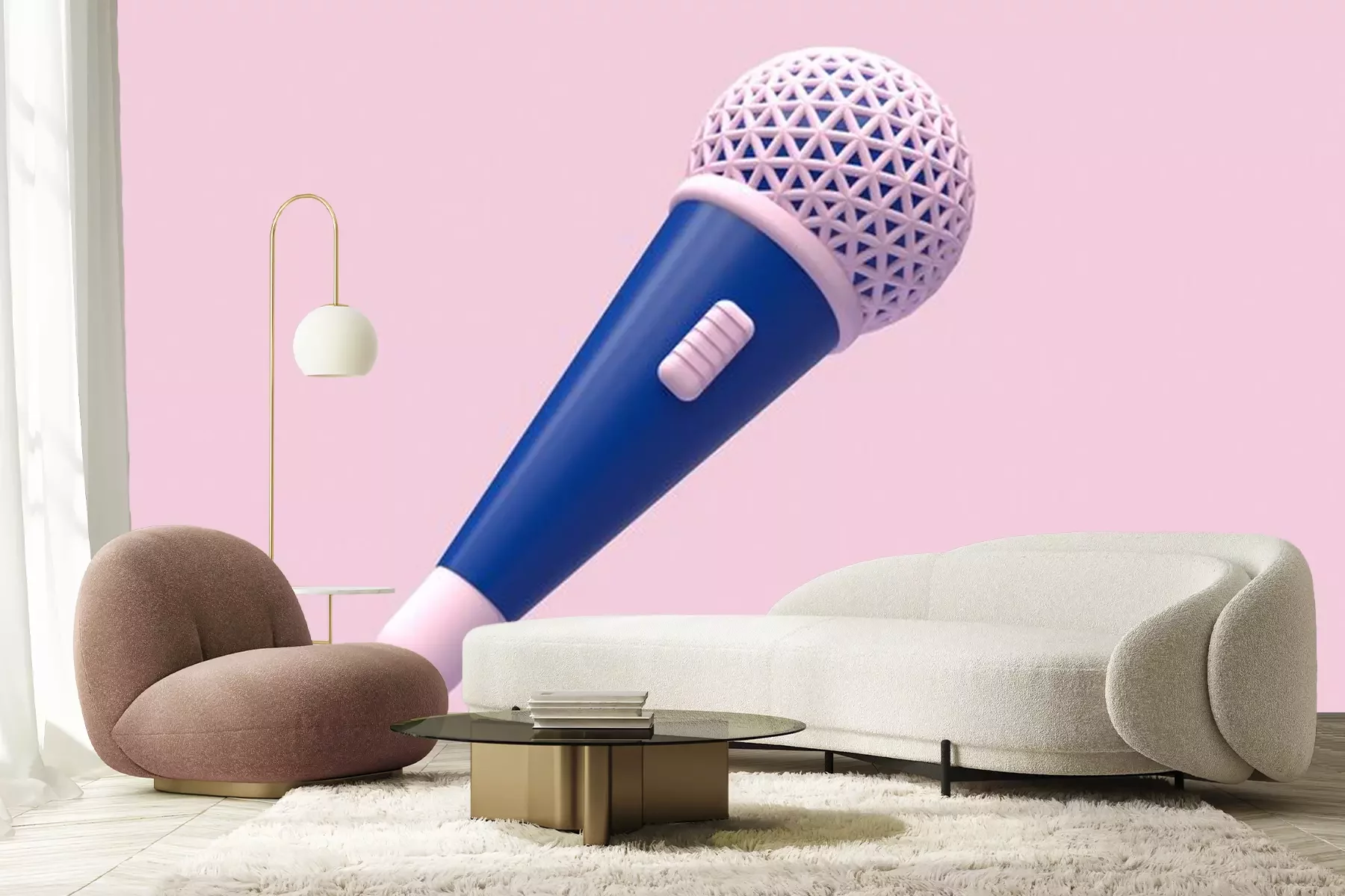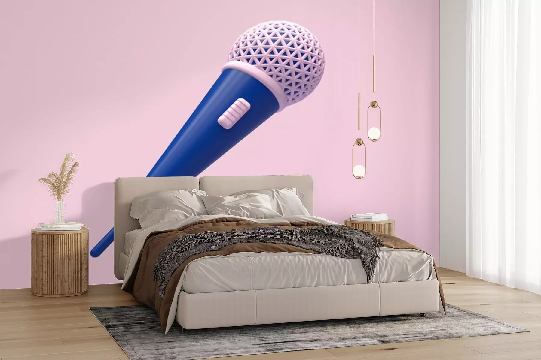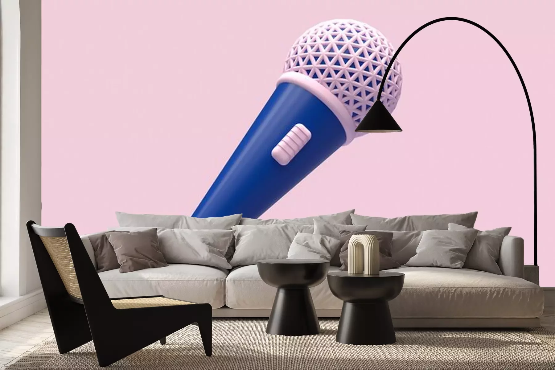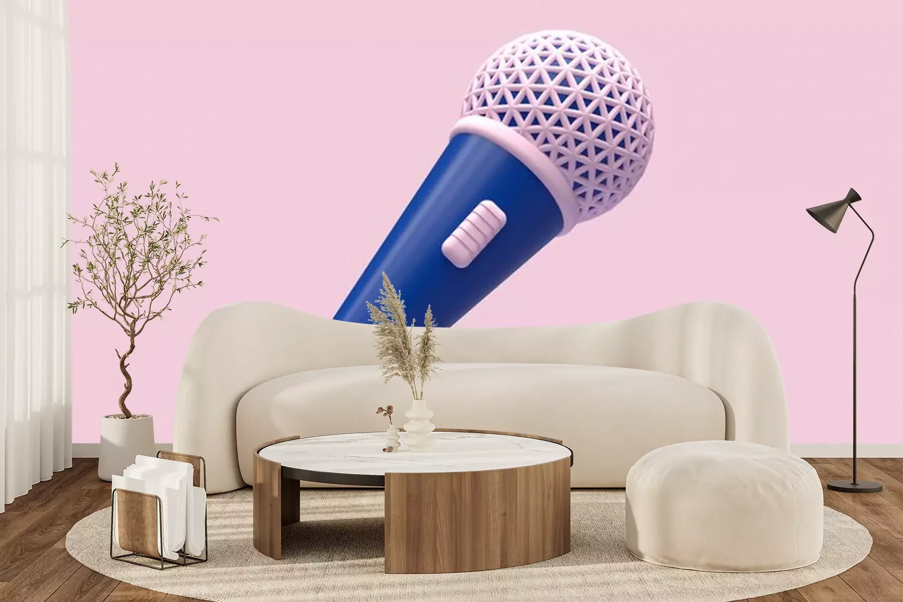 Sticker  pink blue microphone cartoon style 3d rendering technology digital concept