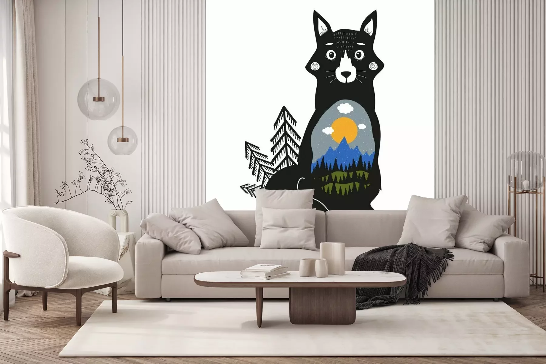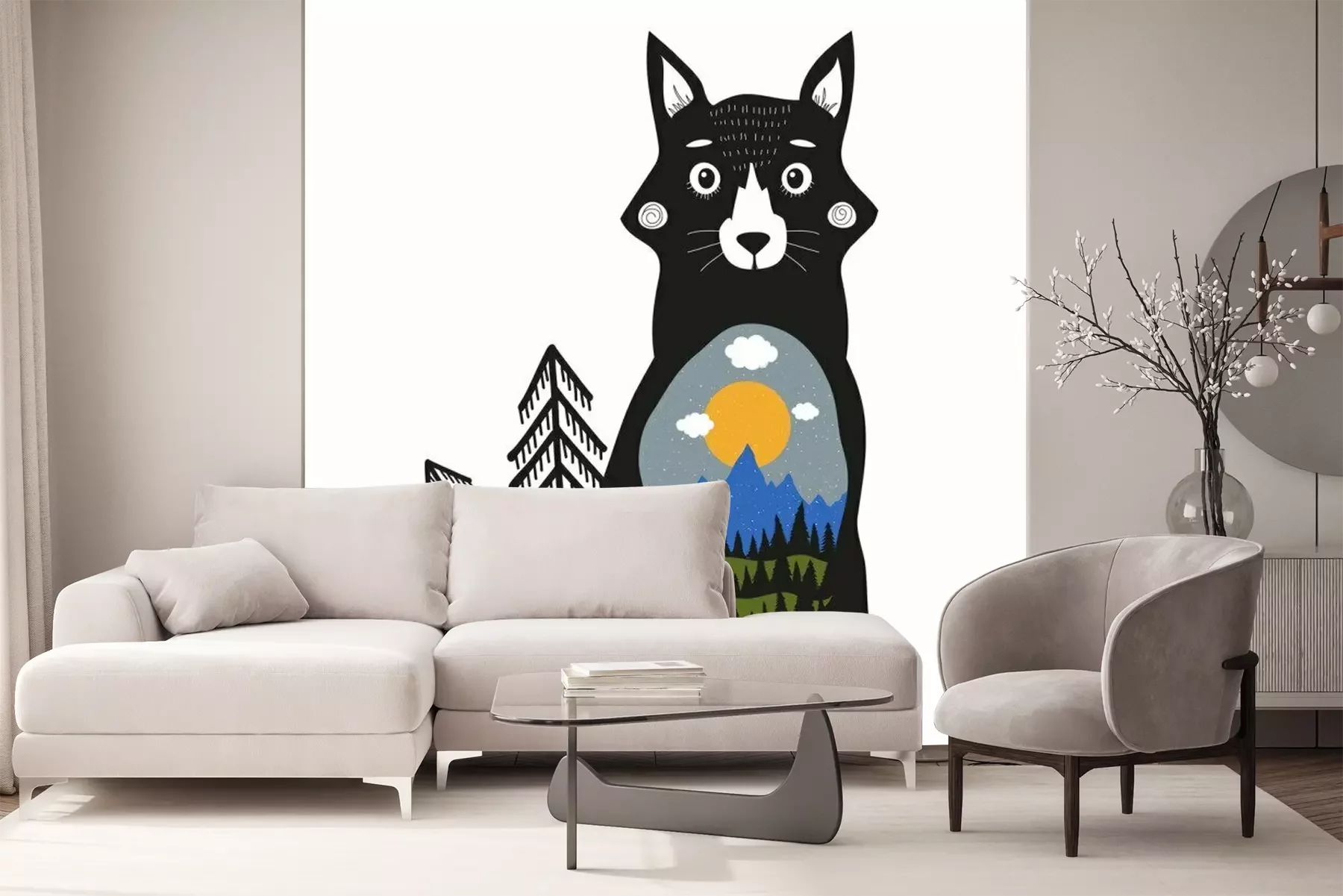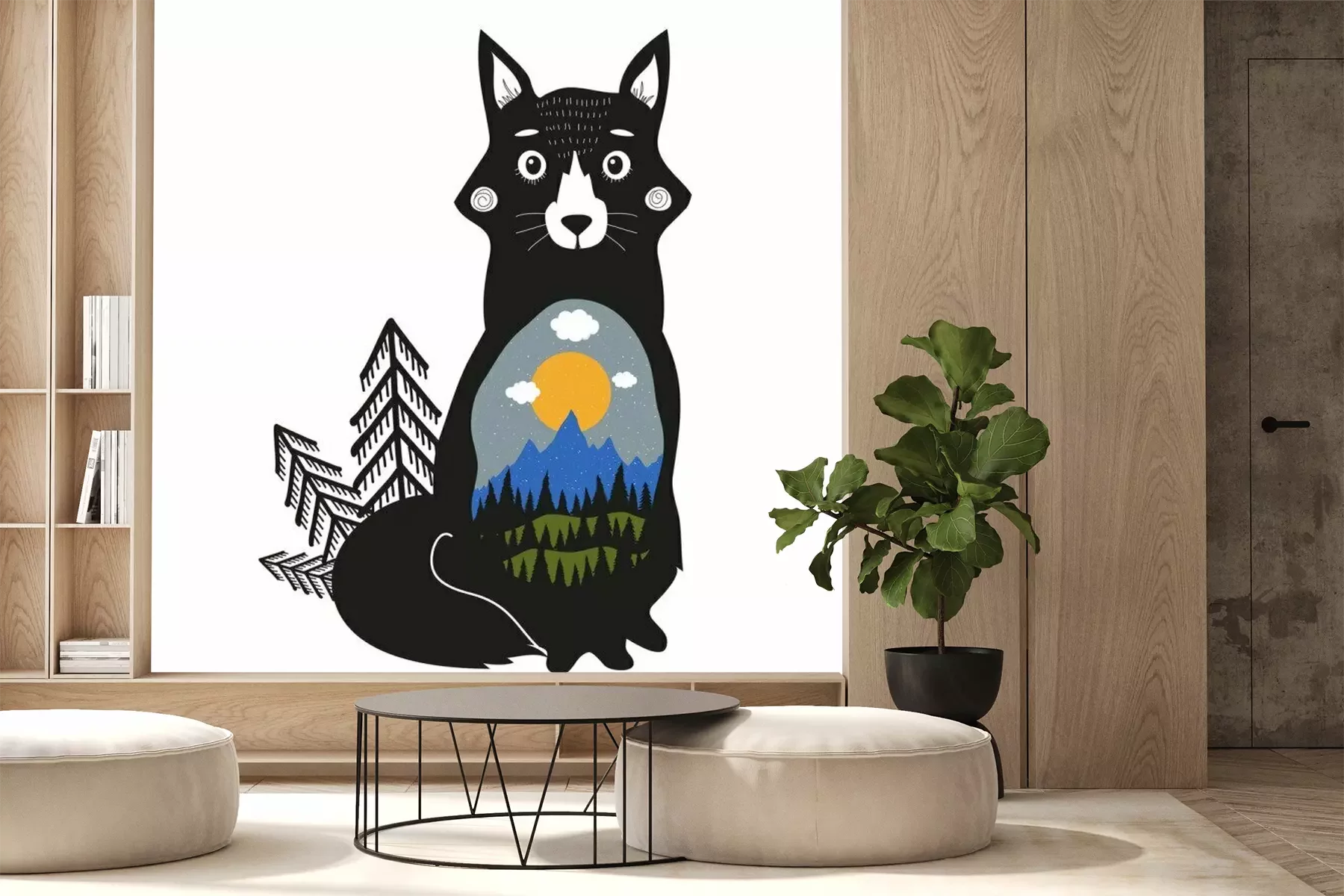 Sticker  Renard, montagnes bleues, forêt de pins noirs, collines verdoyantes, nuages, soleil et neige.