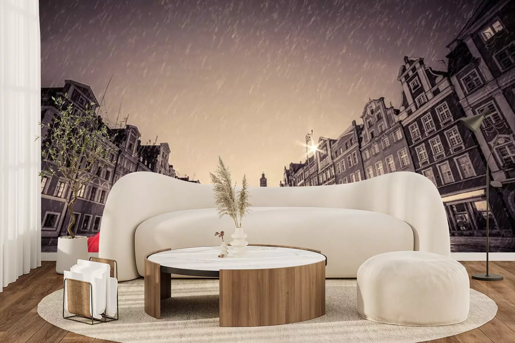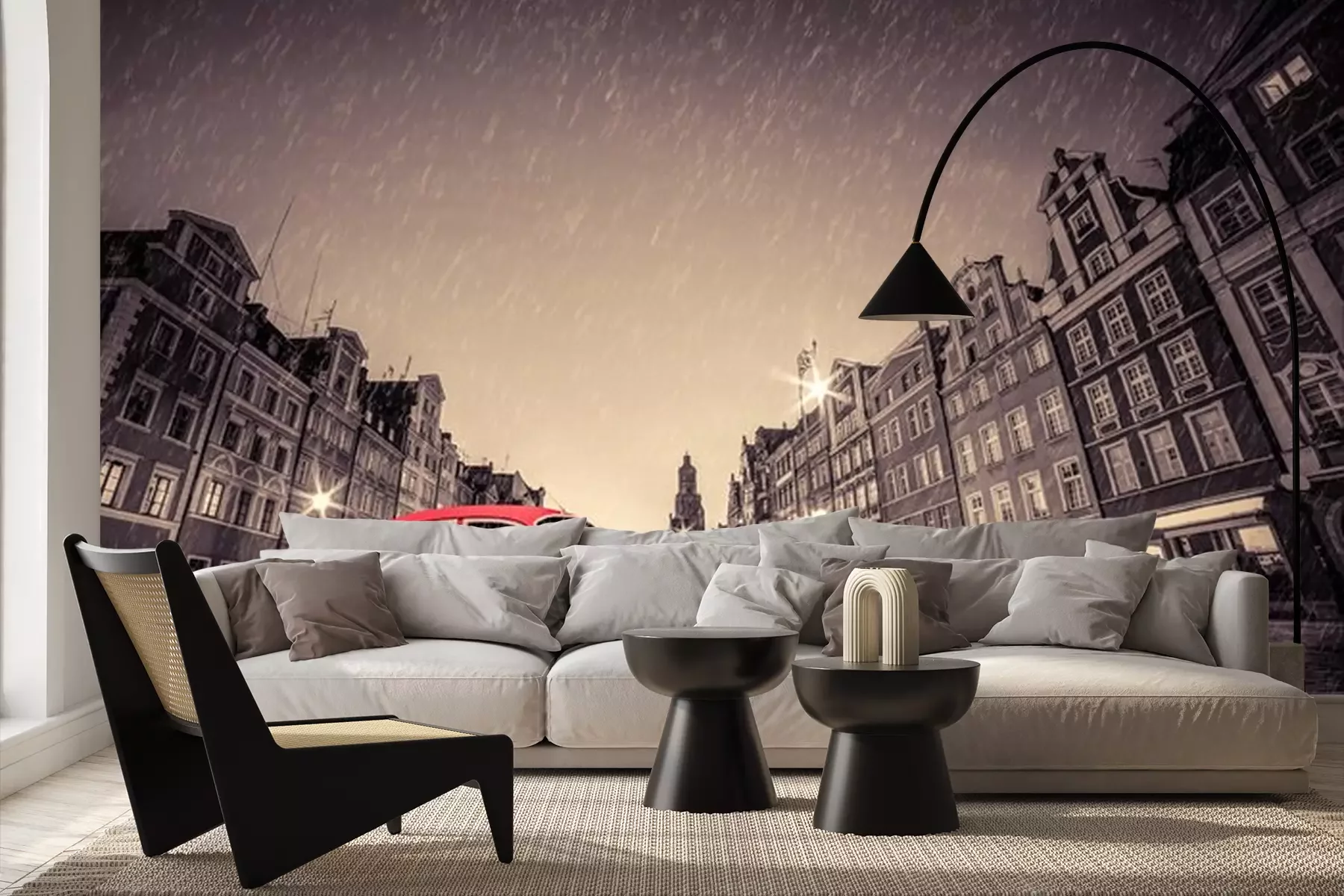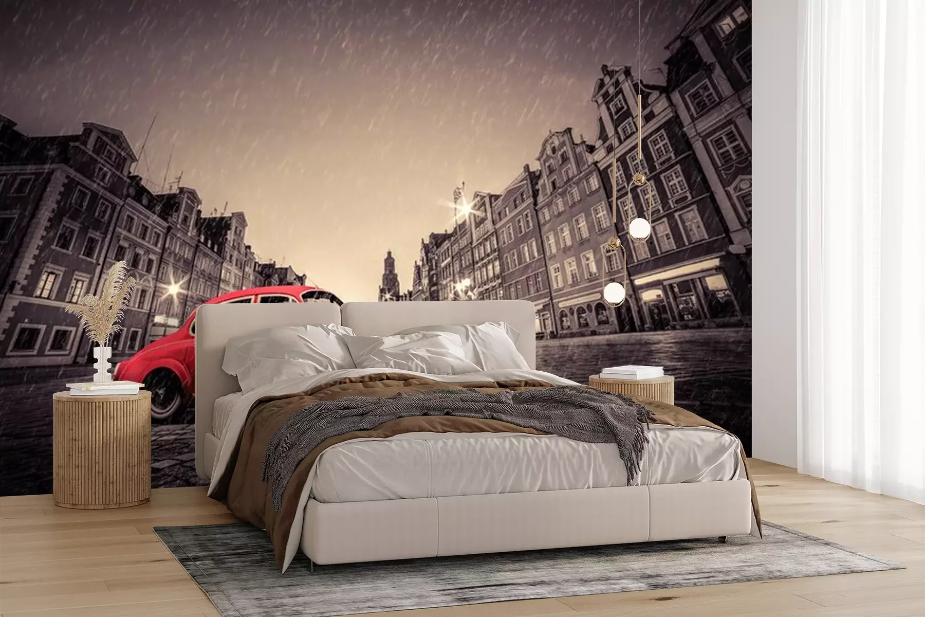 Sticker  Retro voiture rouge sur cobblestone vieille ville historique sous la pluie. Wroclaw, Pologne.
