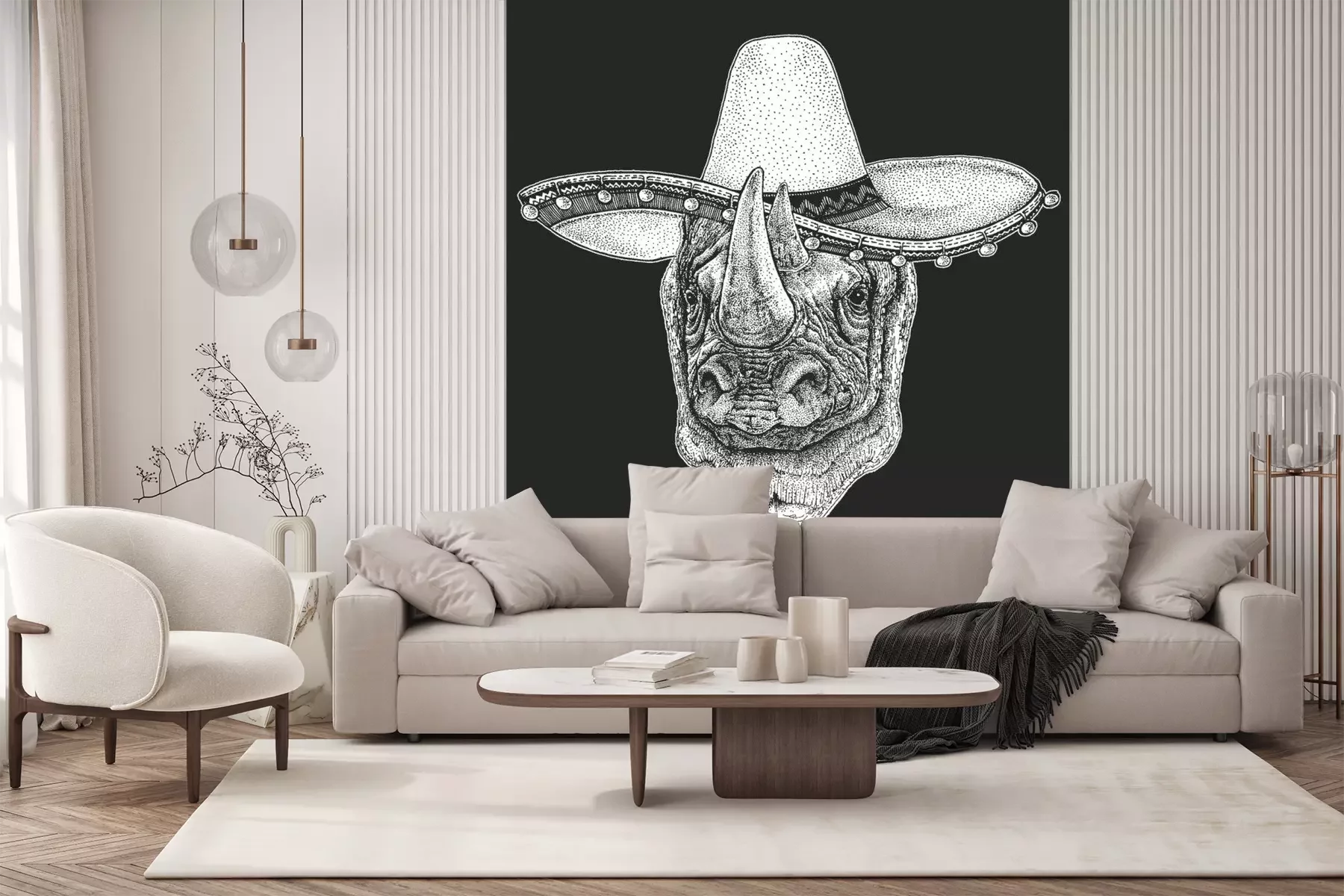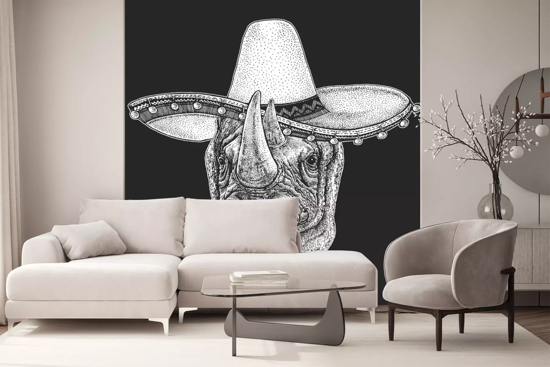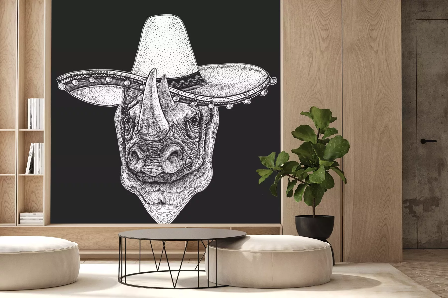 Sticker  Rhinoceros, rhino portrait. Sombrero is traditional mexican hat. Mexico. Head of wild animal.