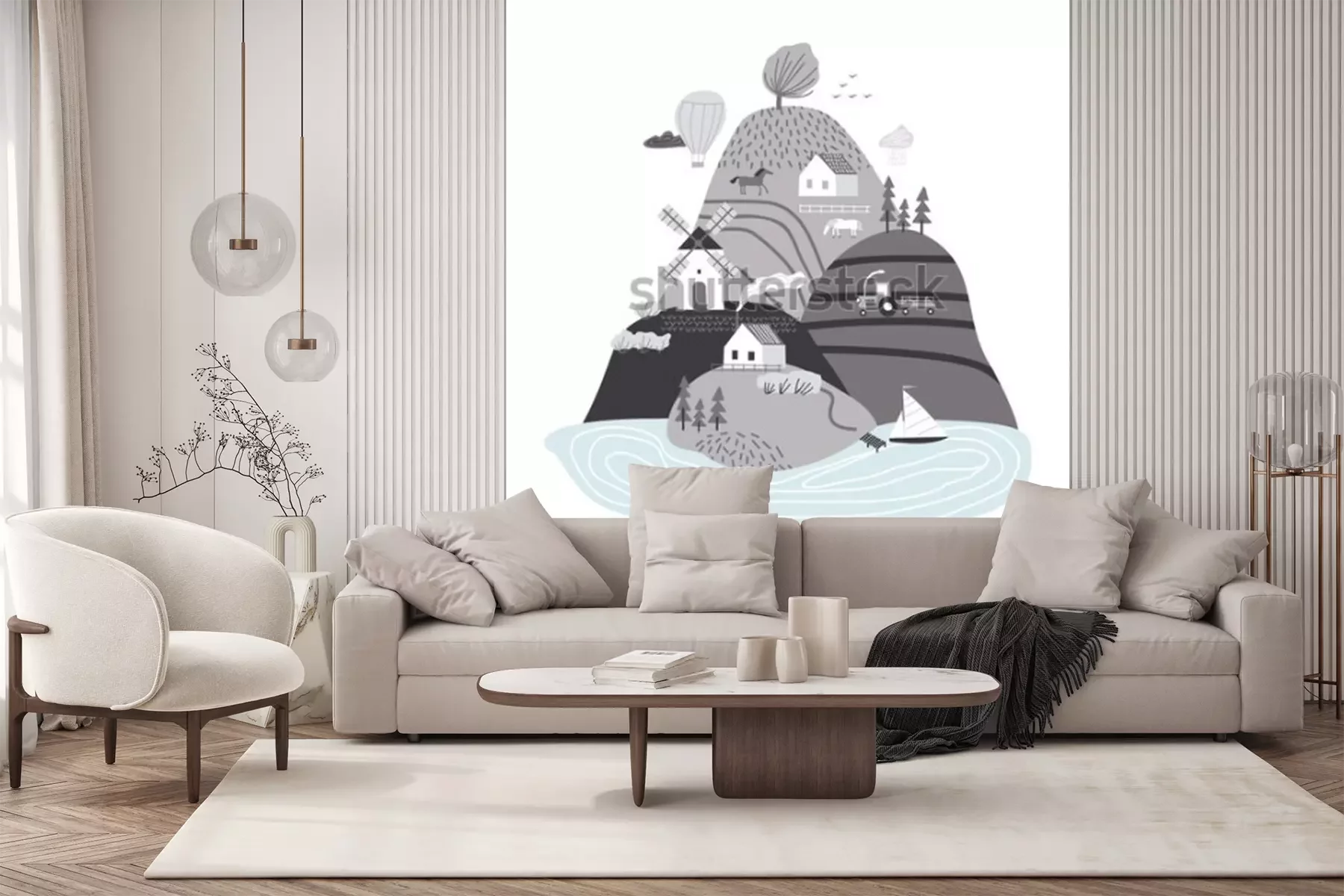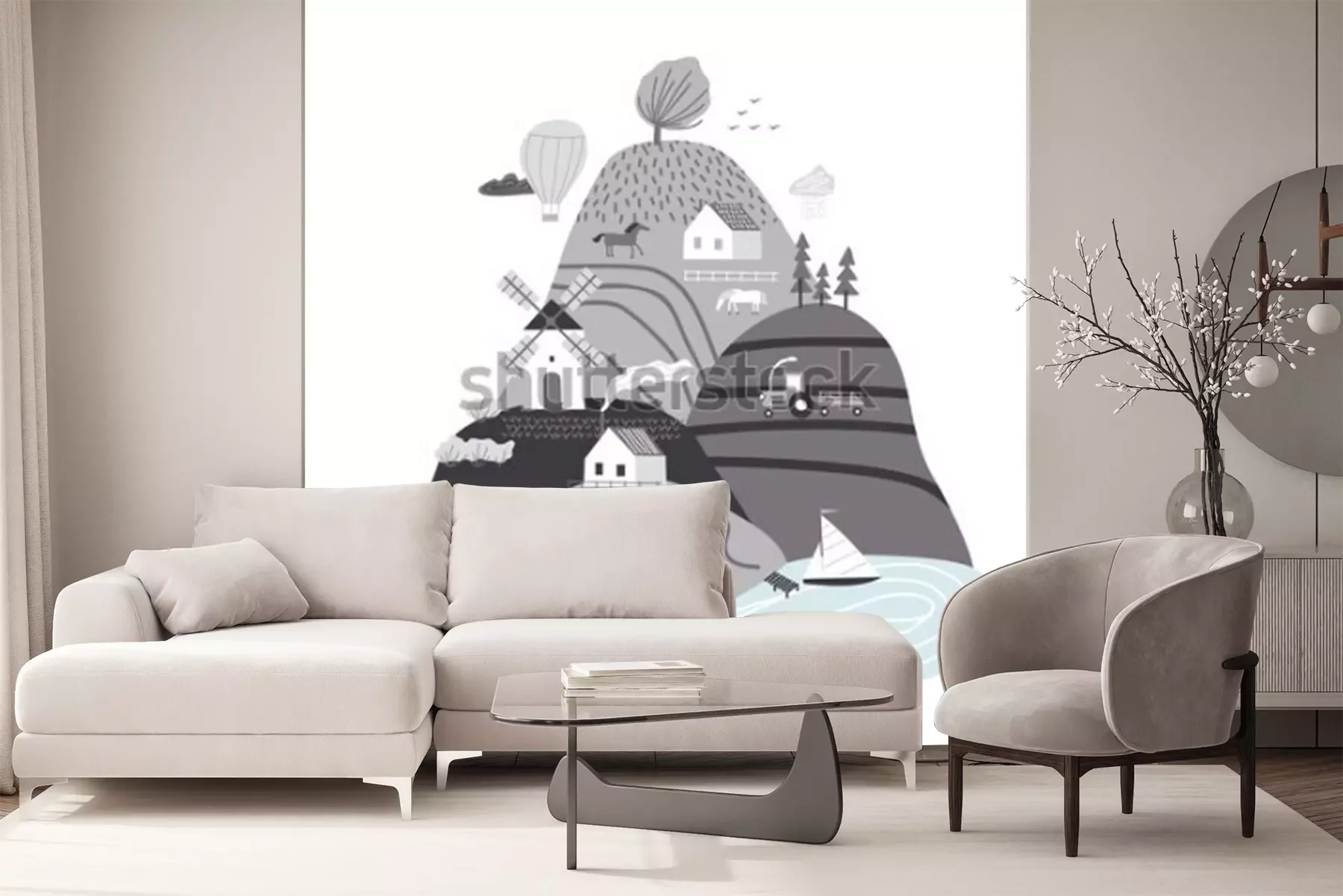 Sticker  Scandinavian landscape. Hand drawn vector abstract scandinavian graphic illustration with houses, trees and hills. Cute landscape.