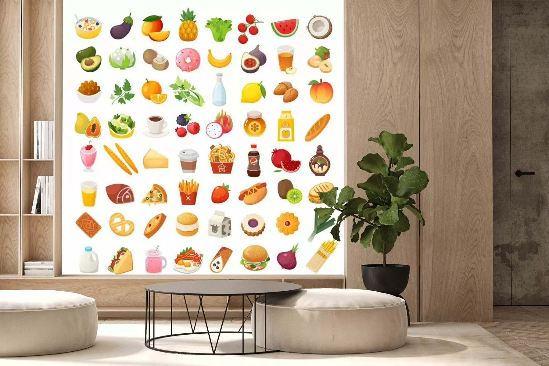 Sticker  Set of colorful food icons. Bakery, dairy food, fruit and vegetables. Desserts fast food and pasta images. Isolated vector cartoon icons on white background.
