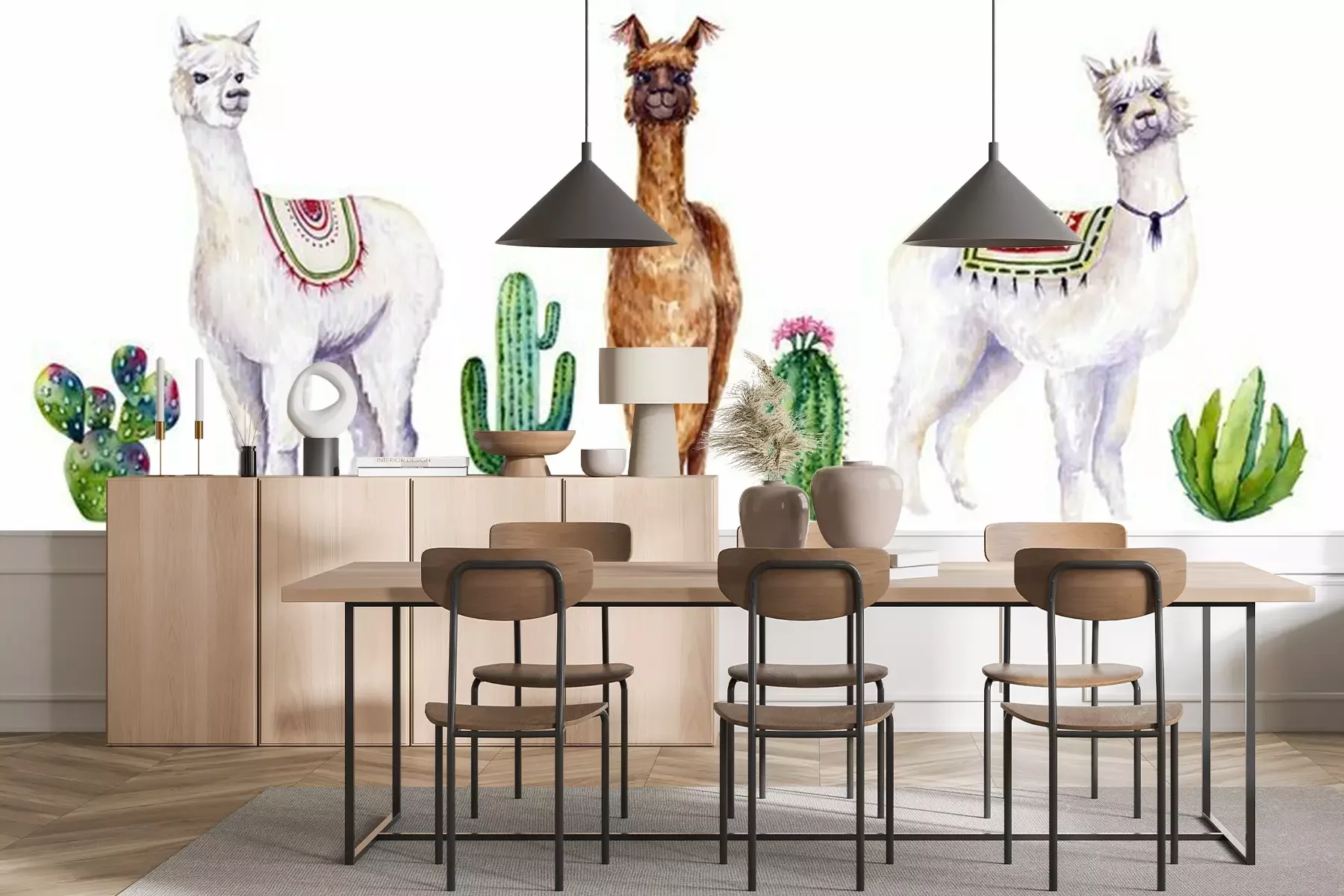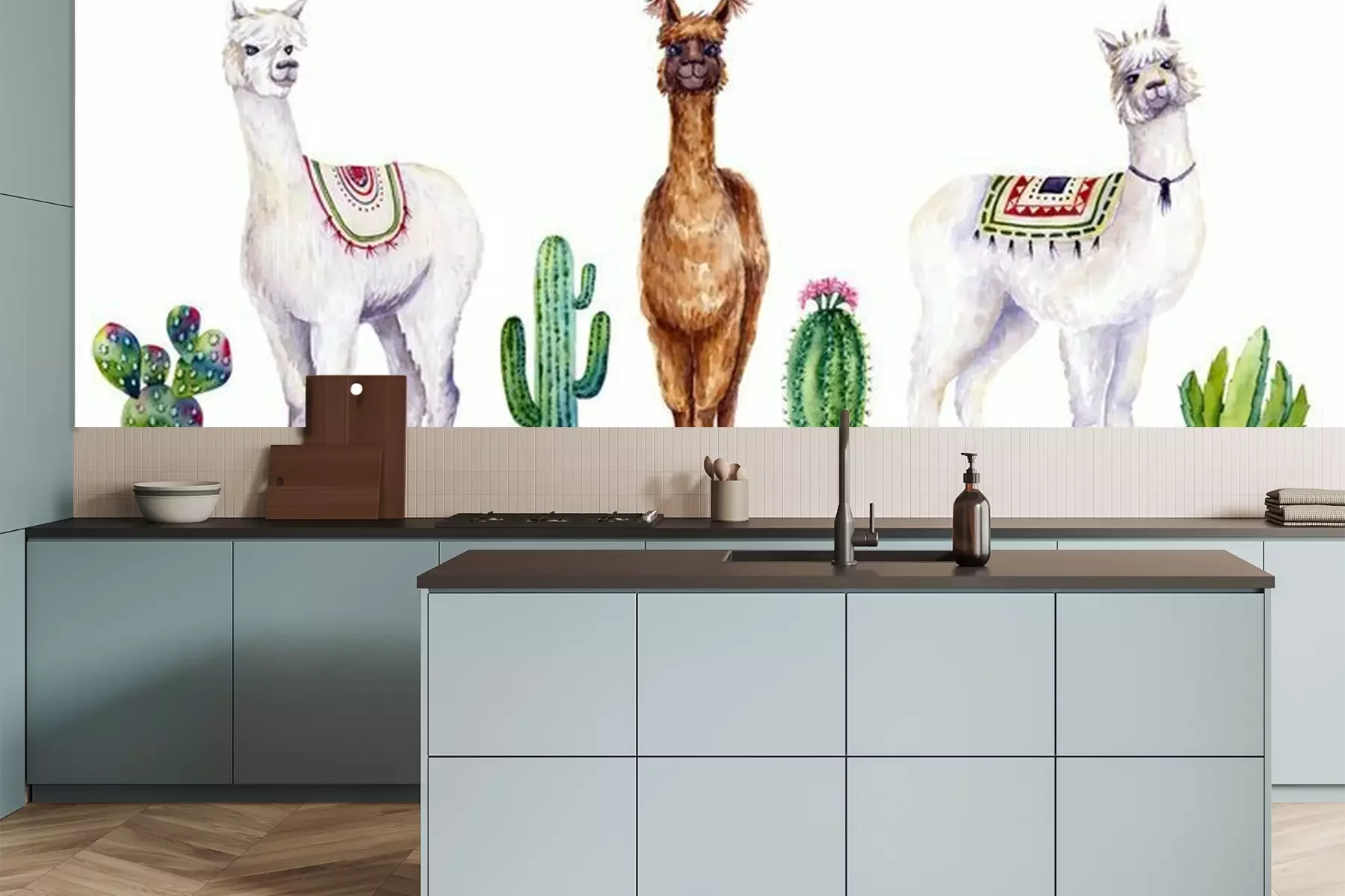 Sticker  Set of watercolor alpacas and cactus. Colorful illustration isolated on white. Hand painted animals and plants perfect for card making, wallpaper, fabric textile, interior design