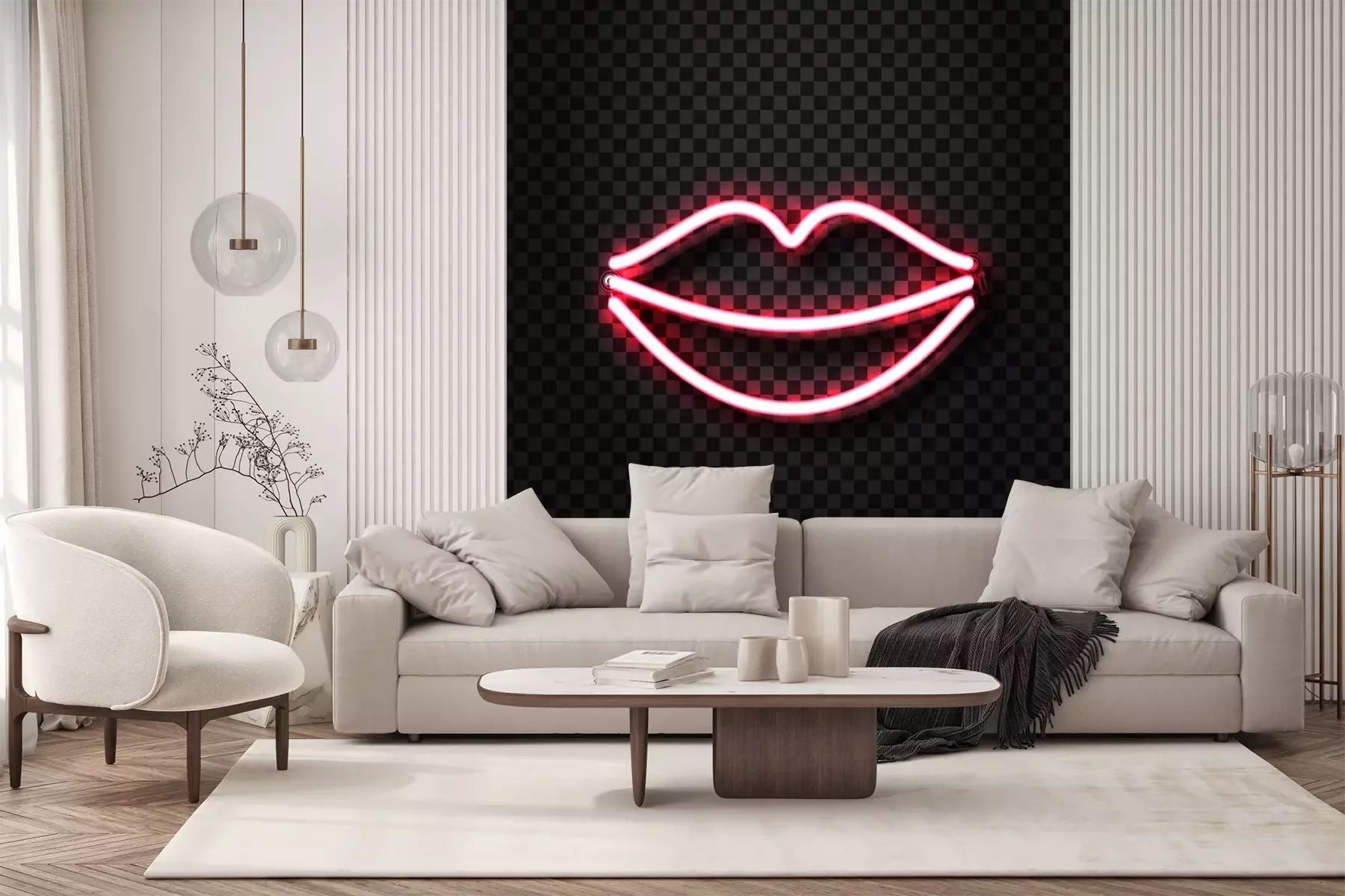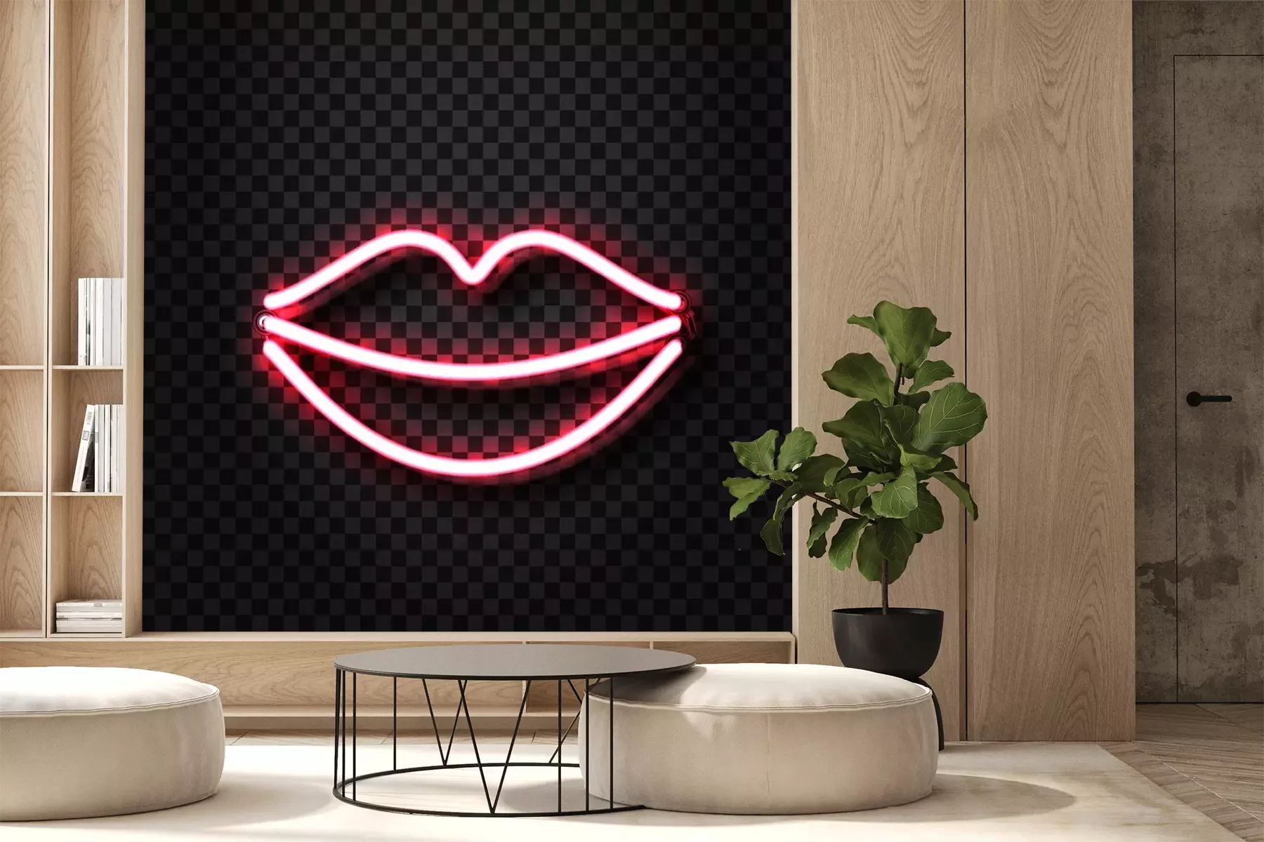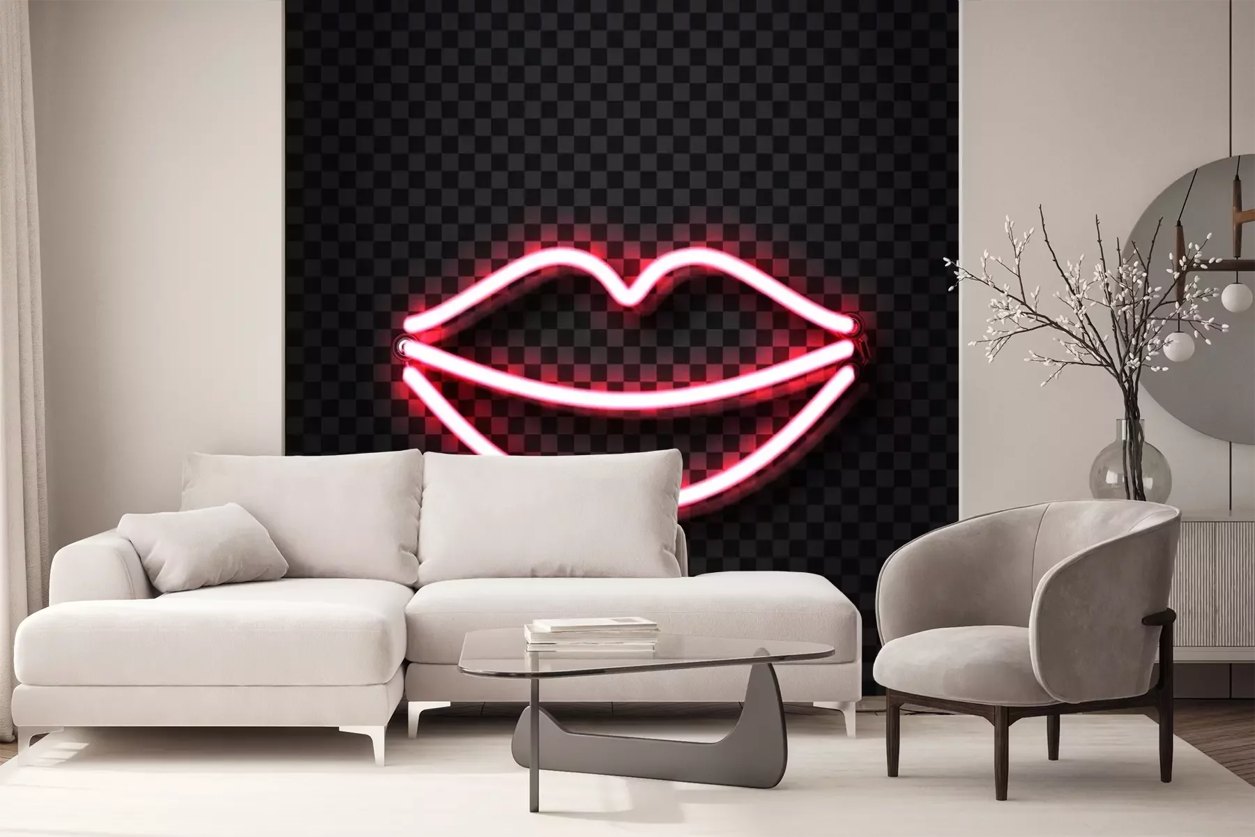 Sticker  Signe érotique réaliste vecteur néon érotique lèvres pour la décoration et la couverture sur le fond transparent. Concept de spectacle érotique et club de nuit.
