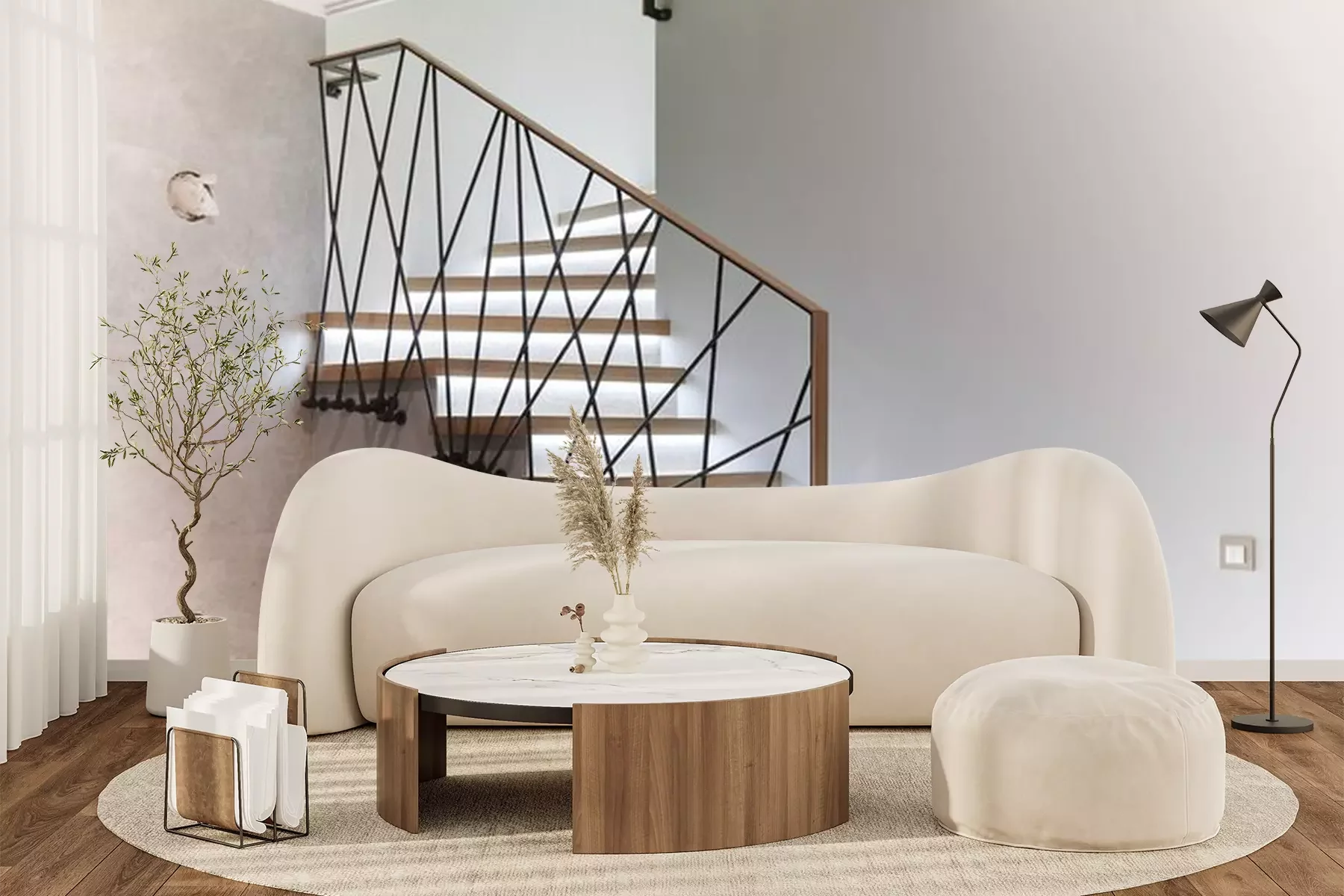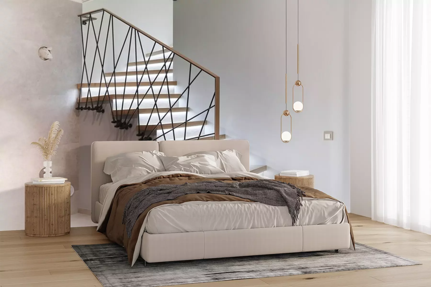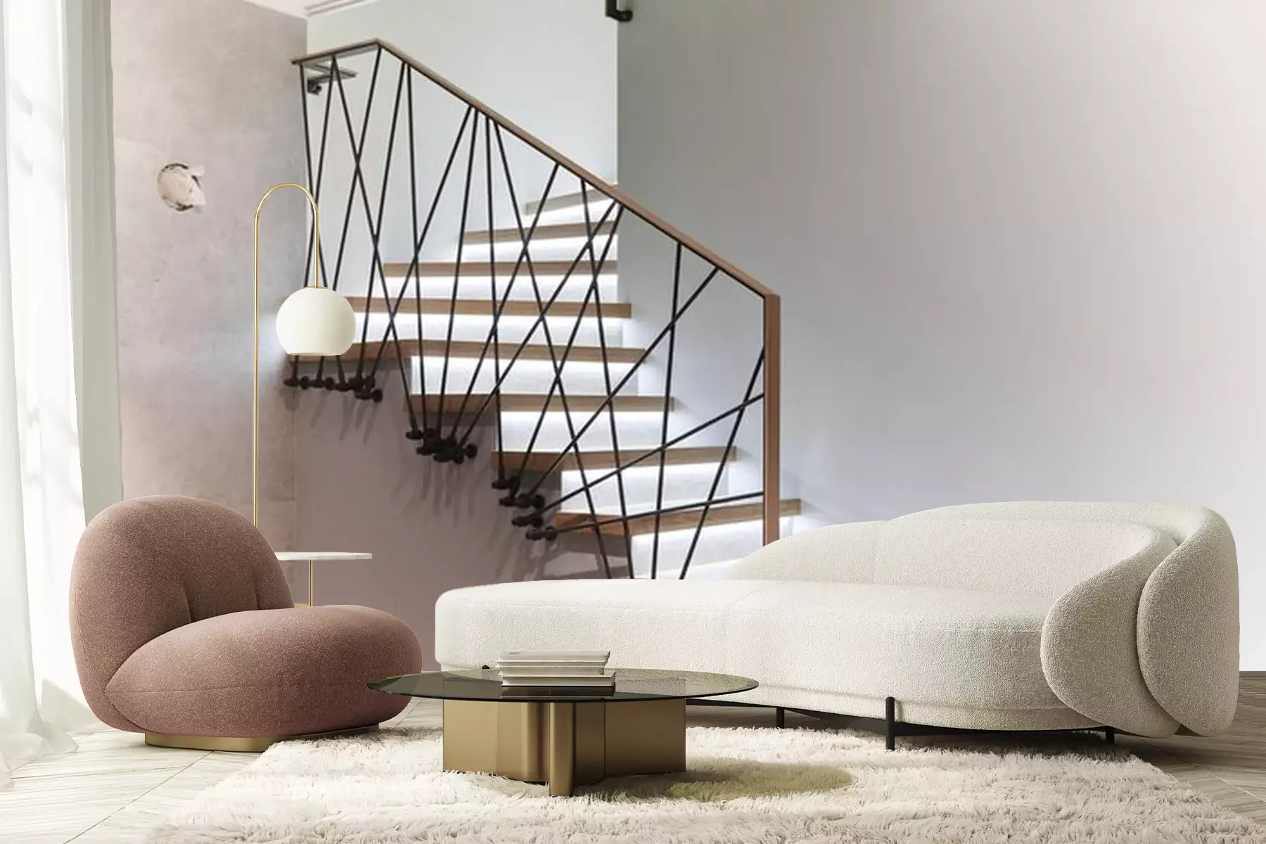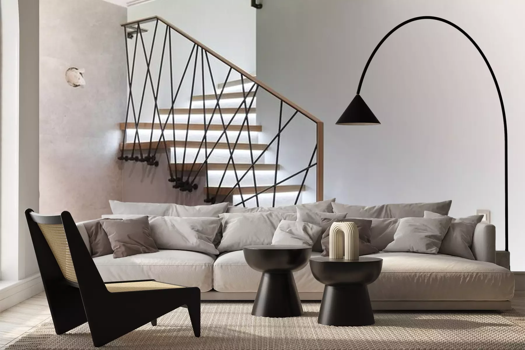 Sticker  Stairs to the top. Design stairs made of metal and wood. backed up. Metal railing in black