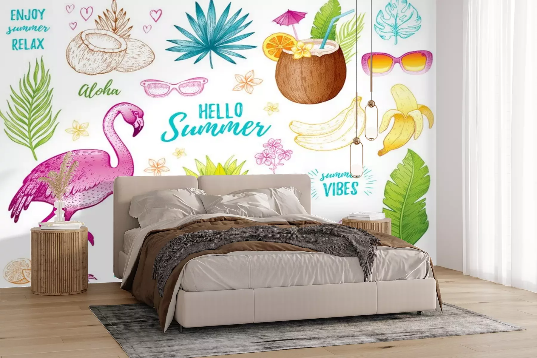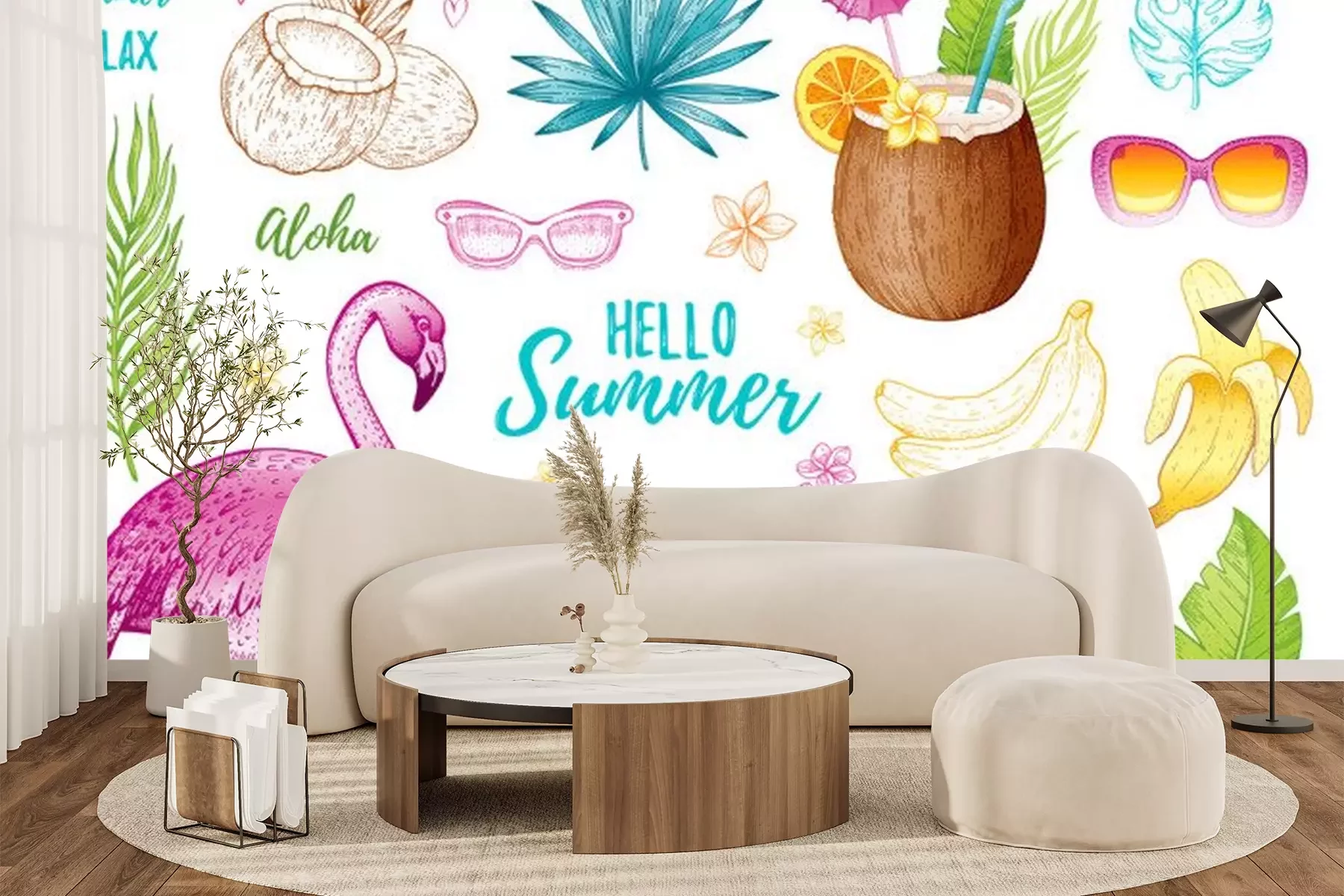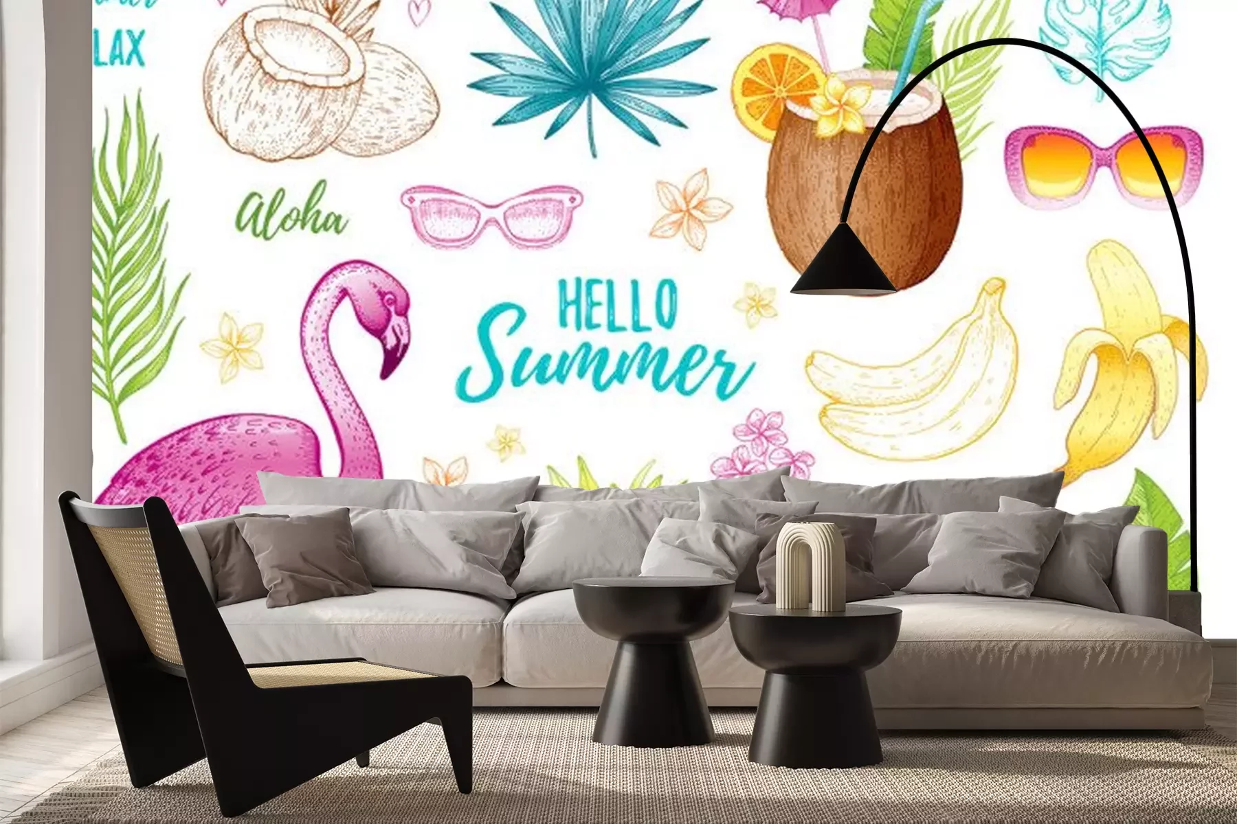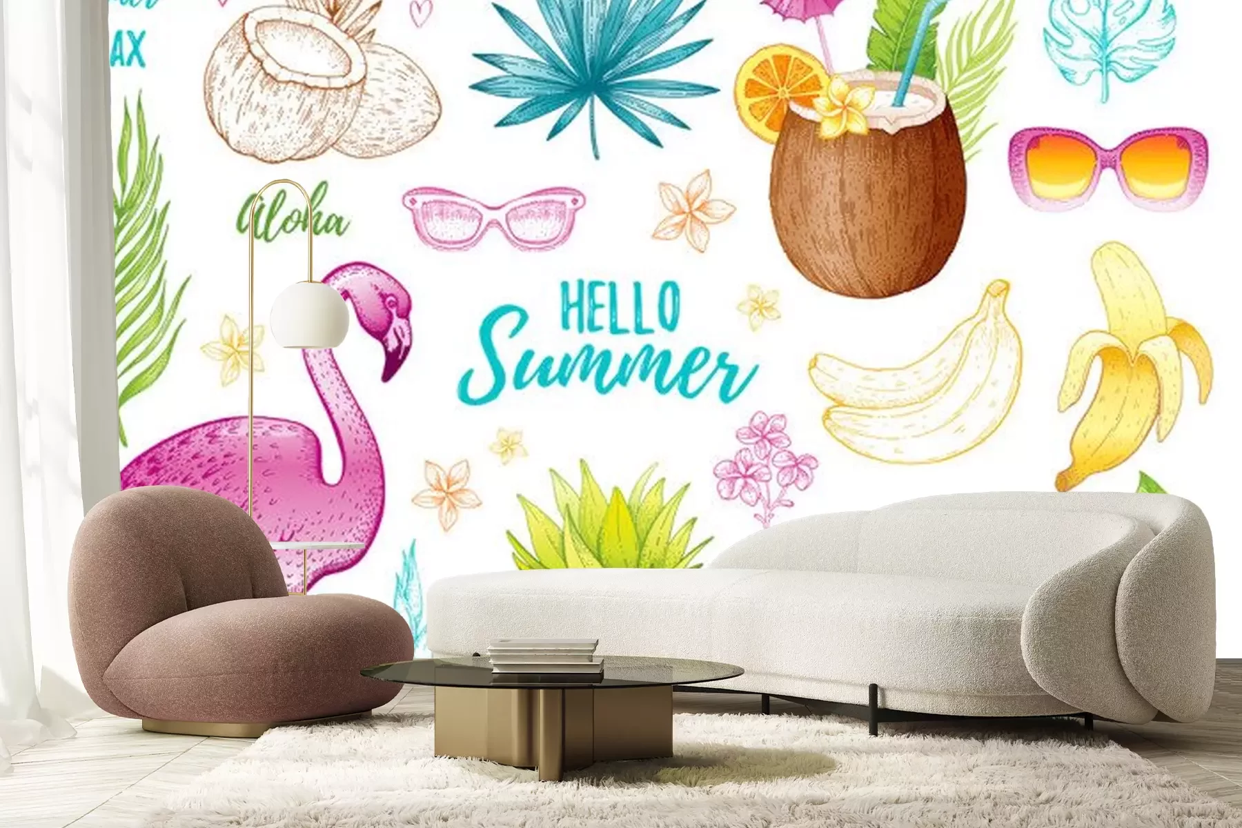 Sticker  Summer tropic sticker set for t-shirt print, logo design, print, ca. Vector flamingo, palm leaf, exotic fruit. Hand drawn vintage art. Cool doodle pineapple, watermelon, banana. White background