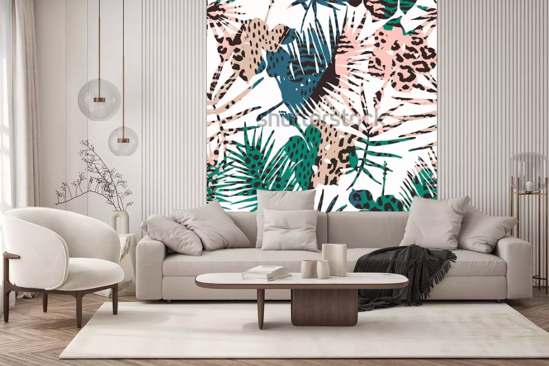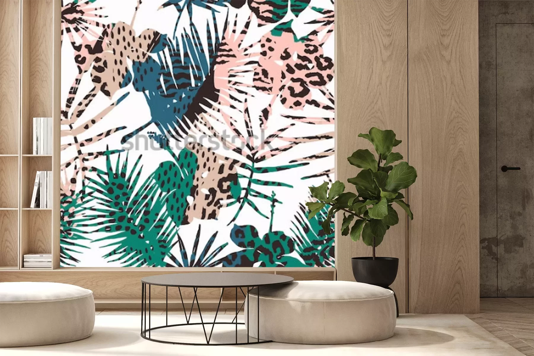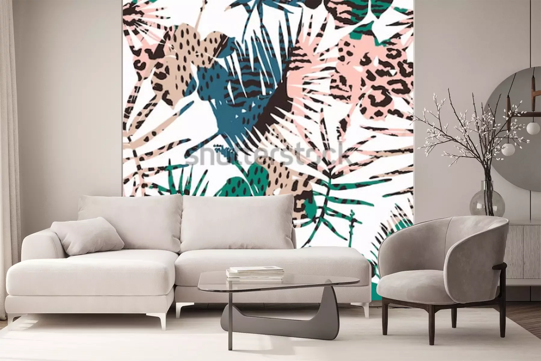 Sticker  Tendance motif exotique sans soudure avec paume, imprimés animaliers et textures dessinées à la main. Illustration vectorielle Design abstrait pour papier, papier peint, couverture, tissu, déc