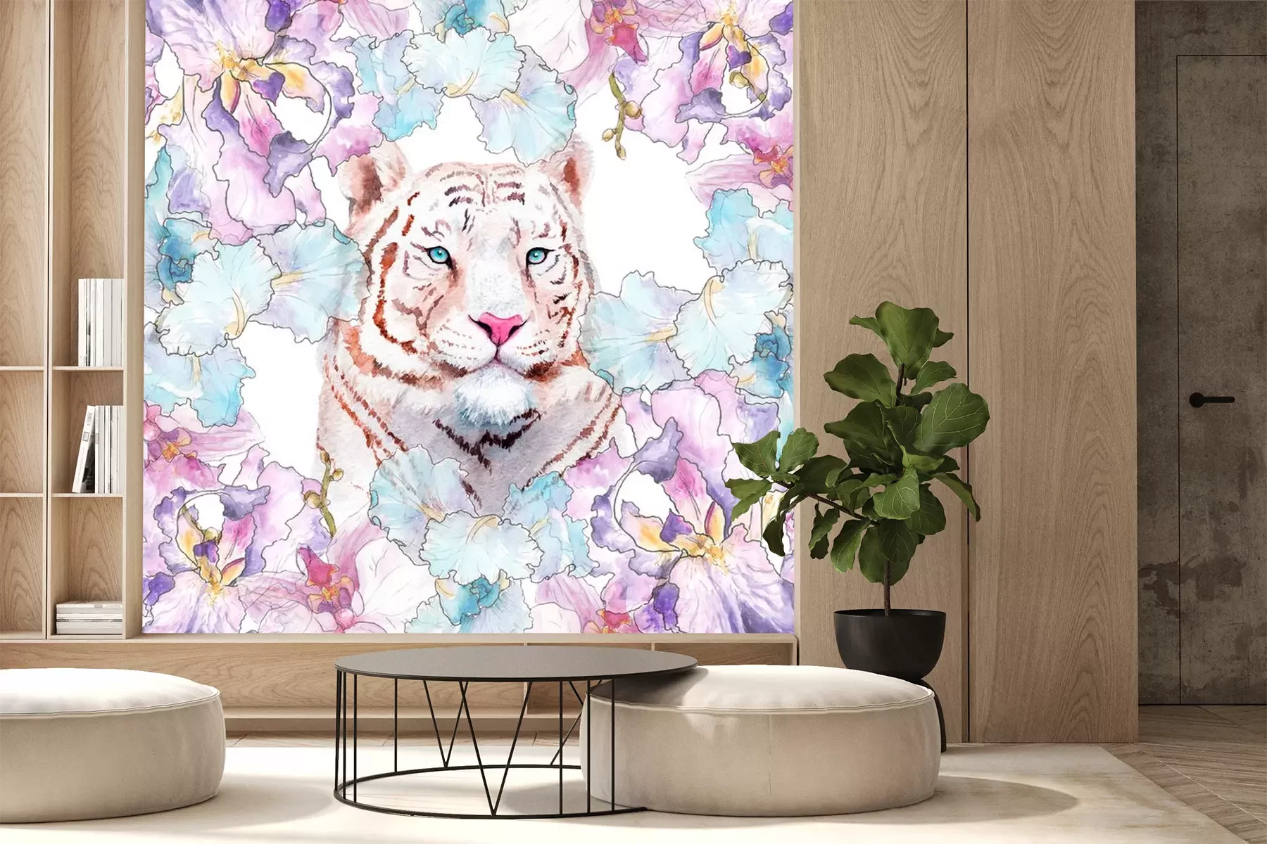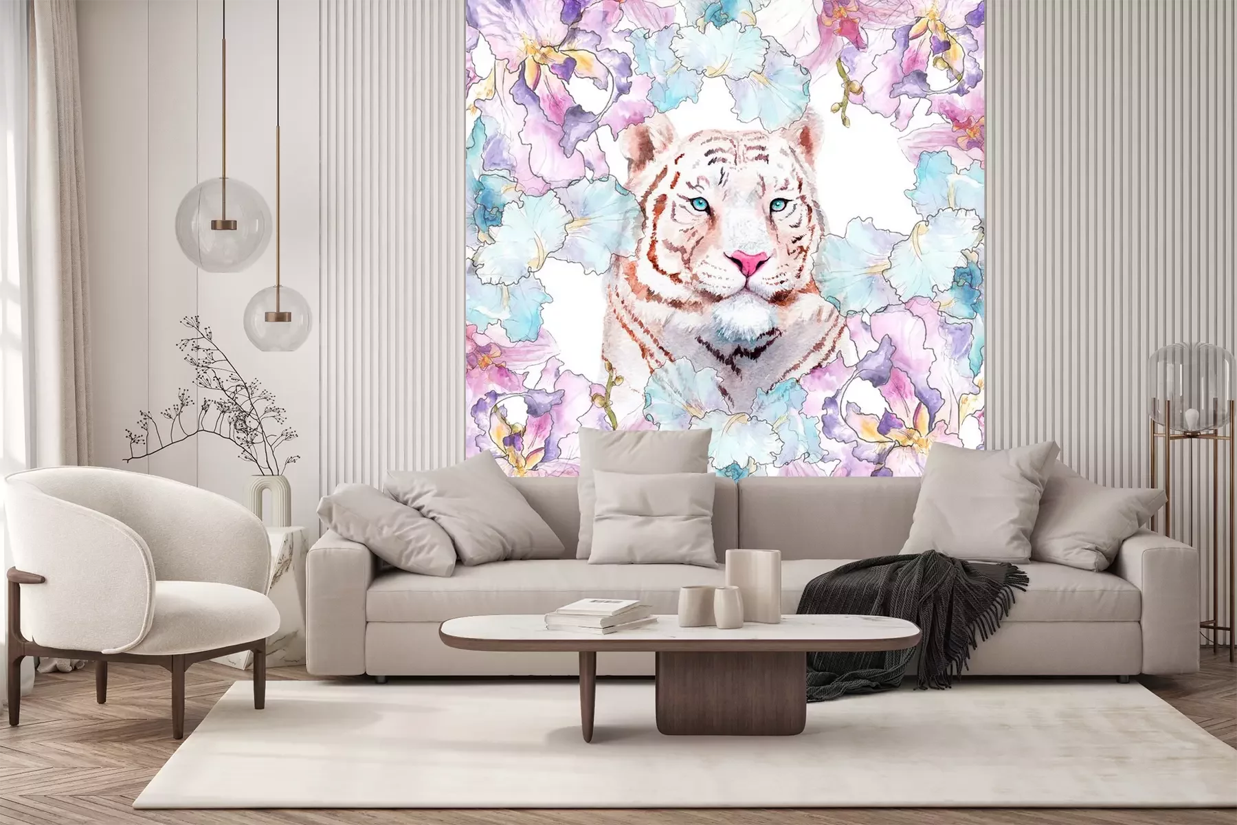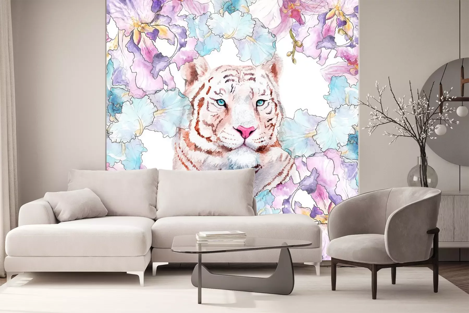 Sticker  Tigre blanc et fleurs pastel
