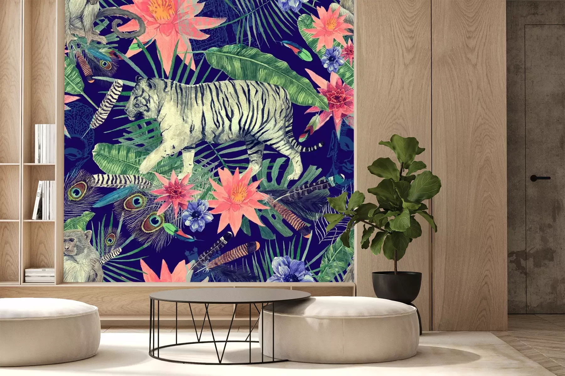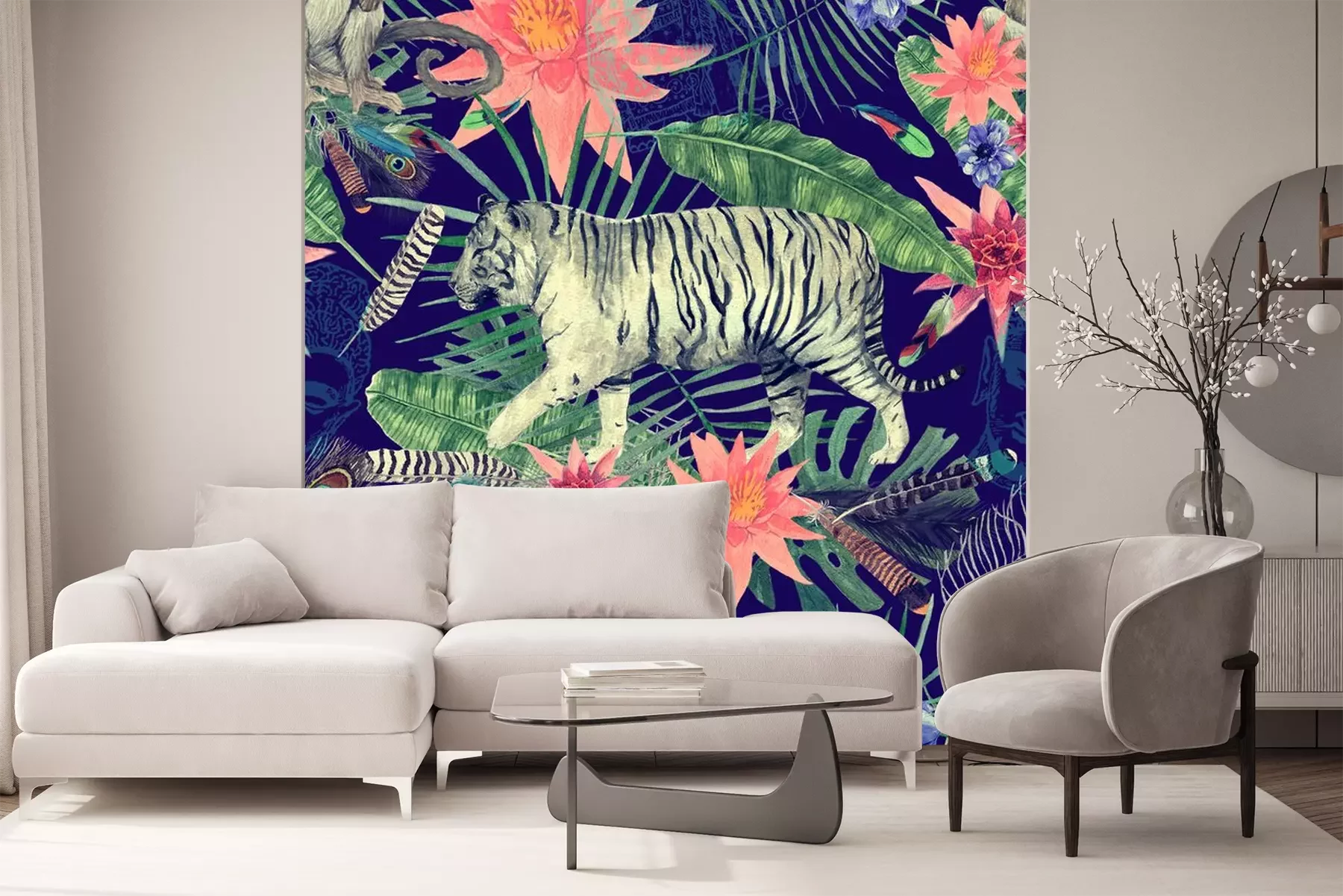 Sticker  Tigre et singes sur un fond de plantes exotiques