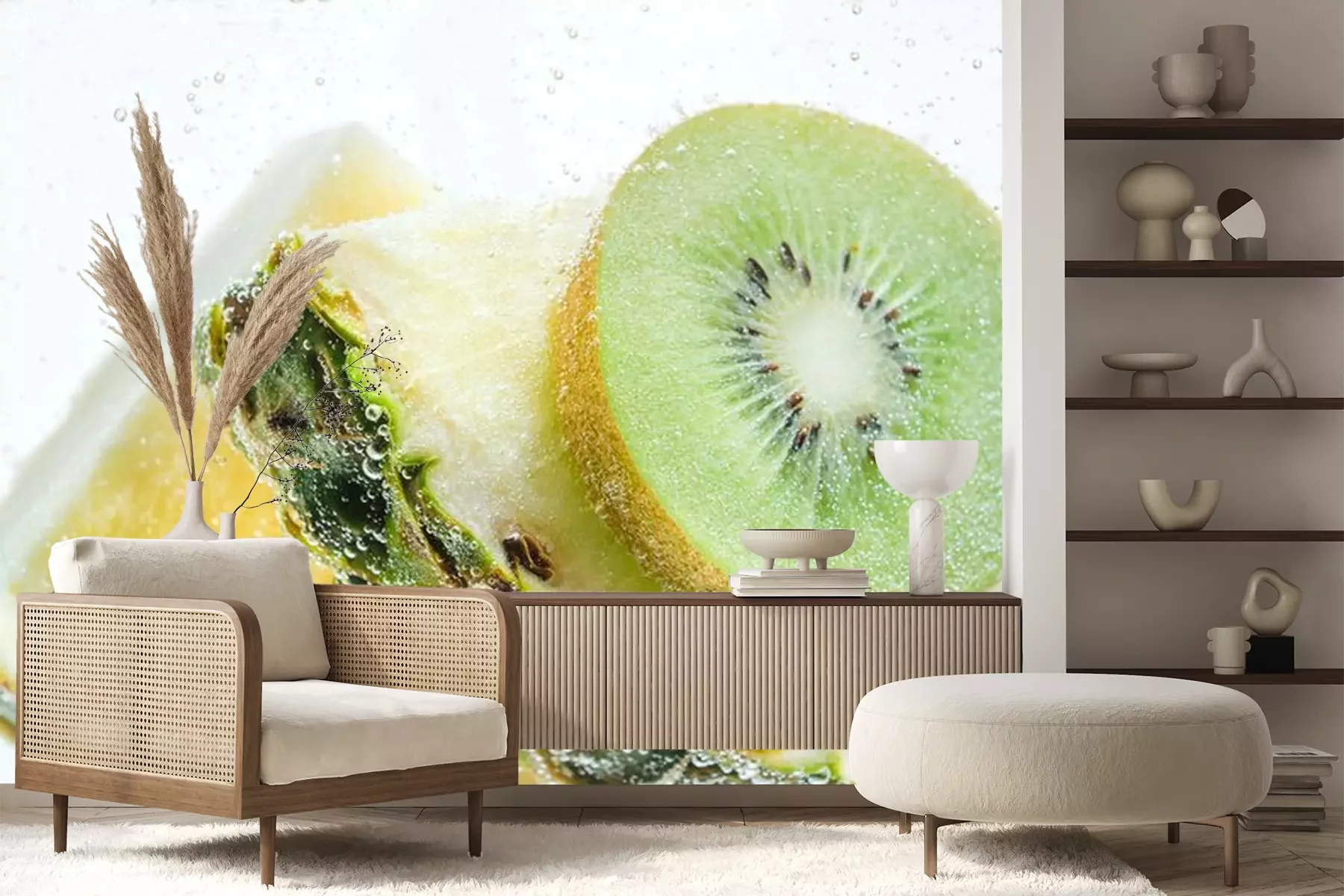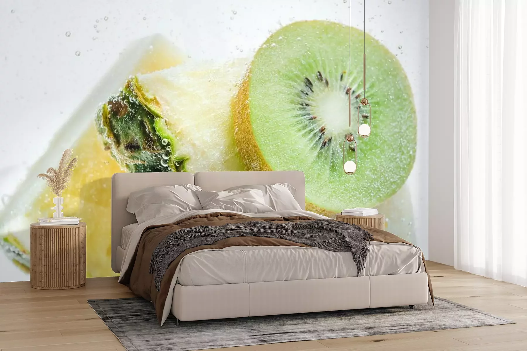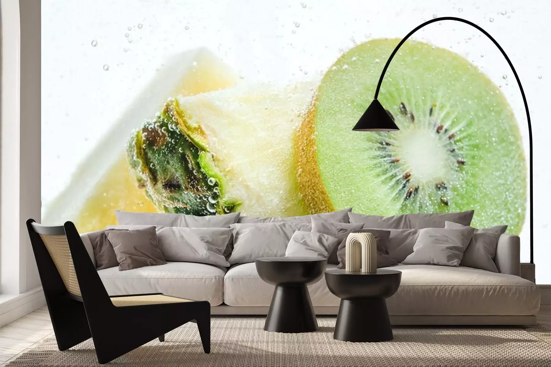 Sticker  Tranches d'ananas frais et de kiwi dans de l'eau claire et claire.