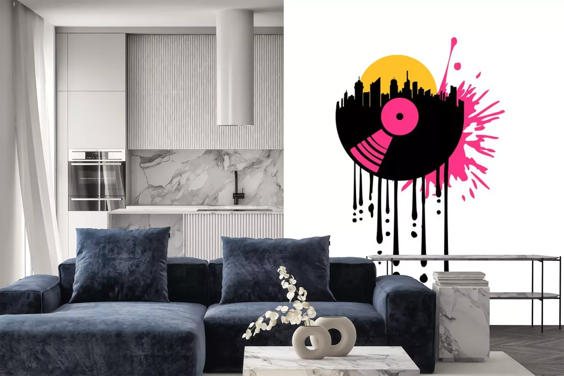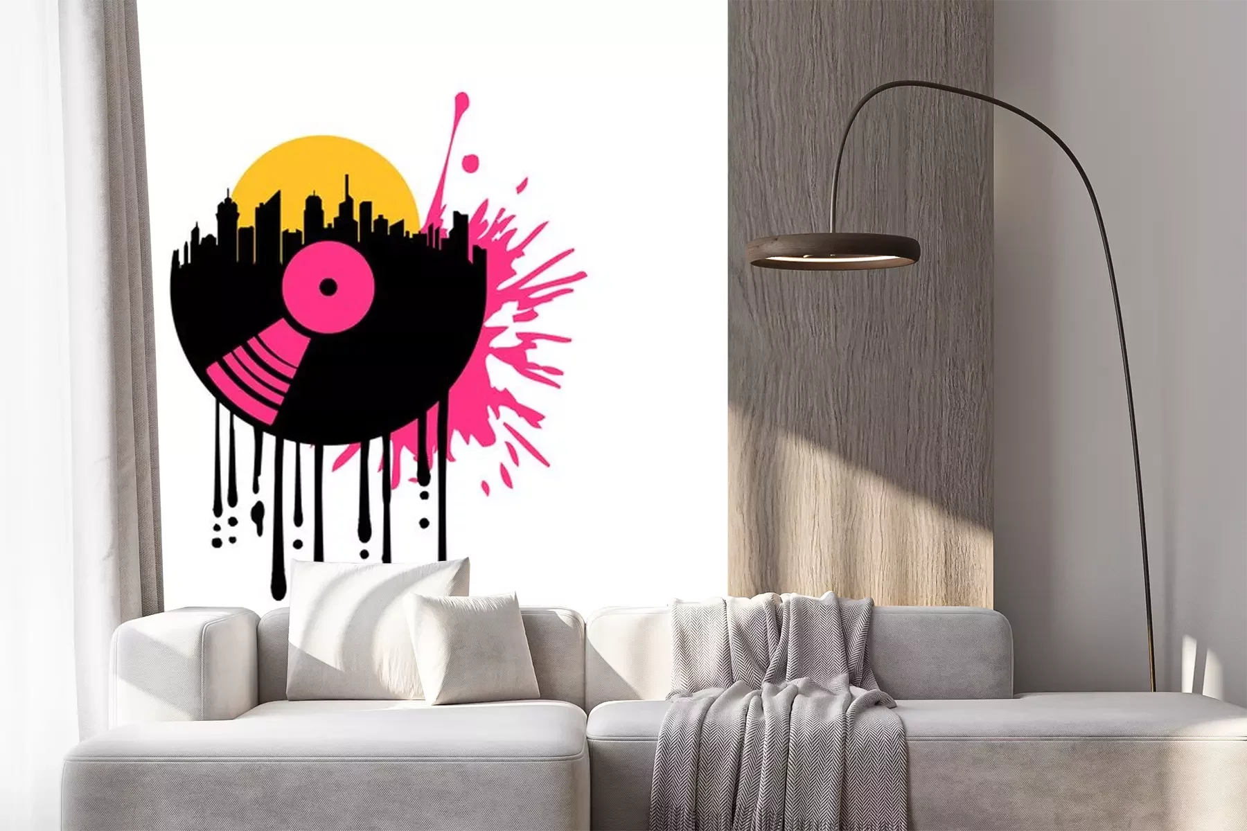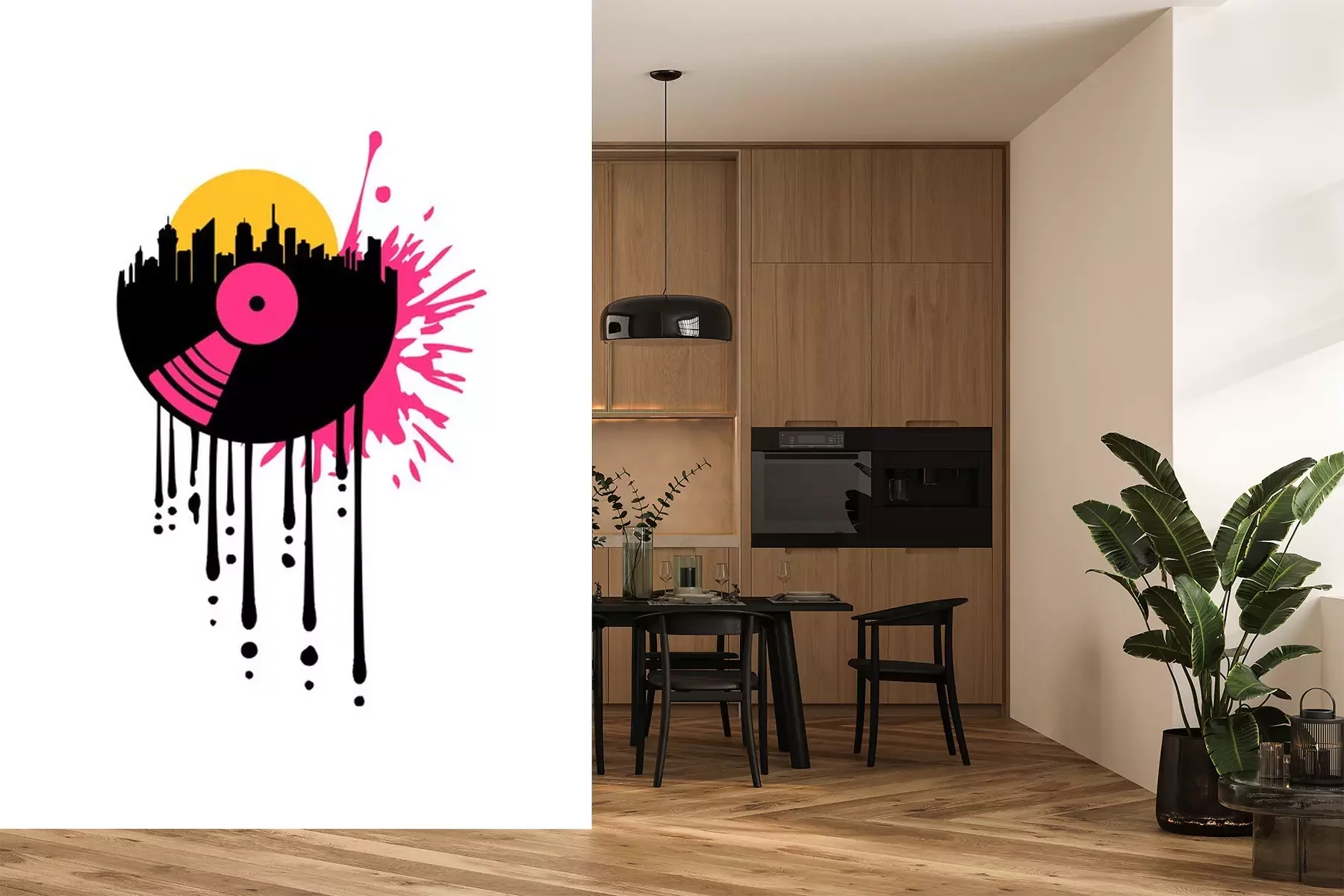 Sticker  tropfen graffiti spritzer sonne club vinyl stadt city silhouette wolkenkratzer hochhäuser großstadt musik party auflegen platte spielen tanzen disko mischpult cool logo design dj discjockey
