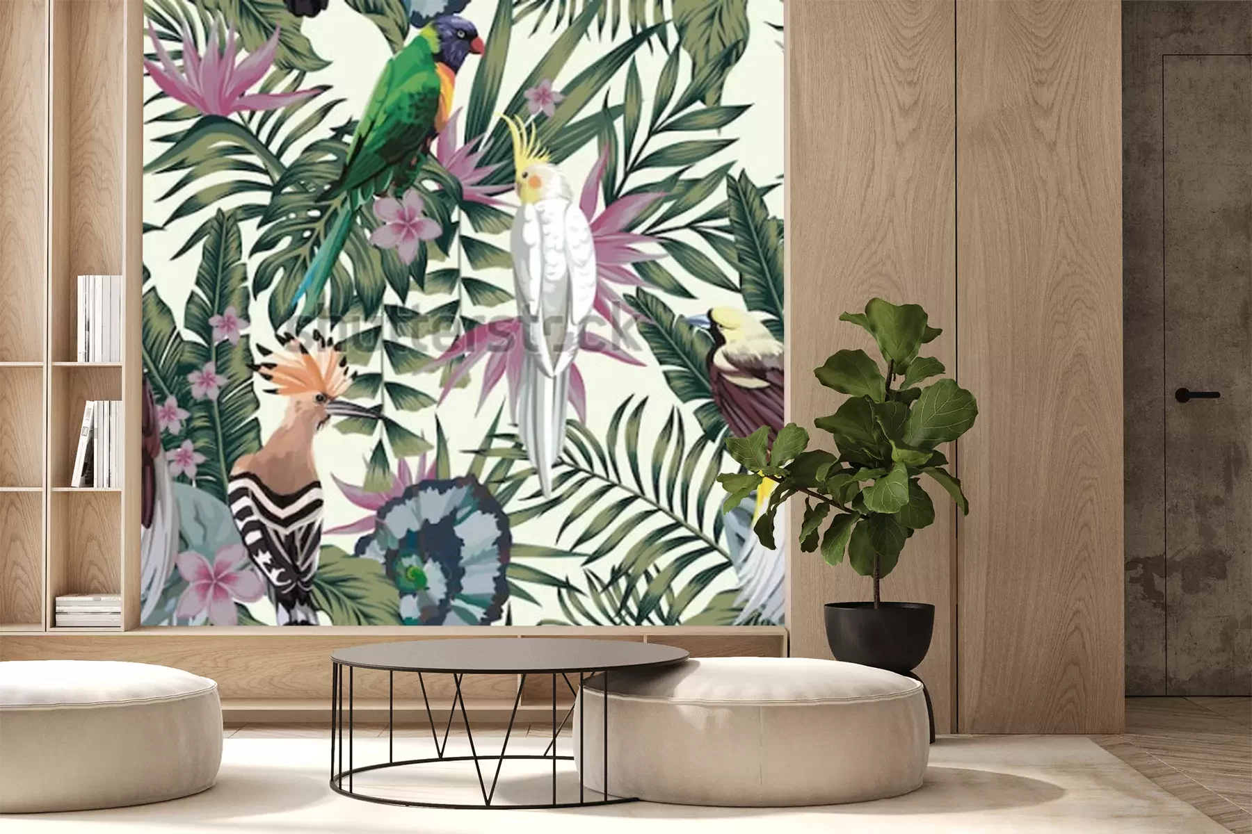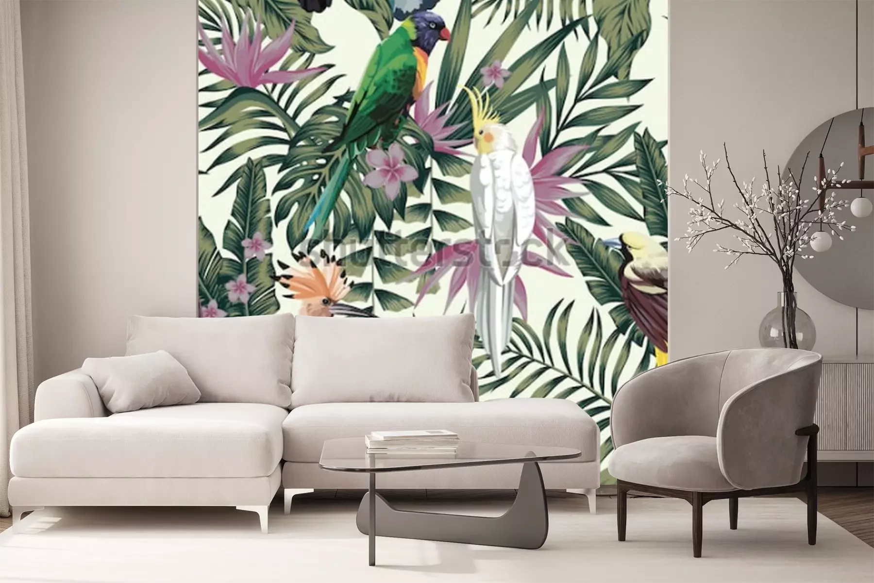 Sticker  Tropical birds parrot hoopoe, exotic jungle plants leaves flowers abstract pastel color seamless white background