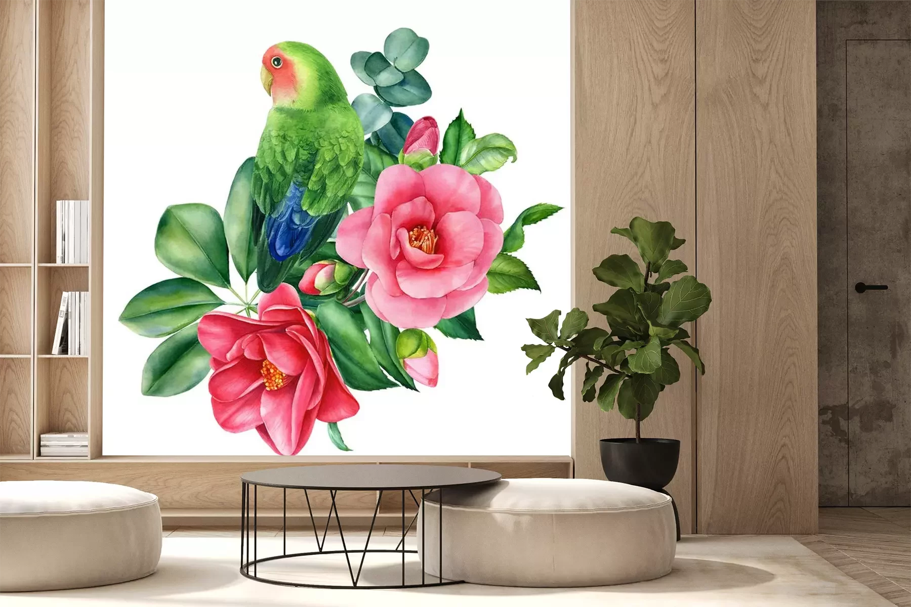Sticker  Tropical composition bouquet of flowers and parrots lovebirds on isolated white background, watercolor illustration