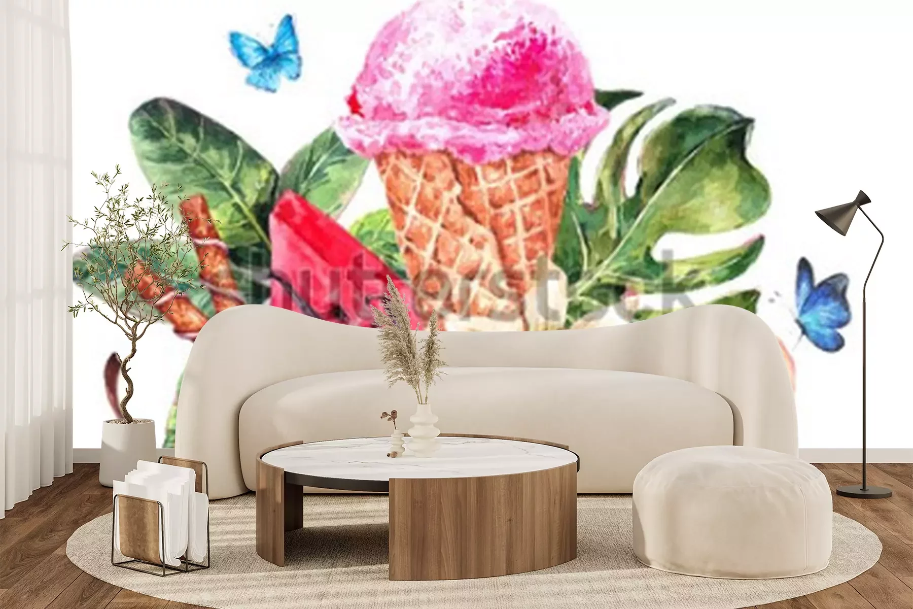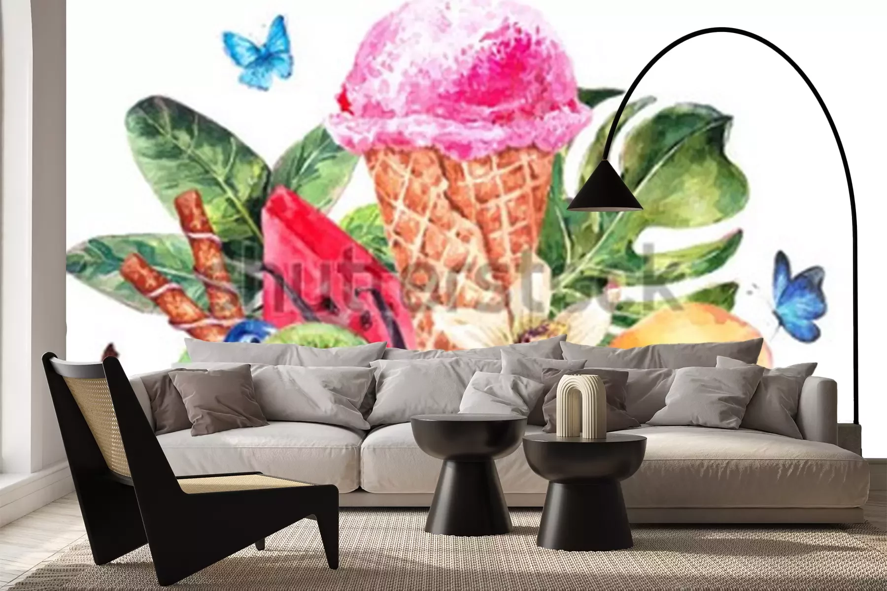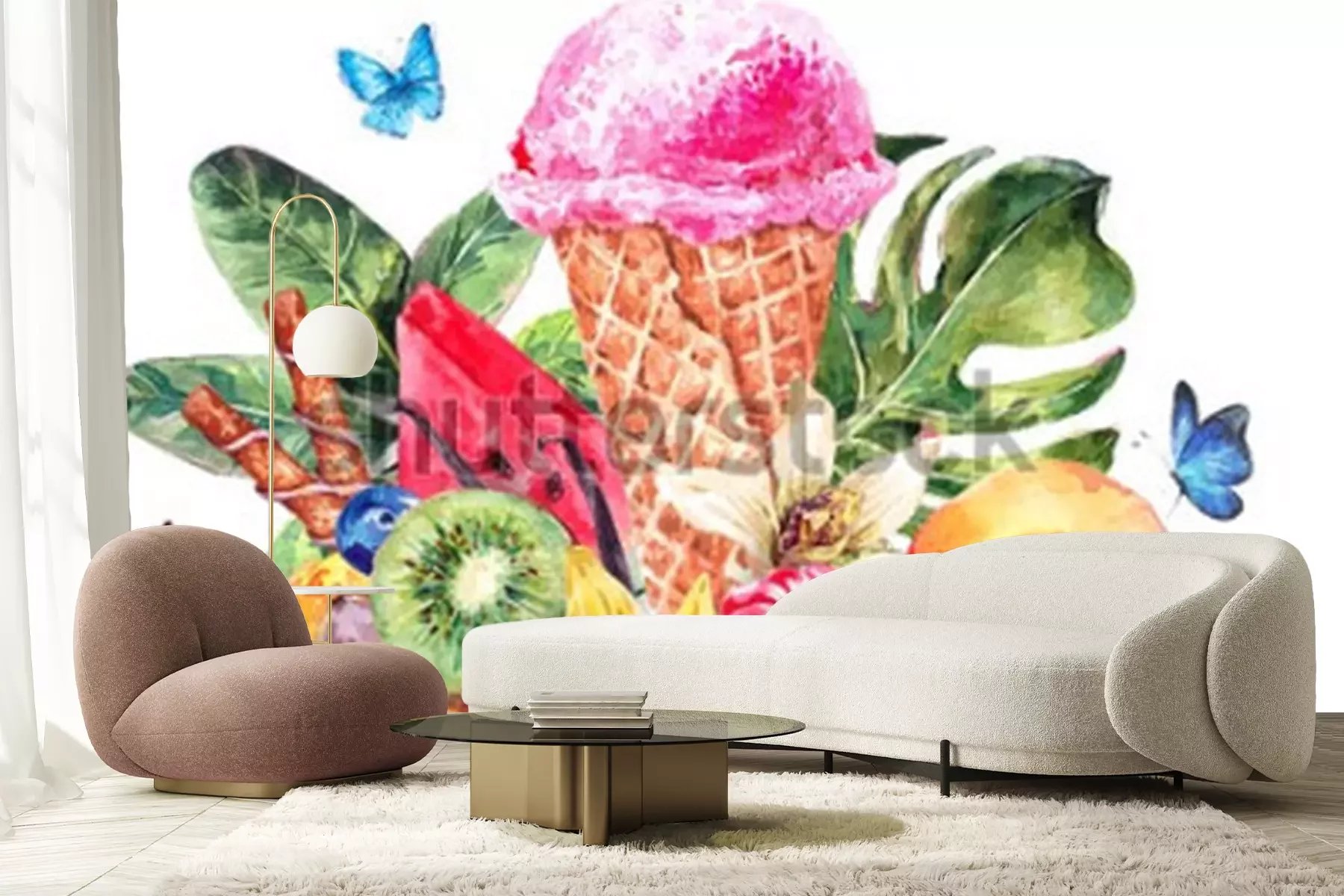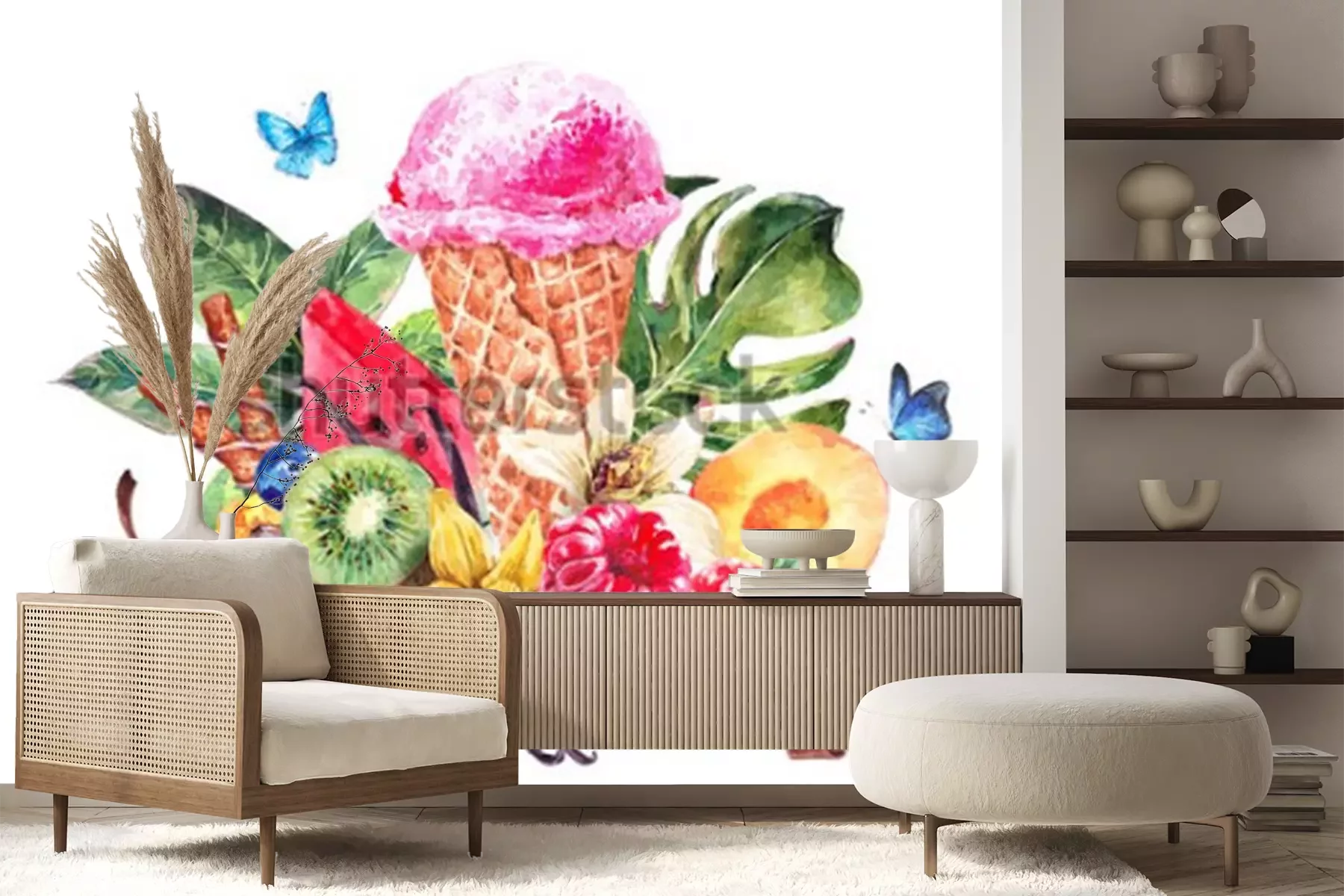 Sticker  Tropical hand painting summer watercolor natural eco food background with fruits, soft Italian fruit ice cream, summer nature exotic sale card